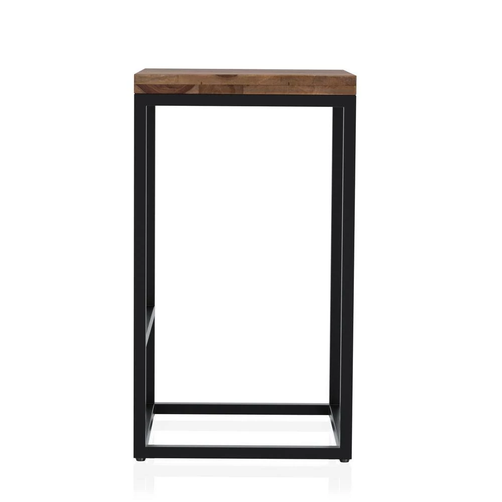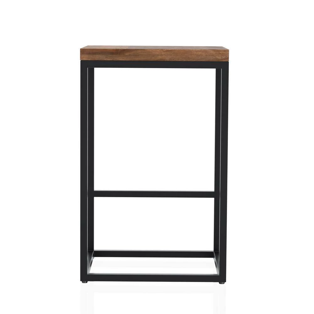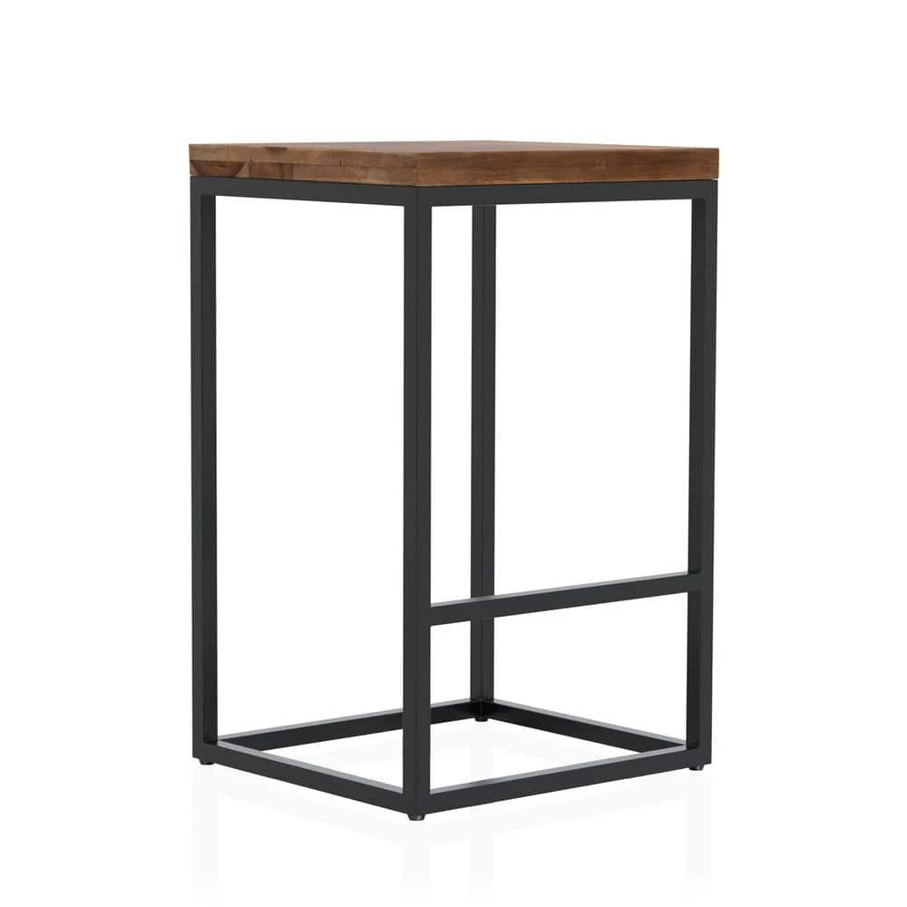 Straight lines and precise angles add a sense of modern minimalism to this rustic natural oak barstool. A backless design, it boasts a seat crafted from solid wood and sheesham resting atop a metal base. A built-in footrest adds function and comfort while the flat seat and contained silhouette make the stool an easy one to tuck away underneath a table or countertop.