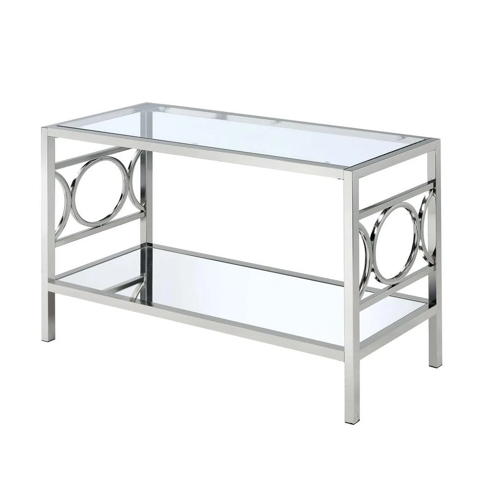 With the gorgeous gleam of a metal base and the classic elegance of an 8mm tempered glass and beveled glass top, this contemporary metal console table makes any living space look a bit more upscale. Graceful, circular accents on the sides and a mirrored lower shelf bring a glamorous vibe to its design. This gorgeous, rectangular table is available in your choice of chrome or champagne finishes.