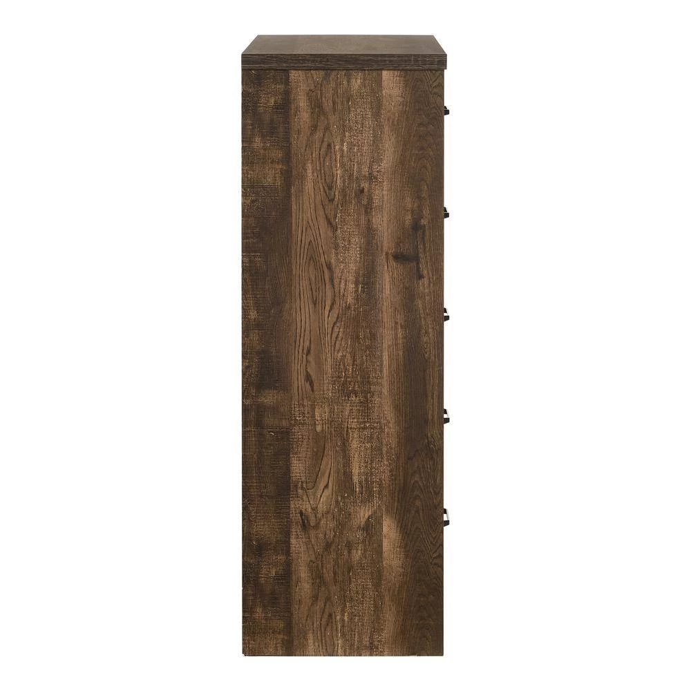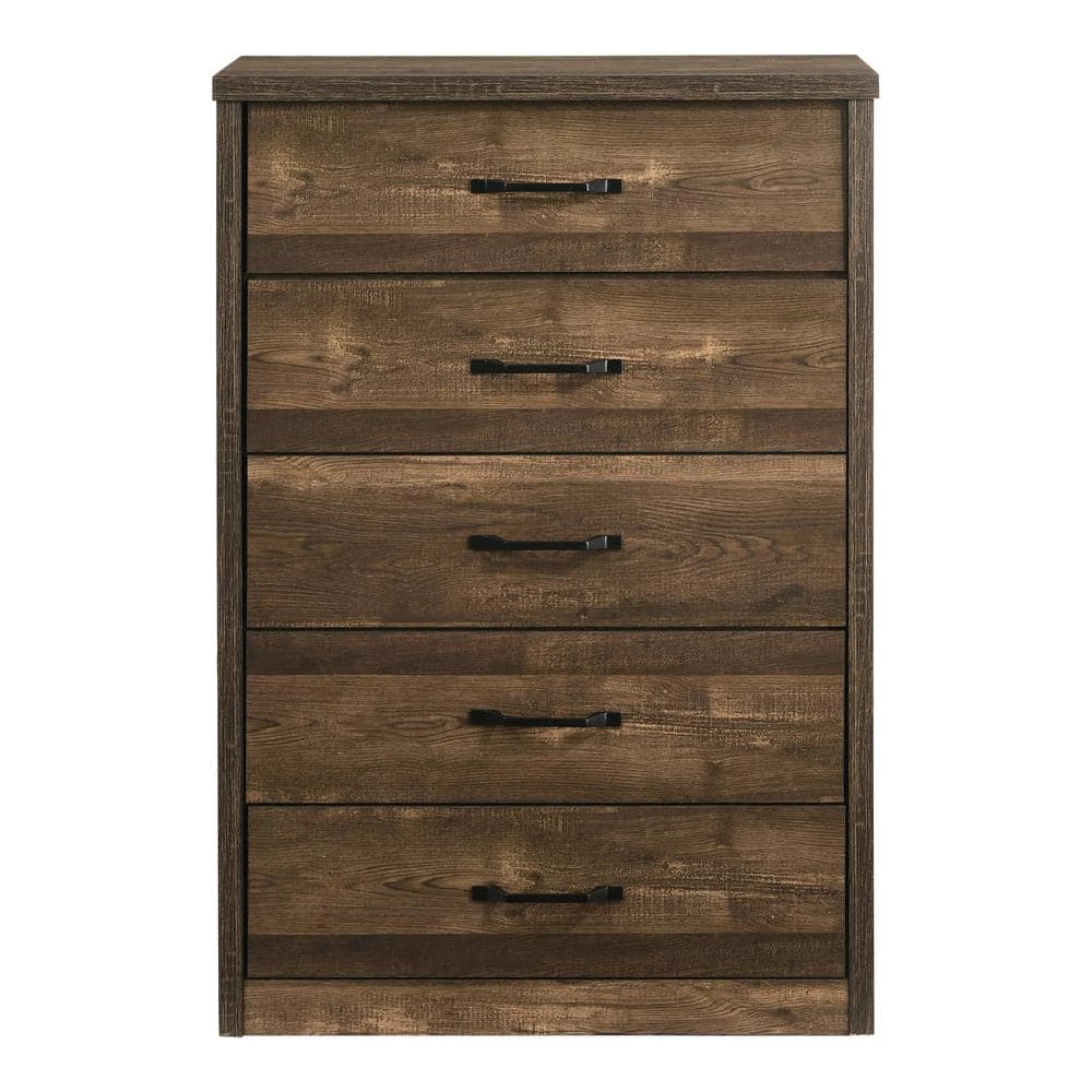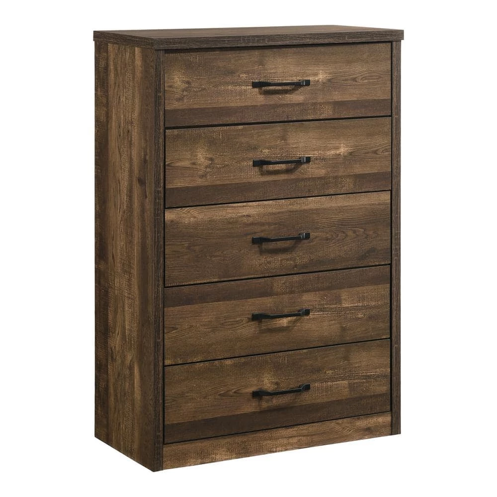 Embrace simplicity with the ample storage and clean silhouette of this five-drawer chest. Perfect for bedroom storage, it features a warm walnut wood finish complete with engaging wood grain details that bring rustic charm to your space. Five drawers are finished with black metal bar pulls, adding a hint of contrast. A compact footprint makes this chest a perfect choice for a small bedroom or living space.