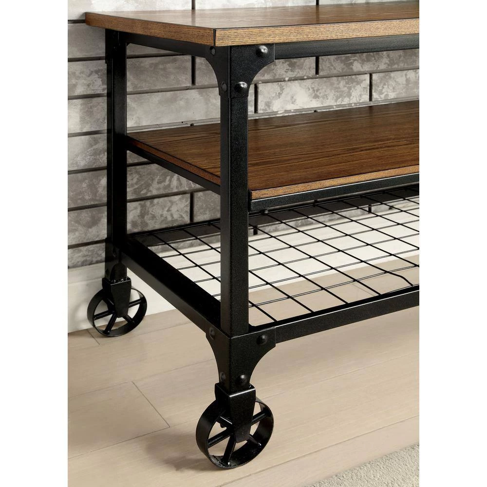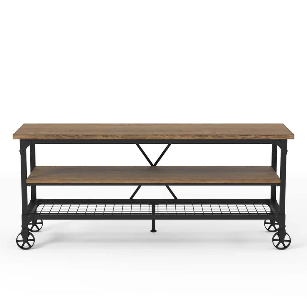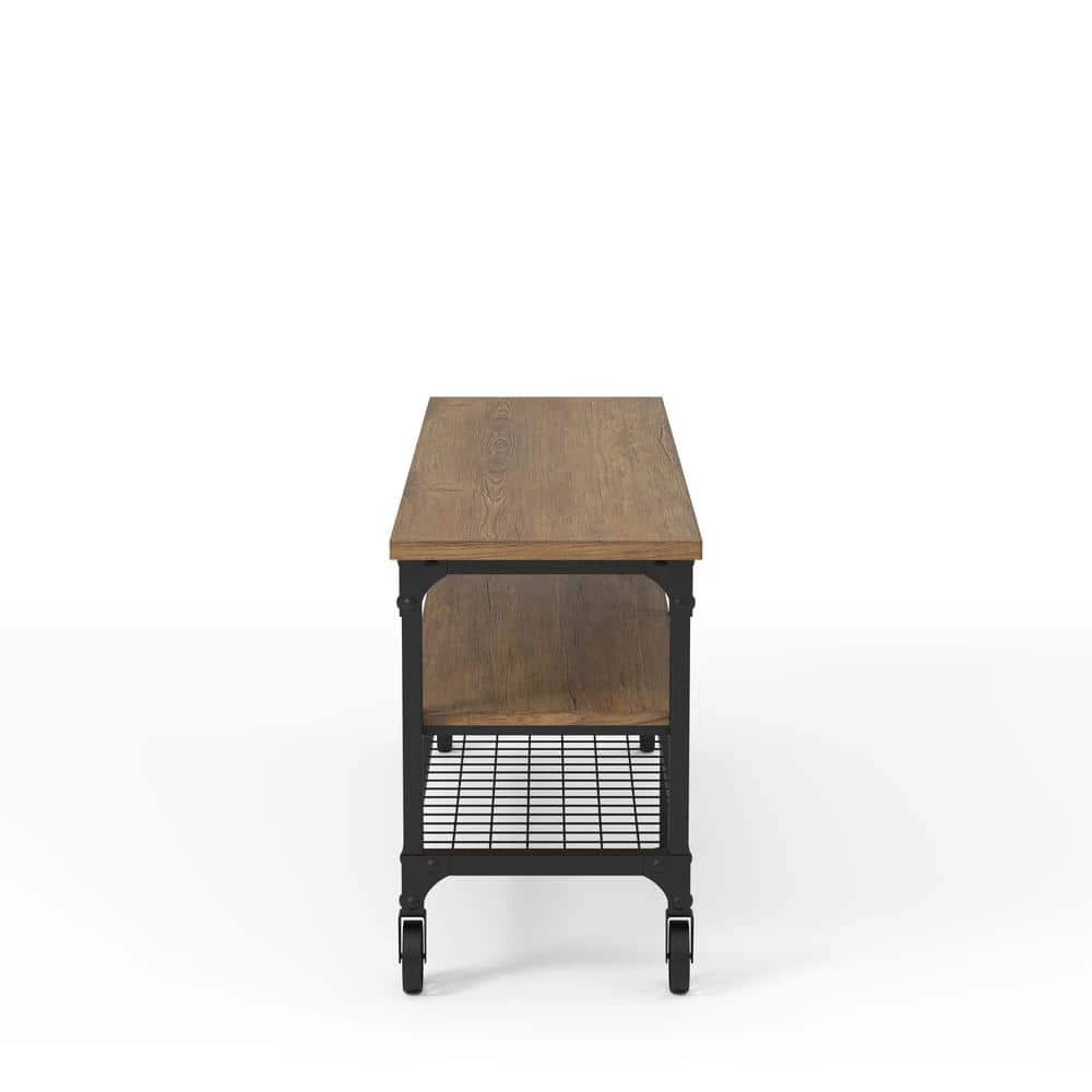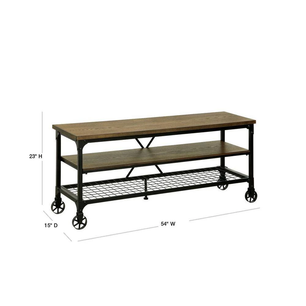 The sturdy structure of the Juklen Medium Oak TV Stand is constructed of a sleek black frame and natural finished wood panels for a fun industrial design. The open shelving is great for storing electronics and provides view to the neat X-shape back. The caster wheels and mesh base complete the rustic design for a piece with wonderful charm.