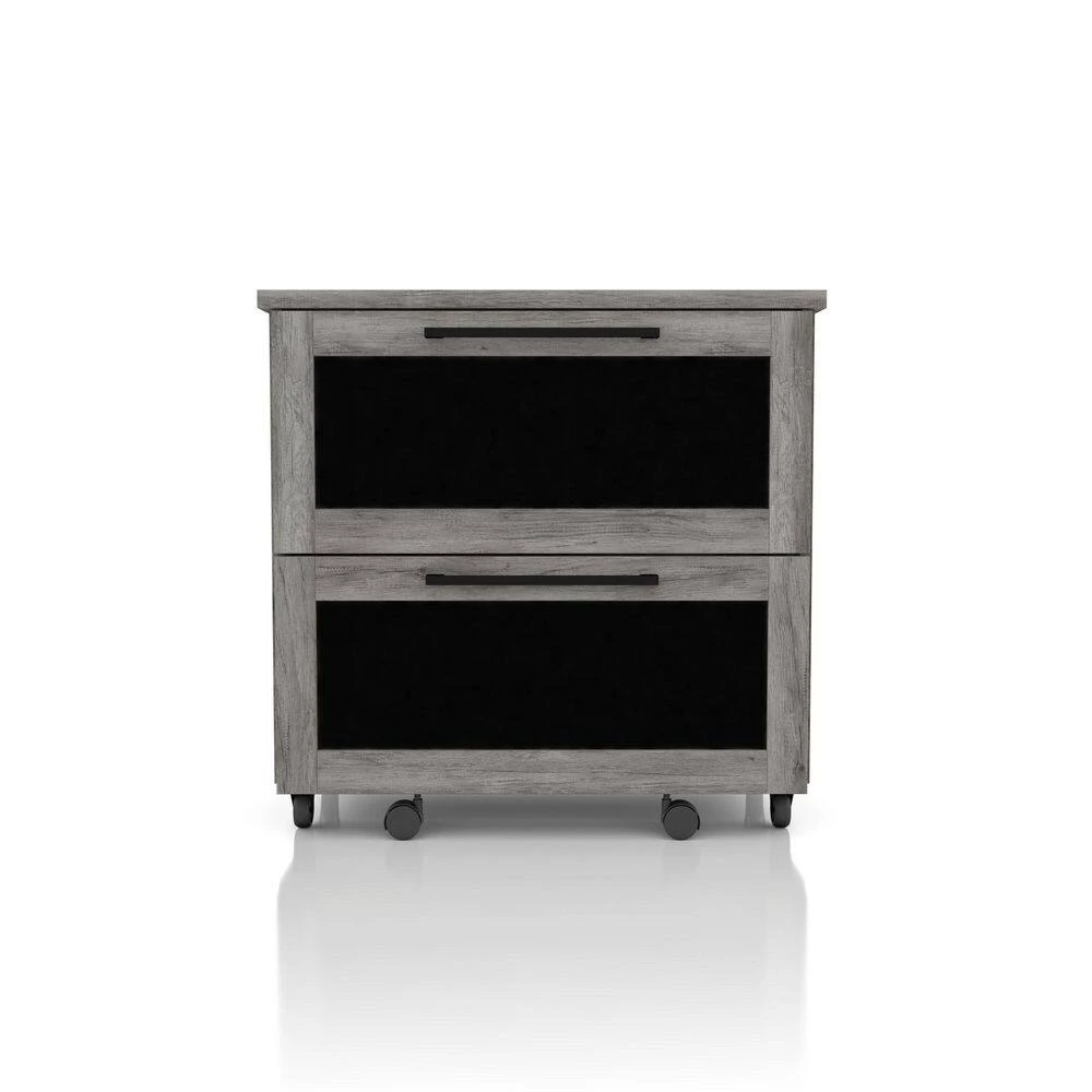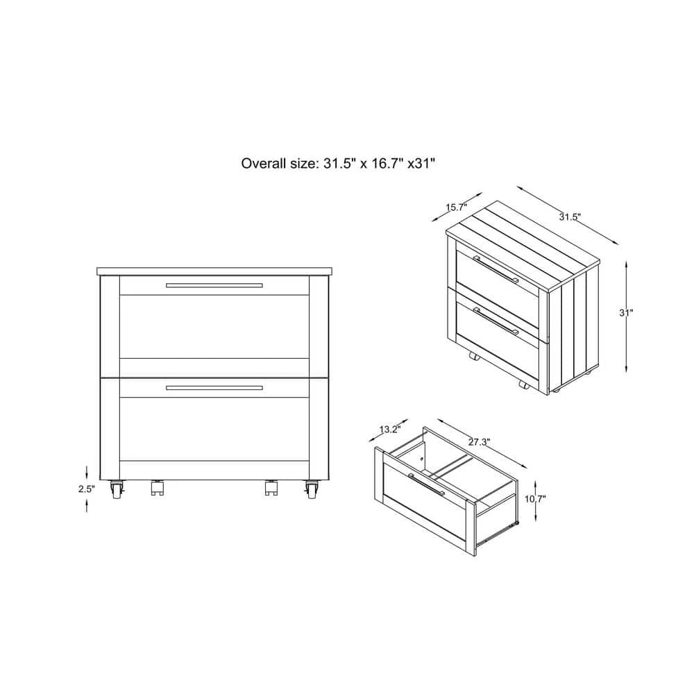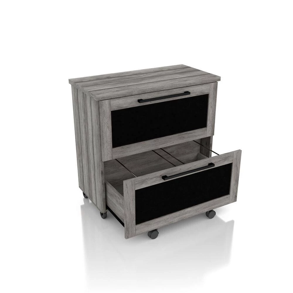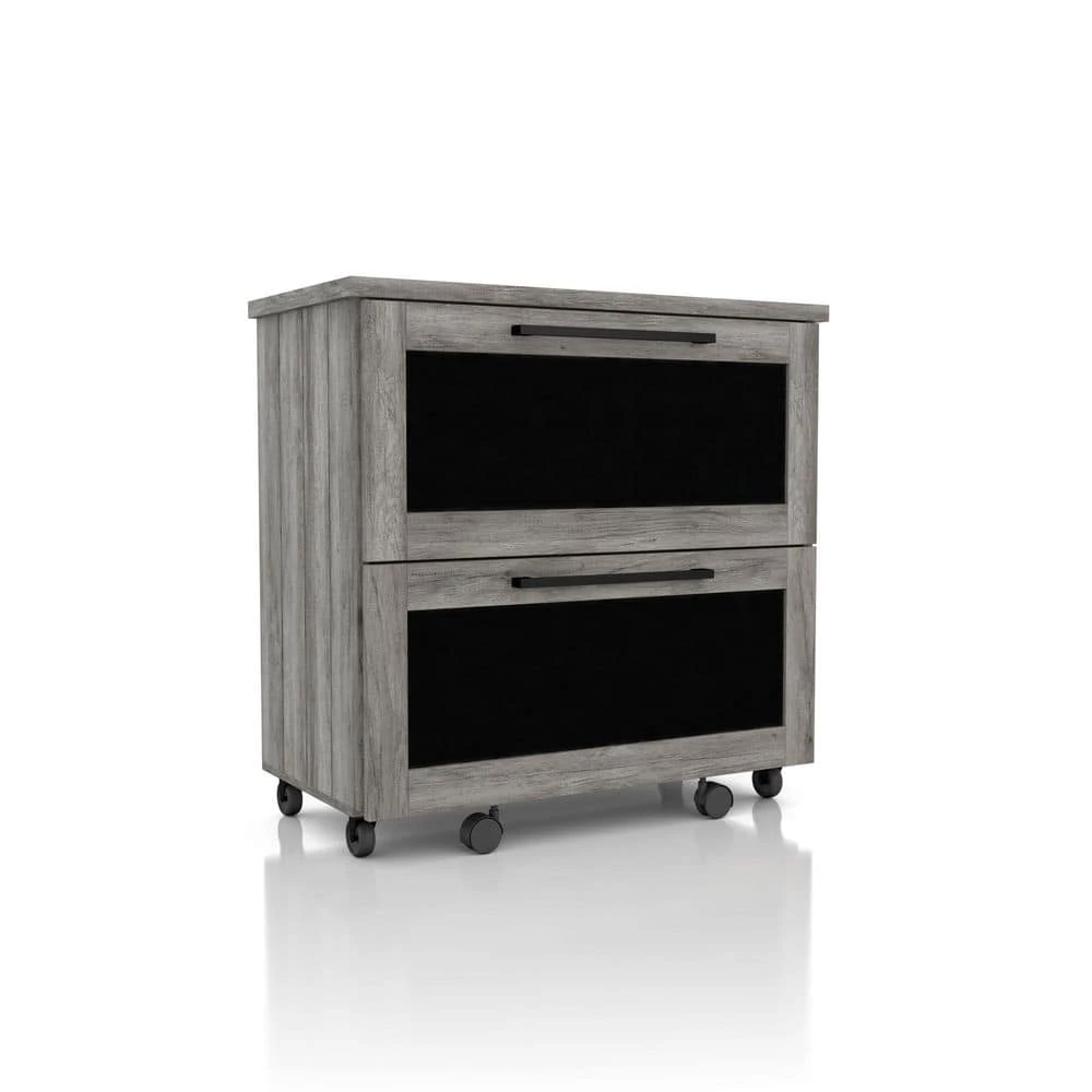 Accented with plank-style panels, Slim black handles, and chalkboard doors. This industrial vintage gray oak file cabinet offers the style and functionality every office needs. The 2 roomy drawers are perfect for organizing files while the caster wheels create an easily mobile design.