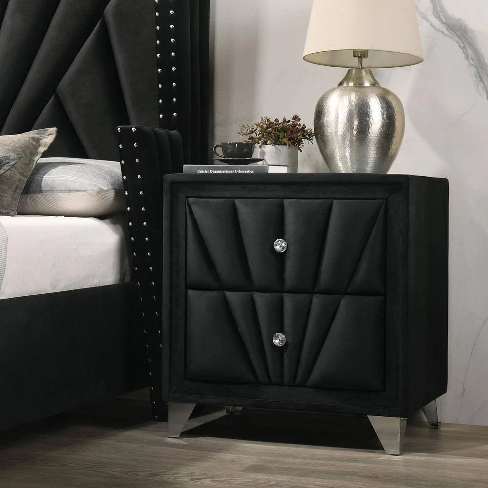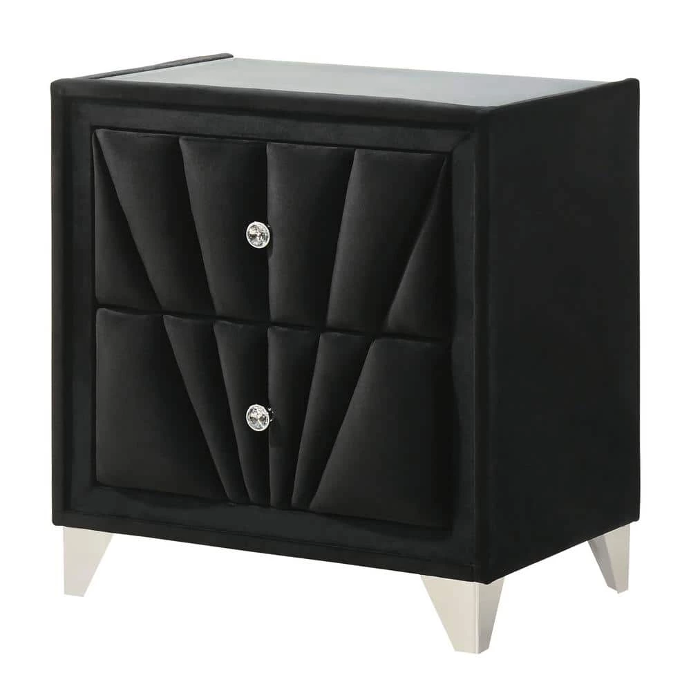Embrace 1930’s Hollywood glamour with the Art Deco influence of this stunning contemporary two-drawer nightstand with a bold look. Lush, velvety black fabric upholsters the full piece, from frame to drawer fronts, and is accentuated with bold tufting that truly ups the glamour factor in your bedroom. It delivers spacious bedside while each drawer is punctuated with a diamond ring pull that glitters in the light.