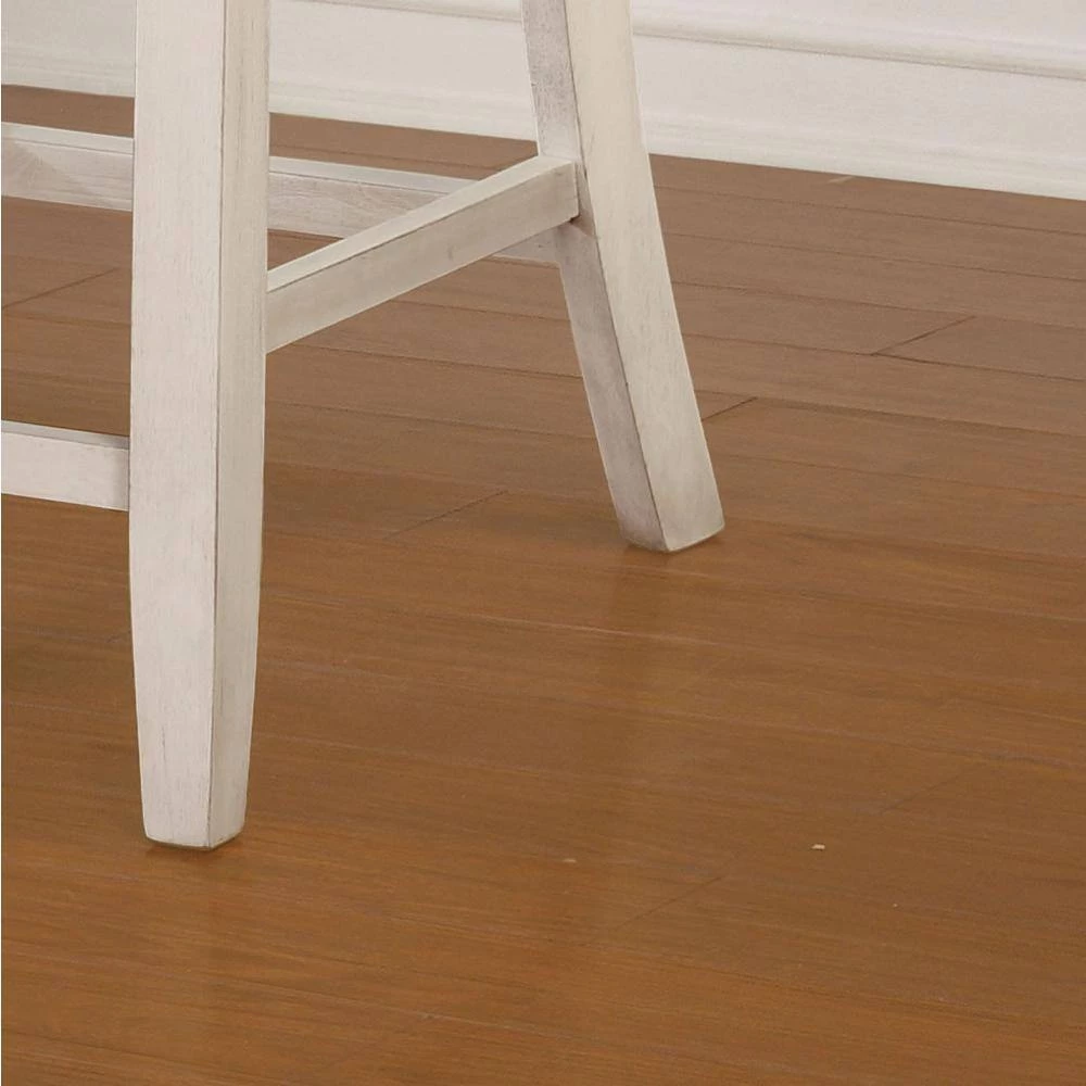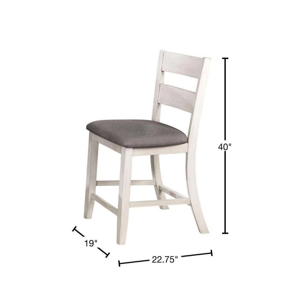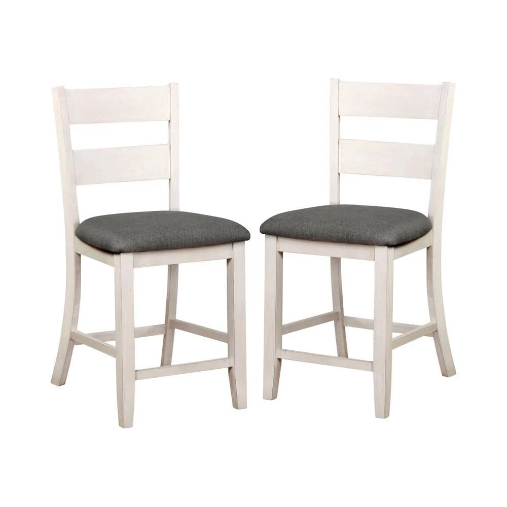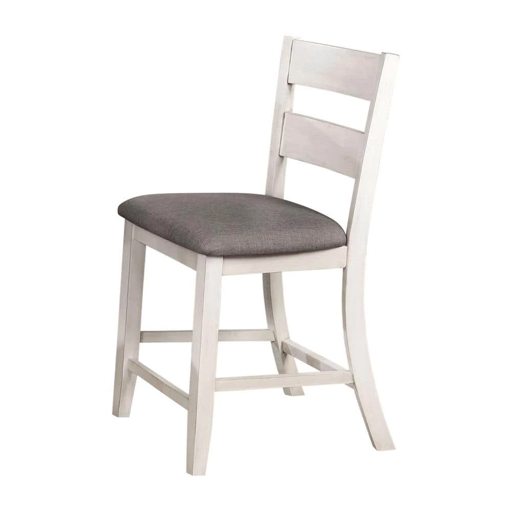 With clean lines and a distressed antique white finish, this pair of counter height chairs from the Lovelle collection is both elegant and understated. Perfectly suited for a farmhouse style dining room or kitchen breakfast nook, each side chair offers a gray linen-like upholstered cushion for comfort during long meals. Additionally, a slat back offers support while straight square legs offer a refined look.