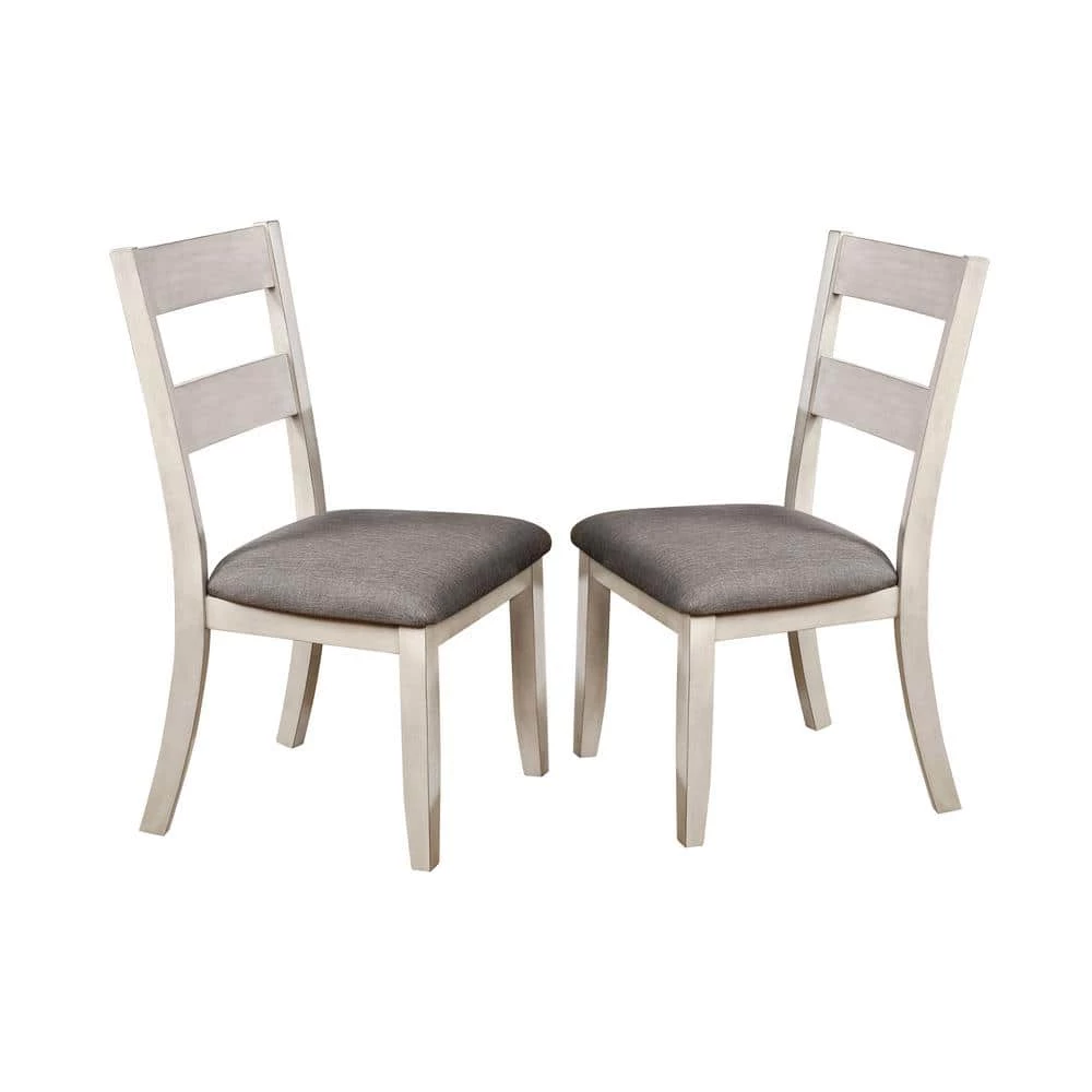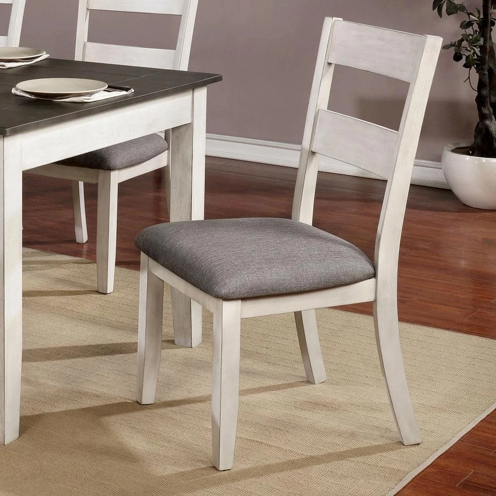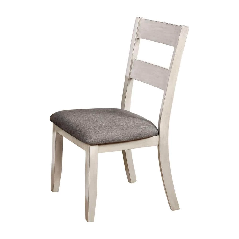 With clean lines and a distressed antique white finish, this pair of side chairs from the Lovelle collection is both elegant and understated. Perfectly suited for a farmhouse style dining room or kitchen breakfast nook, each side chair offers a gray linen-like upholstered cushion for comfort during long meals. Additionally, a slat back offers support while straight square legs offer a refined look.