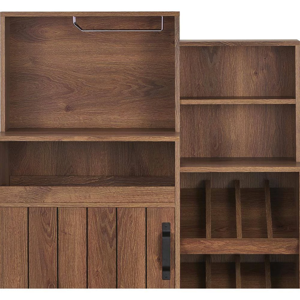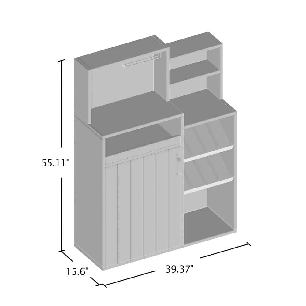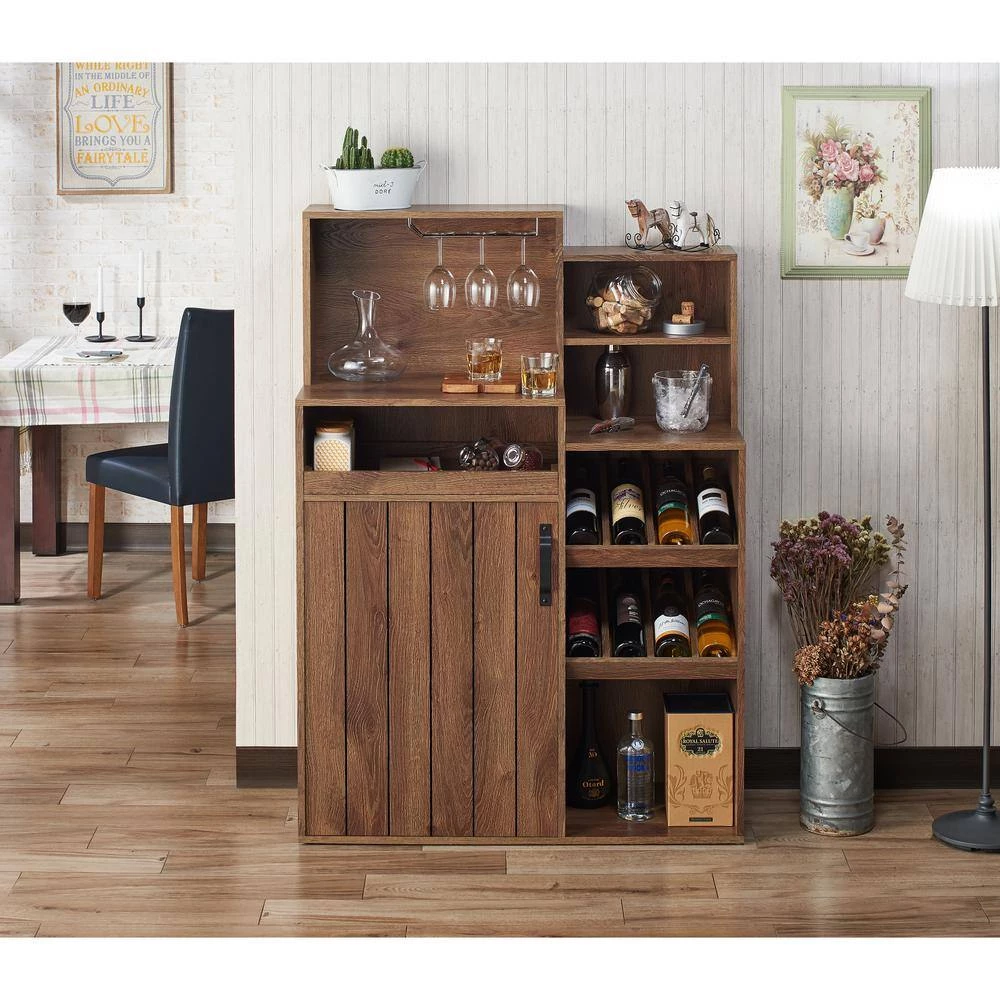 This gorgeous buffet and wine rack has a casual farmhouse inspired style. The buffet has five levels of open shelving, 8-bottle wine rack, a hanging stemware rack, and a cabinet to keep your dining and kitchen supplies. A planked cabinet door adds a country rustic element to this charming buffet server.