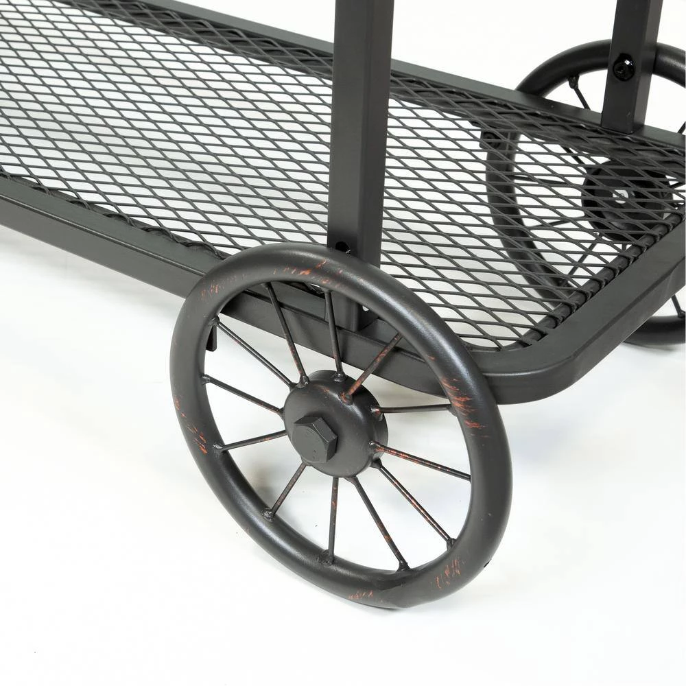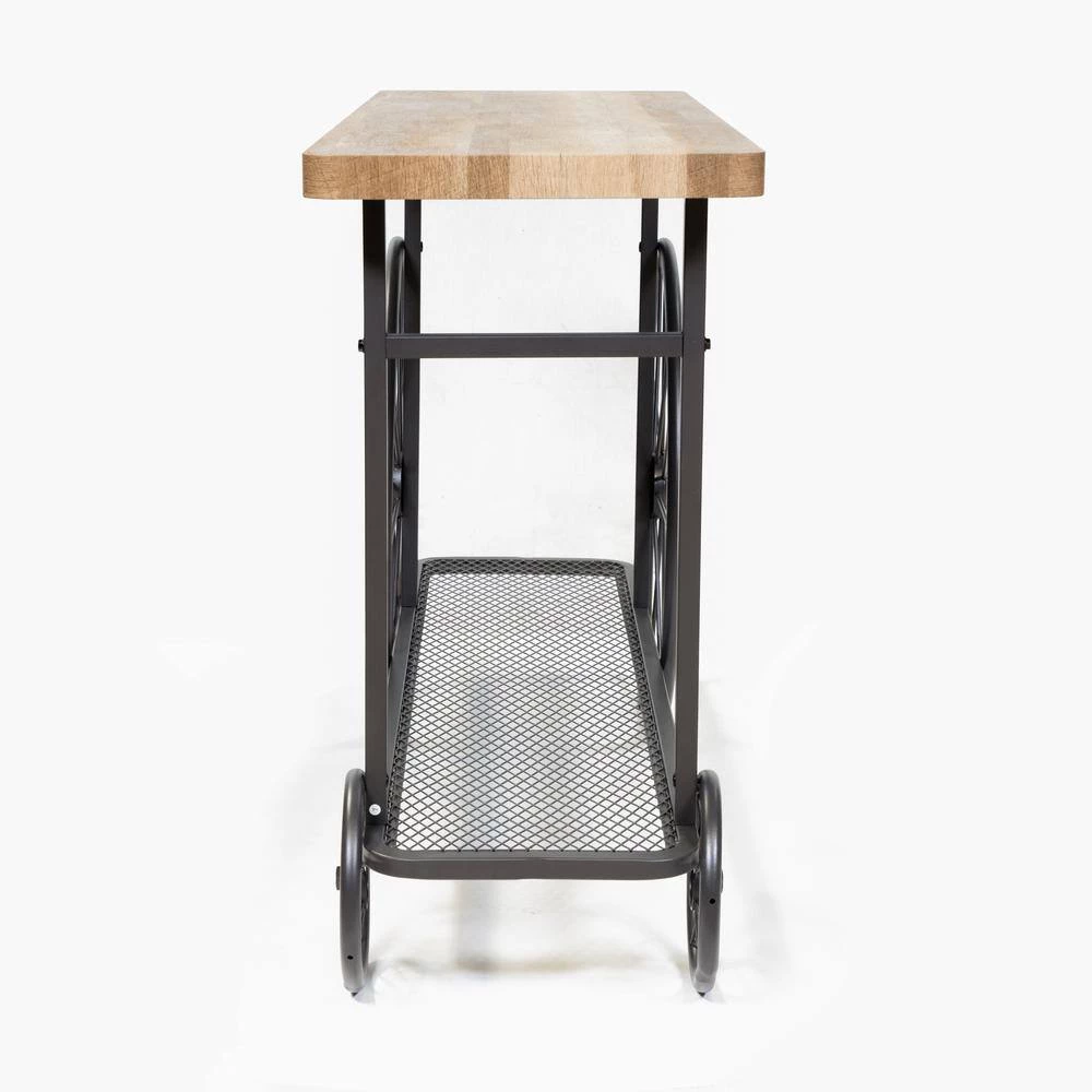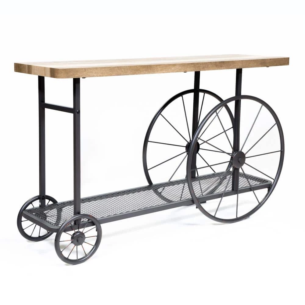 Inspired by industrial wheel, this metal caster wheel metal console table in sand black offers unique style and functionality at the same time. The natural wood finished tabletop adds both extra color and texture to the piece. The mesh wire bottom shelf provide ample space for extra stuff.