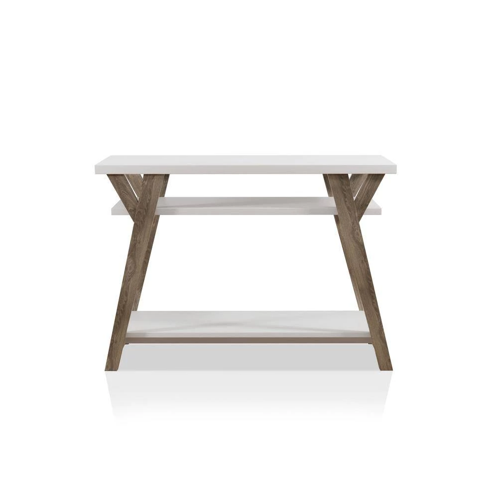 Define your entryway with the Merri Console Table by Furniture of America. The modern design features a wide tabletop and 2 spacious tiered shelves that are accentuated by contrasting angled legs. Perfect for entryways, hallways and living spaces, the Elly Wood Console Table delivers a modern touch to elevate your home style. With a white and distressed taupe finish, it complements numerous color palettes.
