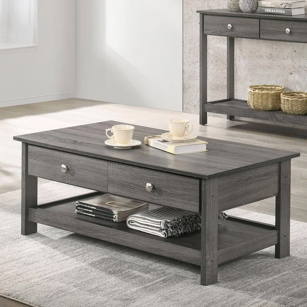Create a stylish seating area around this transitional coffee table that features a rectangular profile and is perfect for serving snacks and drinks or stashing essentials while working from home. Perfect for a casual living space, the table features wooden construction and a gray wood grain finish with silver-toned, round knob drawer pulls. This coffee table also includes a lower-Shelf, perfect for showing off beautiful books and decor or adding storage.