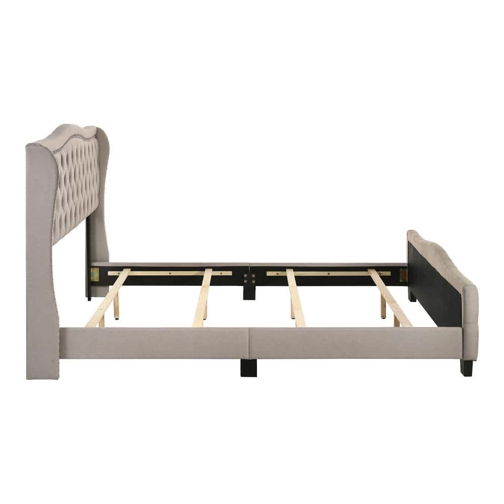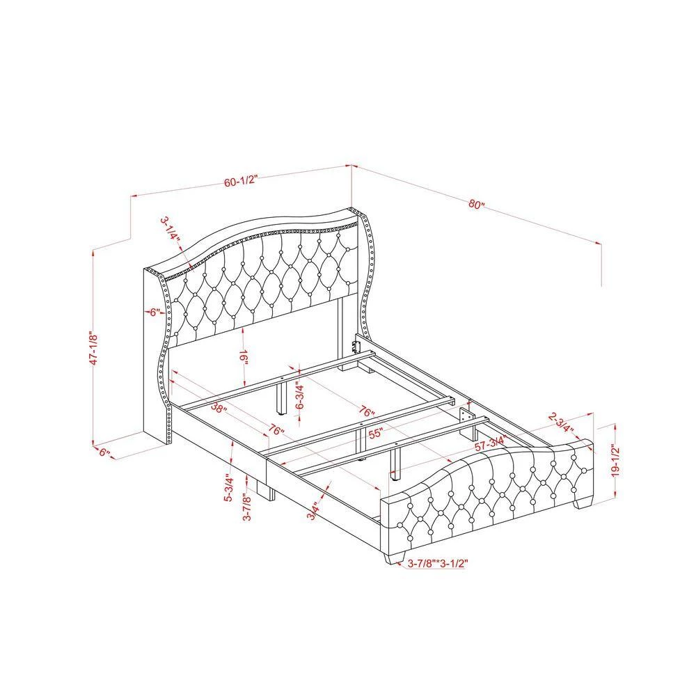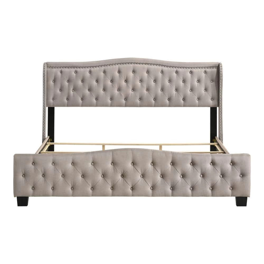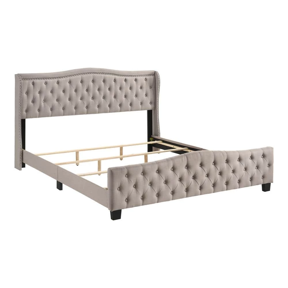 This fully upholstered bed features a classy design. The headboard and footboard are button-tufted with nailhead trim. A slightly angled headboard framework gives the bed a modern touch, that moves away from traditional and into a transitional style.
