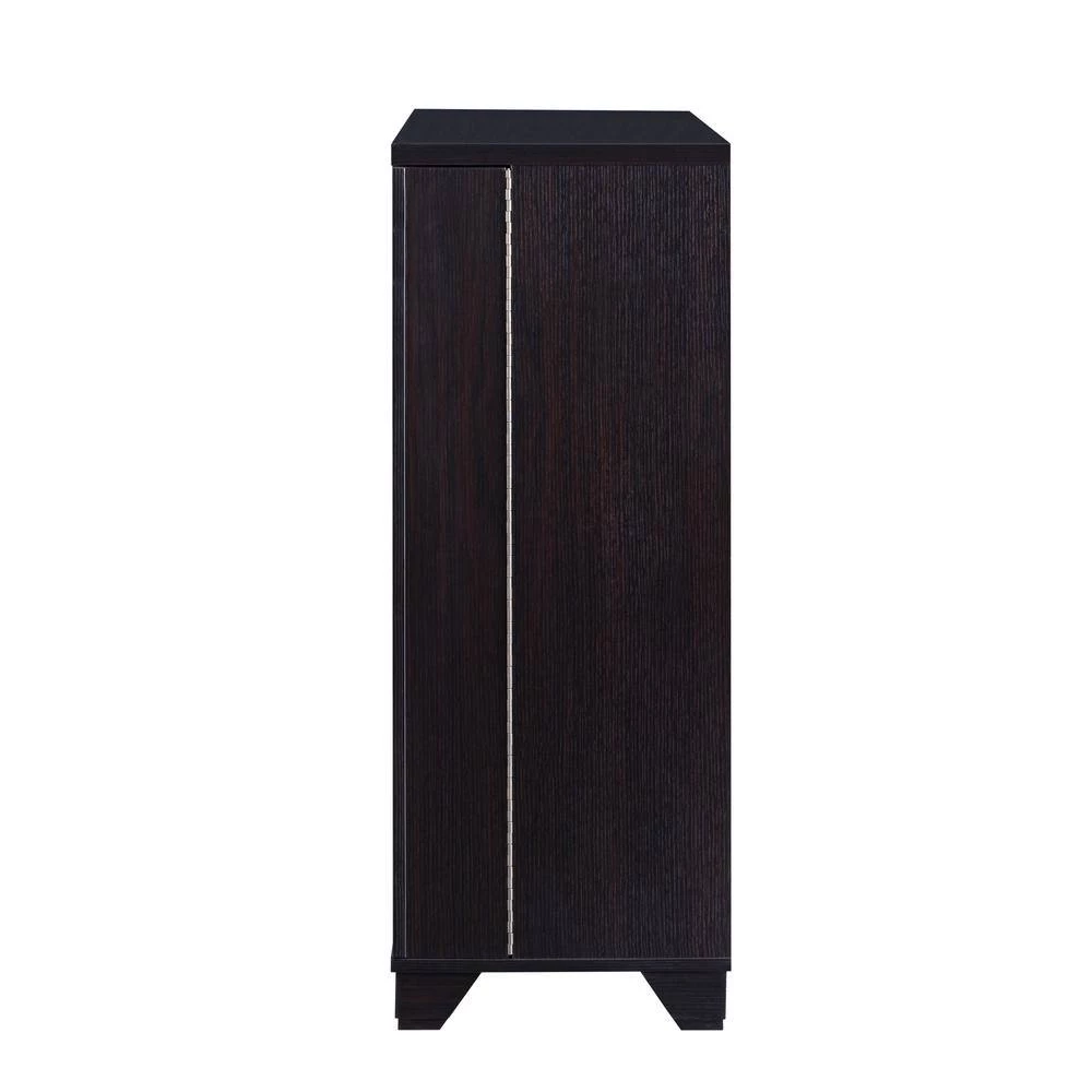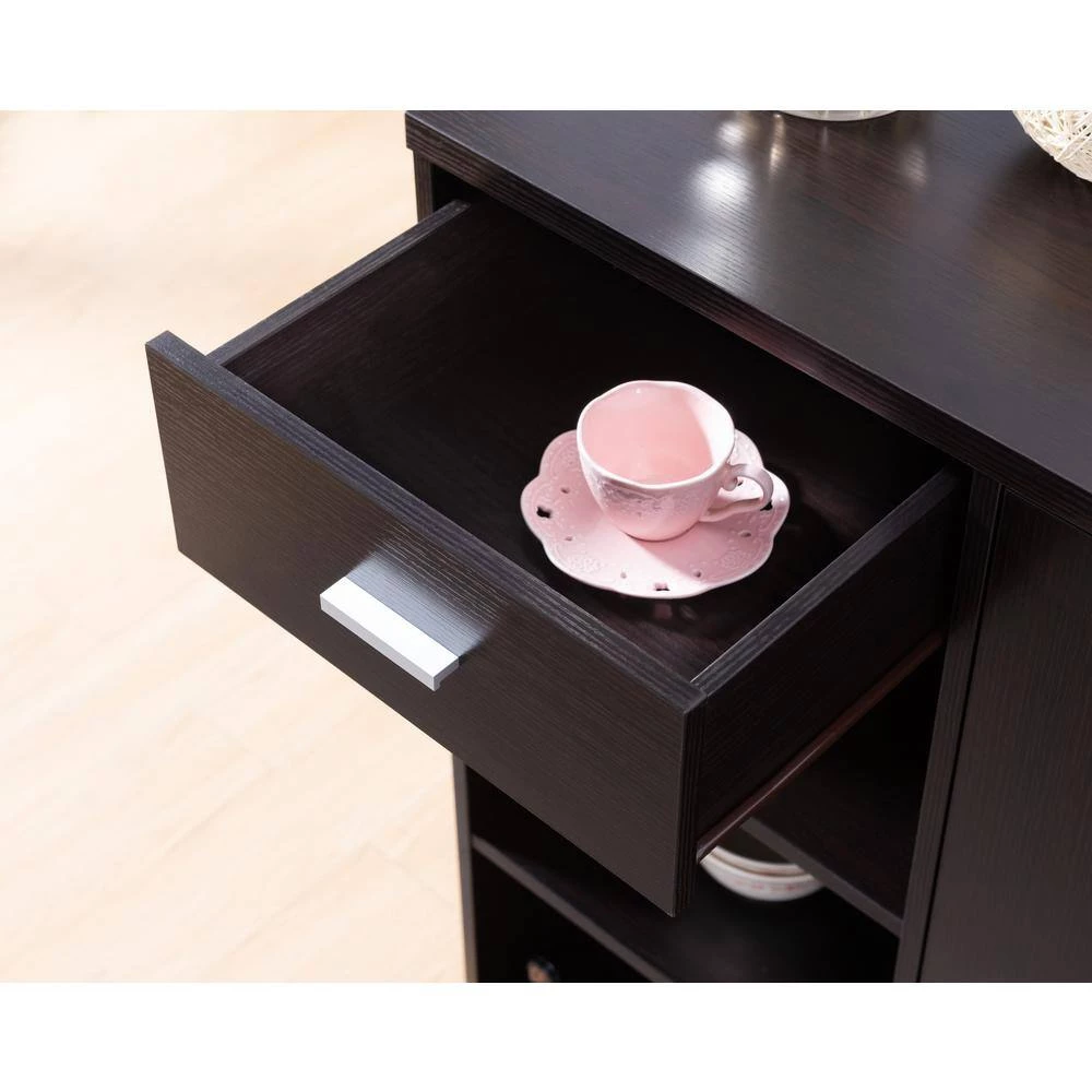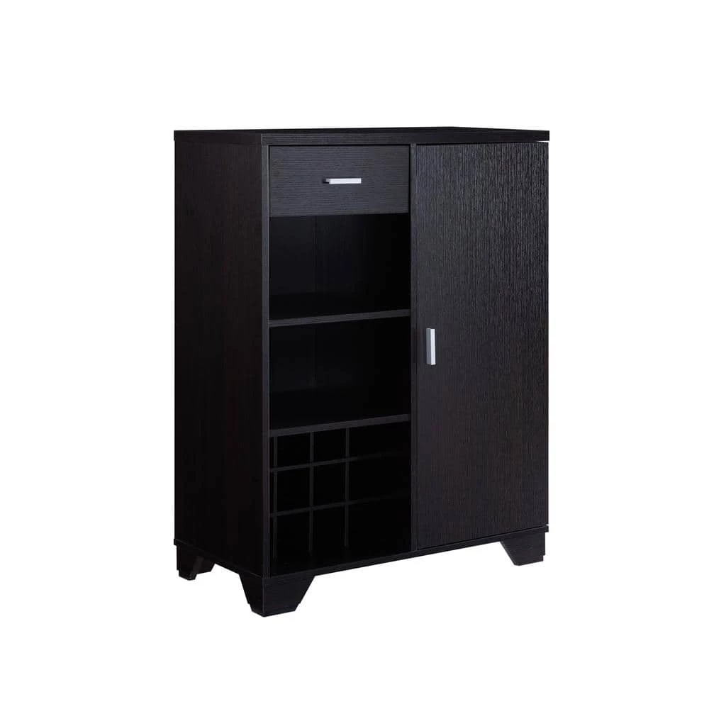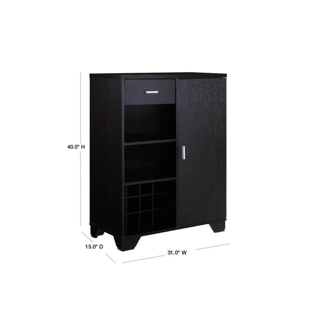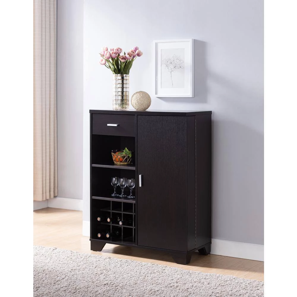 The gorgeous finish makes this Furniture of America bar cabinet a unique, modern look that will add style and personality to any space. The cabinet opens to reveal a stemware wine rack and liquor cabinet hidden inside. Features like a spacious one drawer and a convenient removable wine bottle rack, add versatility to this wine bar cabinet. Wine bottles, glasses and shakers are not included and are for display purposes only.