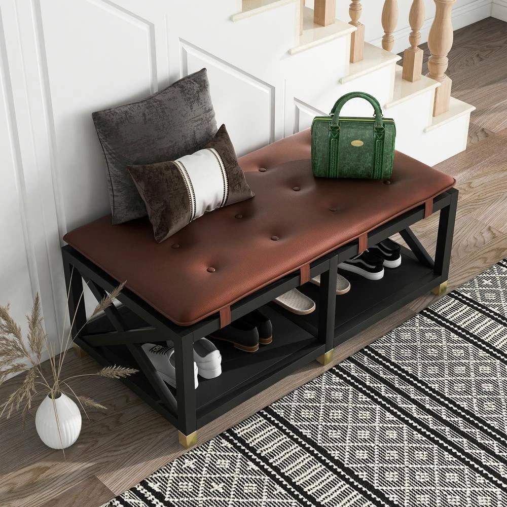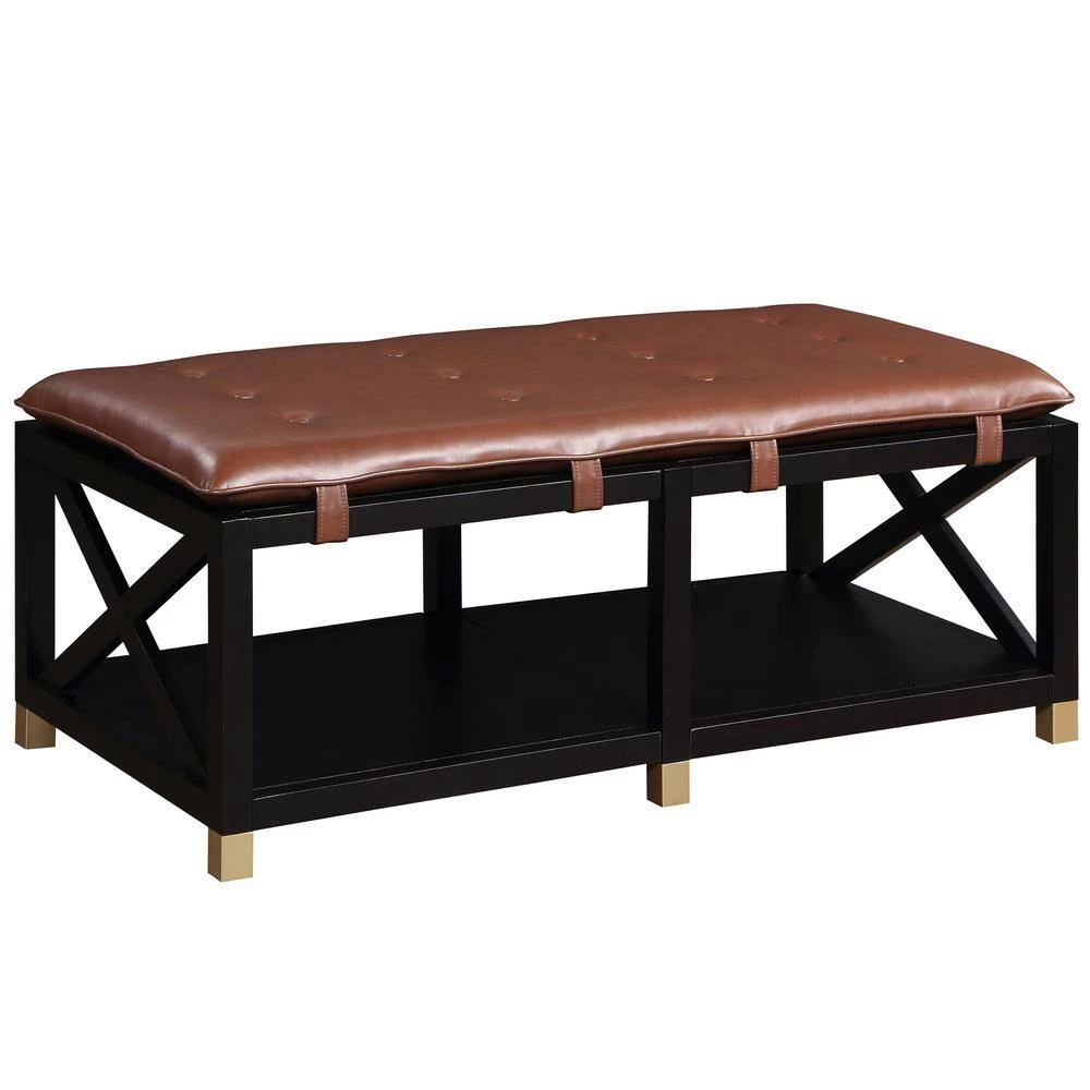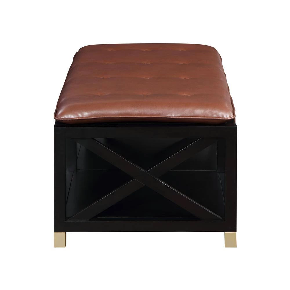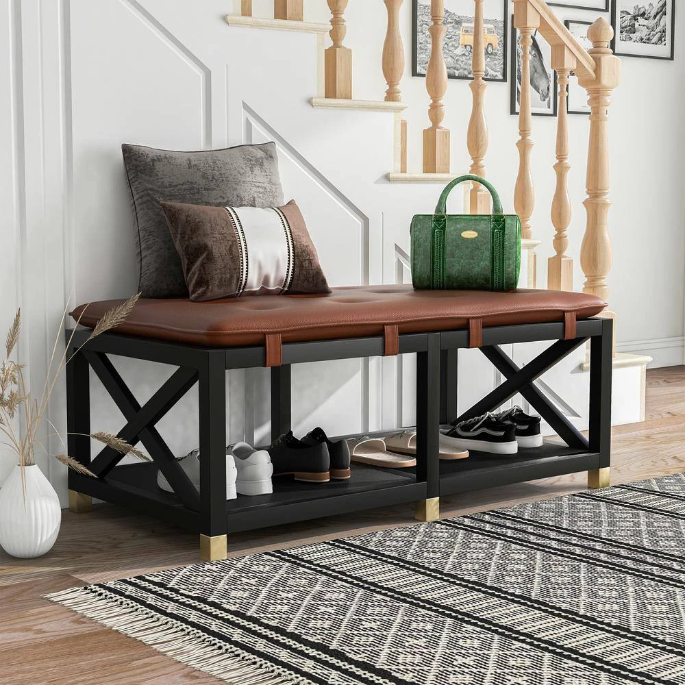 Perfect in your entryway, living room, or by the foot of your bed, this versatile bench lends a seat in any space. Crafted with a rectangular frame in a black finish, its removable brown cushion is padded with foam and upholstered with neutral-hued faux leather that’s as easy to clean as it is to match. Button-tufted details dot the top for a touch of texture. This eco-friendly frame is constructed from rubberwood, a tropical, solid wood taken from rubber plantations.
