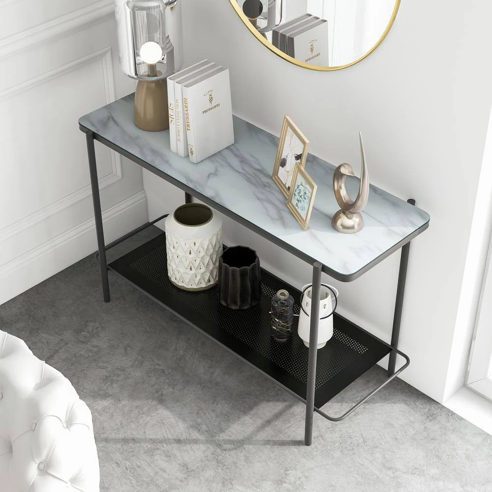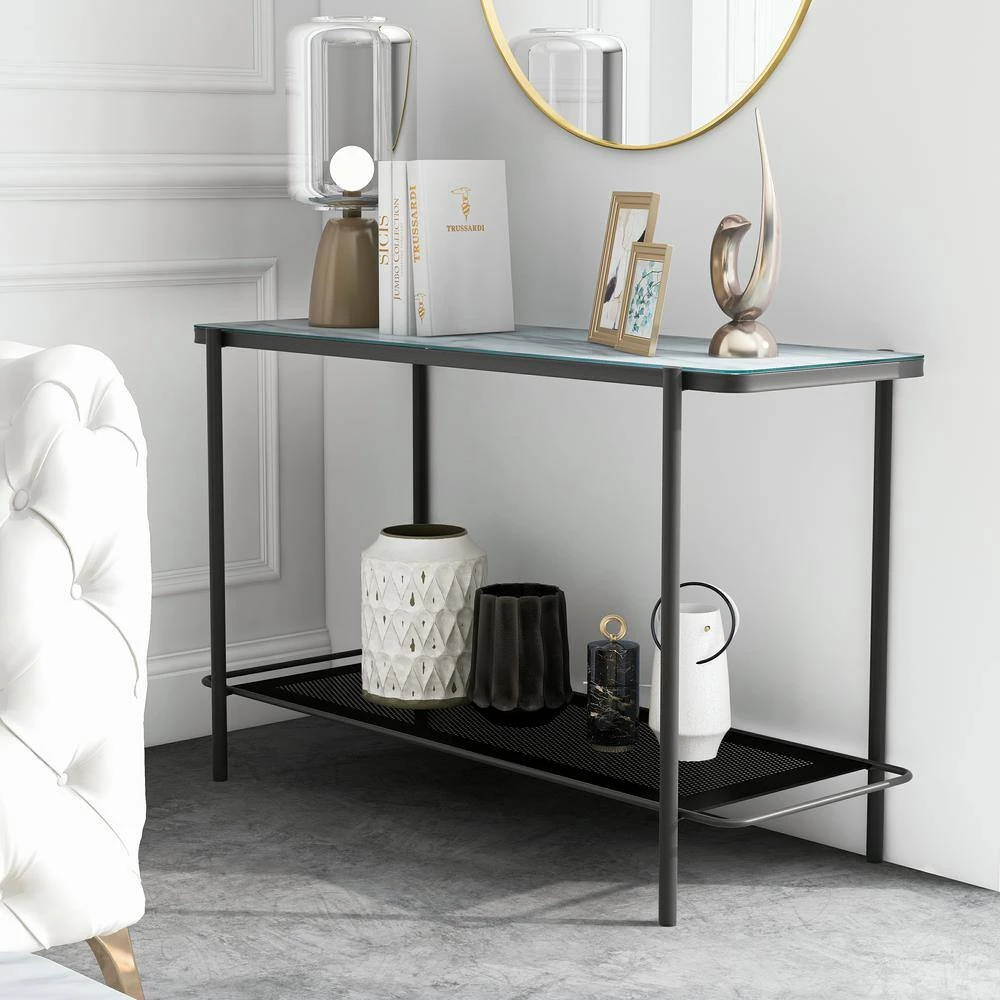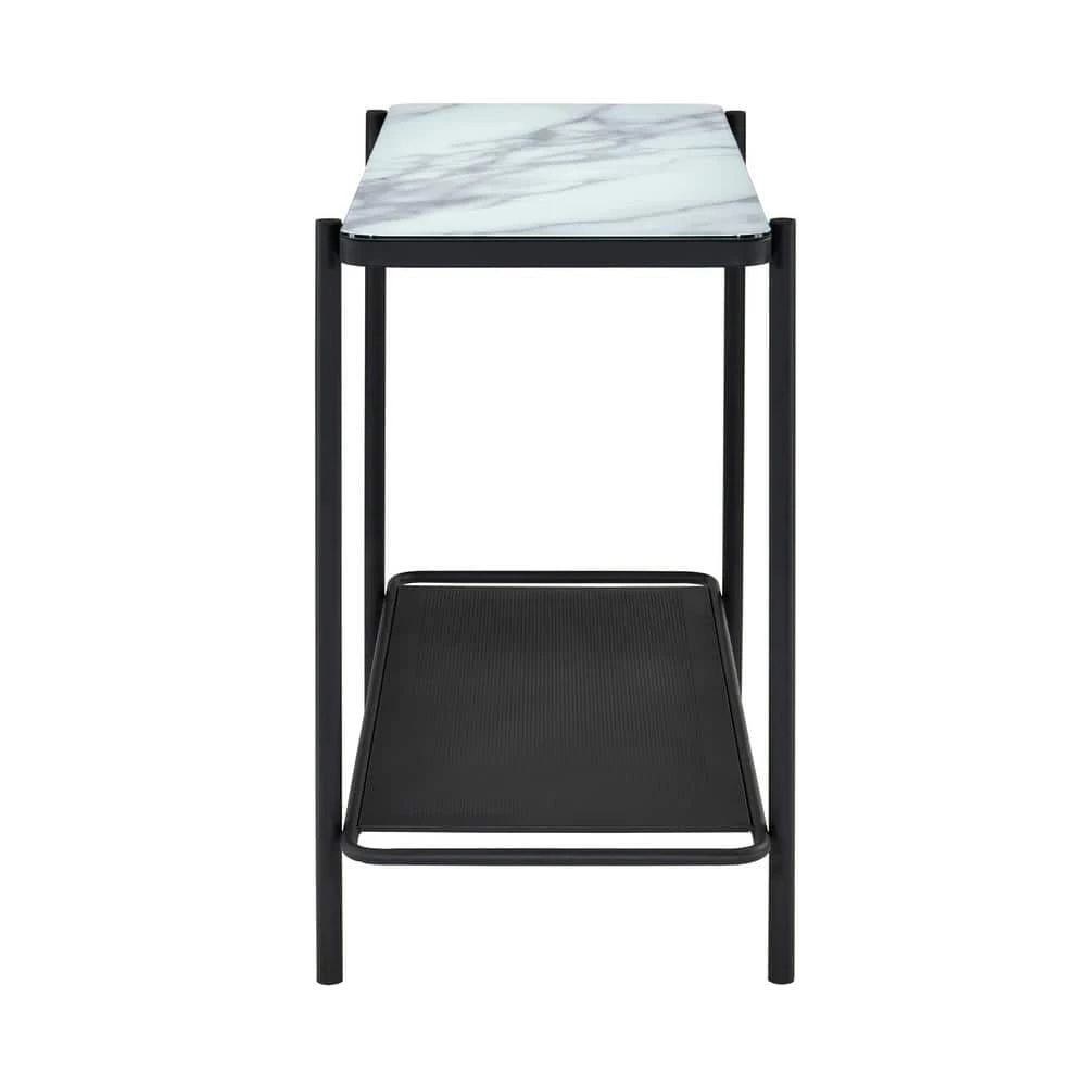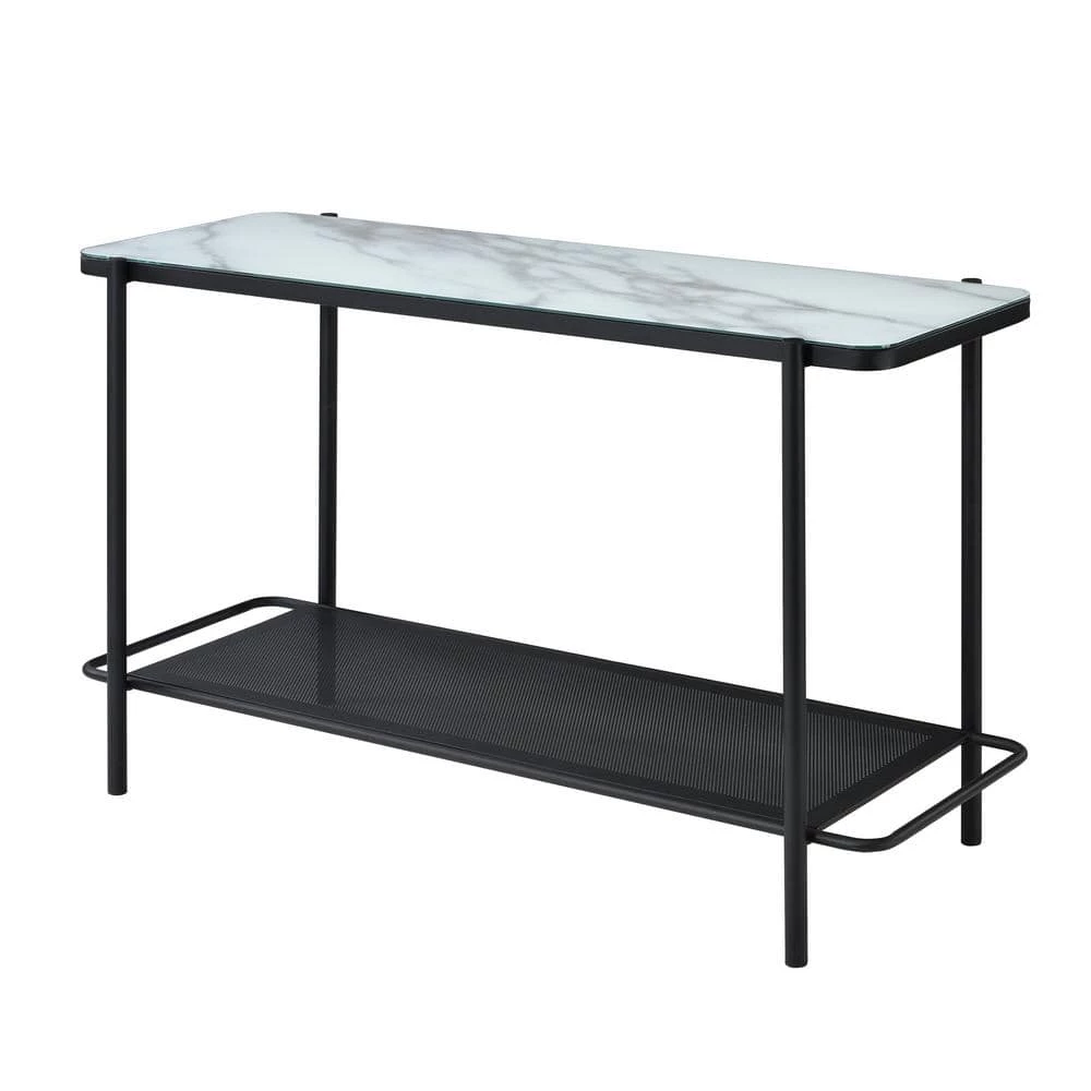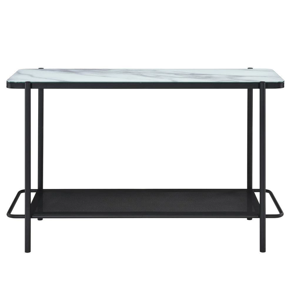 Transitional in design, this black and tempered marble glass sofa table is perfect for an urban home. The unexpected style combines a classic white marble-like tabletop with an urban metal lower shelf. This extra storage surface features a mesh structure that contrasts the tabletop in an artistic expression.