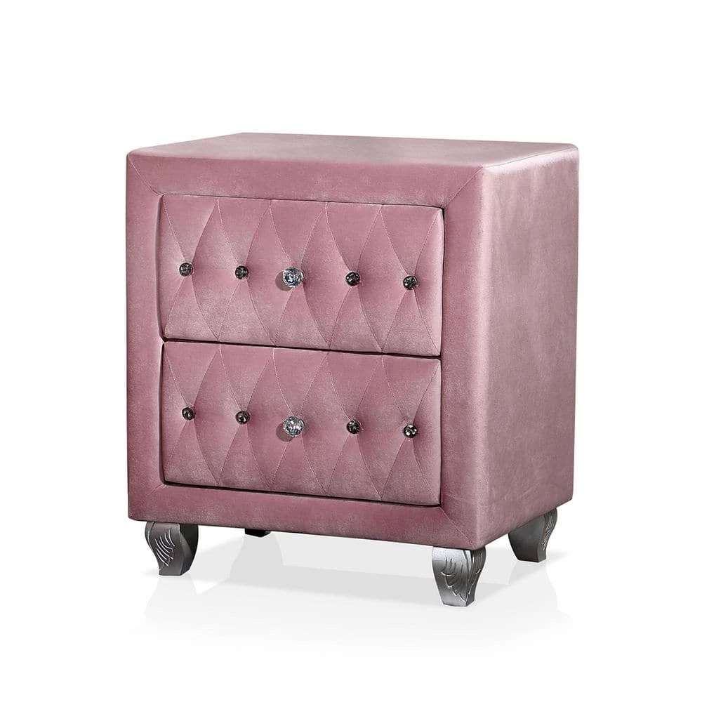 - Romantic blush velvet upholstery with crystal-like buttons maximizes an alluring aesthetic