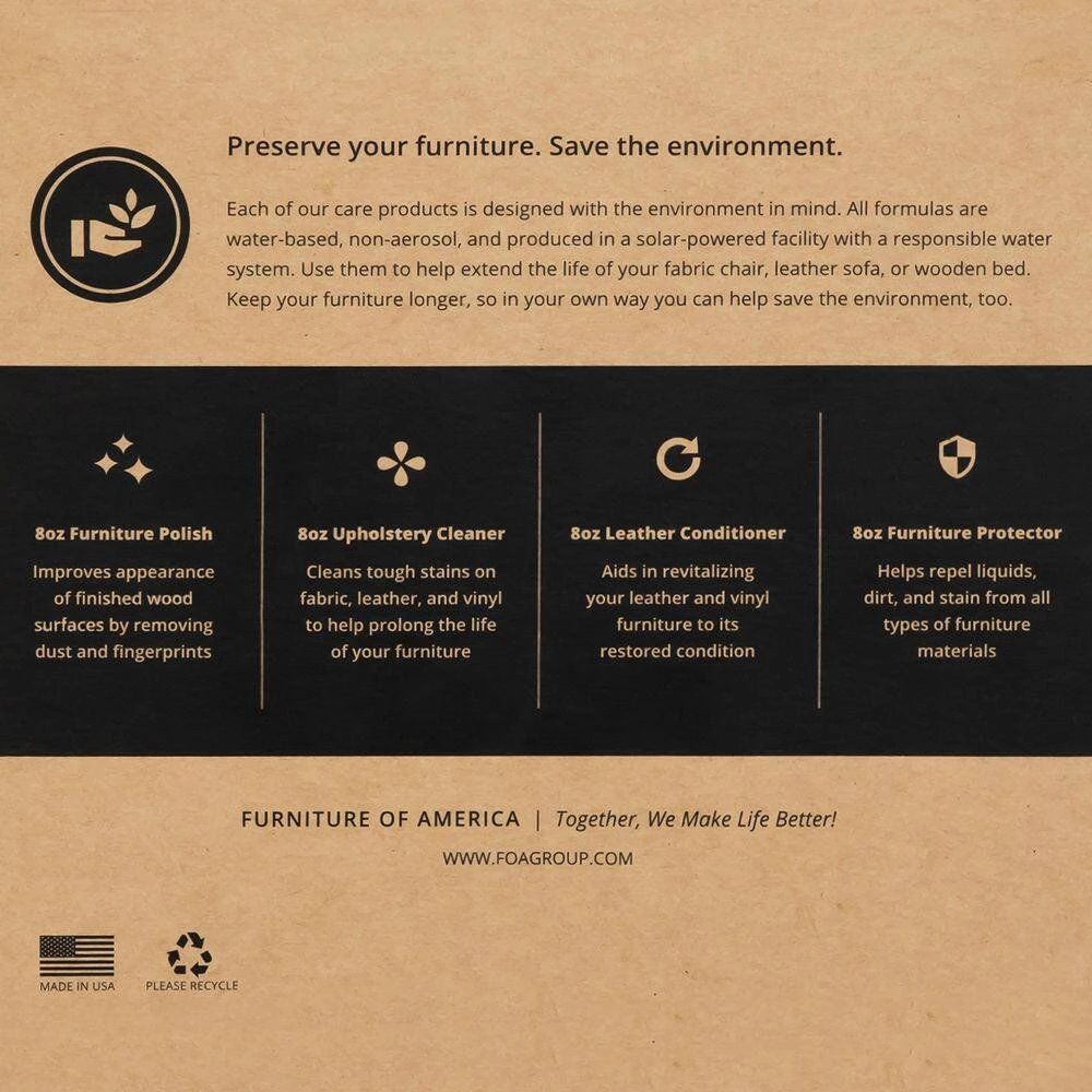 - Care Kit includes: (1) Furniture Polish, (1) Upholstery Cleaner, (1) Leather Conditioner, and (1) Furniture Protector