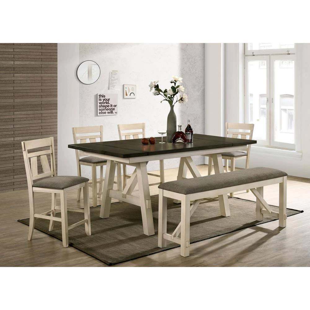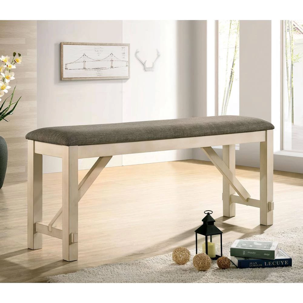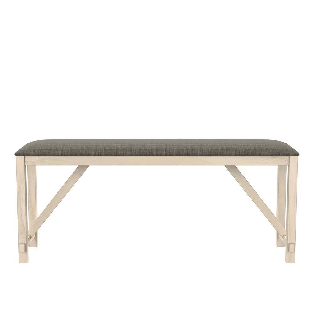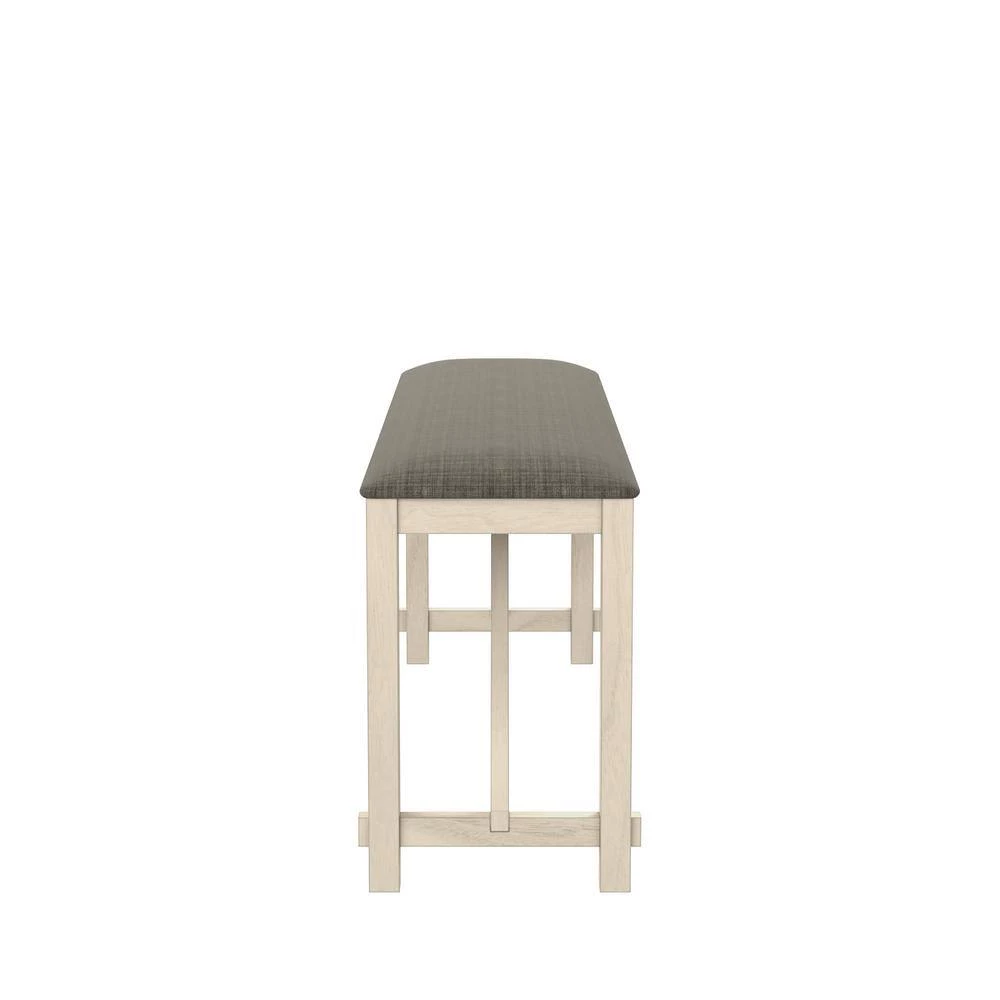 Hints of farmhouse flair in this counter height dining bench revitalize casual or transitional decor. The two-seat bench is comfortable and supportive, perfect for gathering with friends and family to enjoy a delicious meal. It is equipped with a padded seat wrapped in neutral gray fabric upholstery. Creamy ivory finish adds warm and inviting energy.