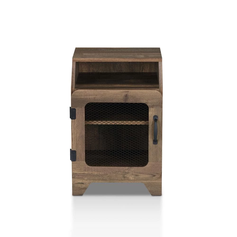 Sink into your comfortable armchair and pull a book from this reclaimed oak finished end table. It attends to all the storage needs in a countryman’s den. The rustic hinged door and metal wire screen give the room a casual farmhouse atmosphere.