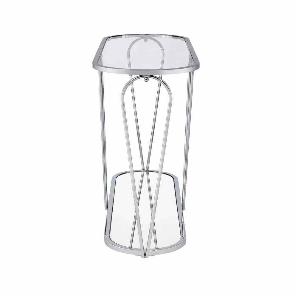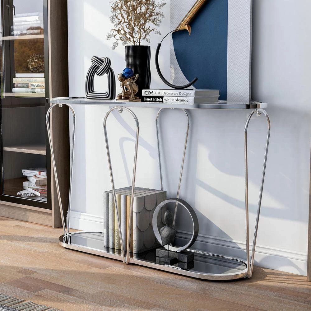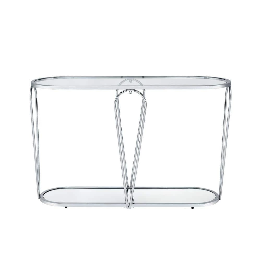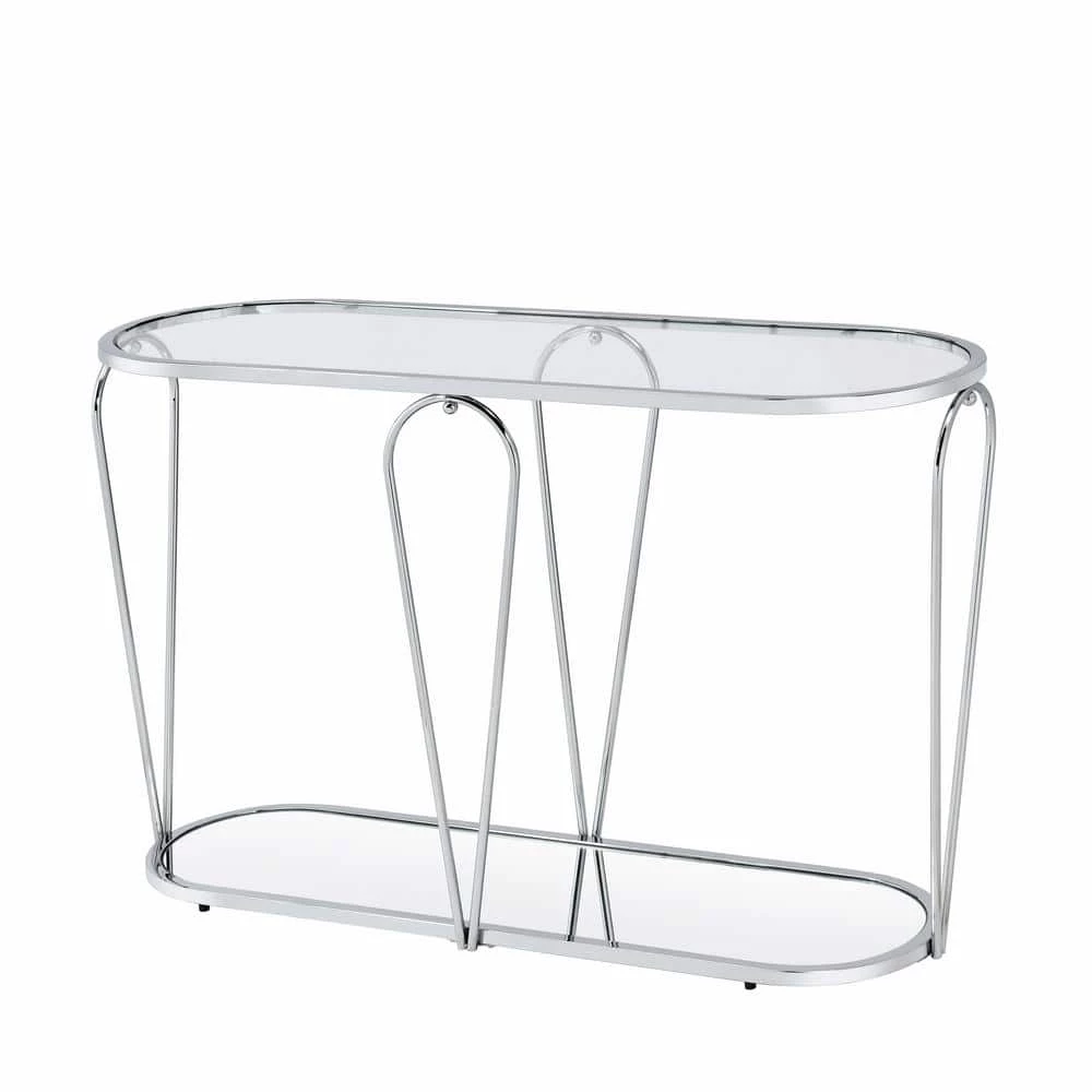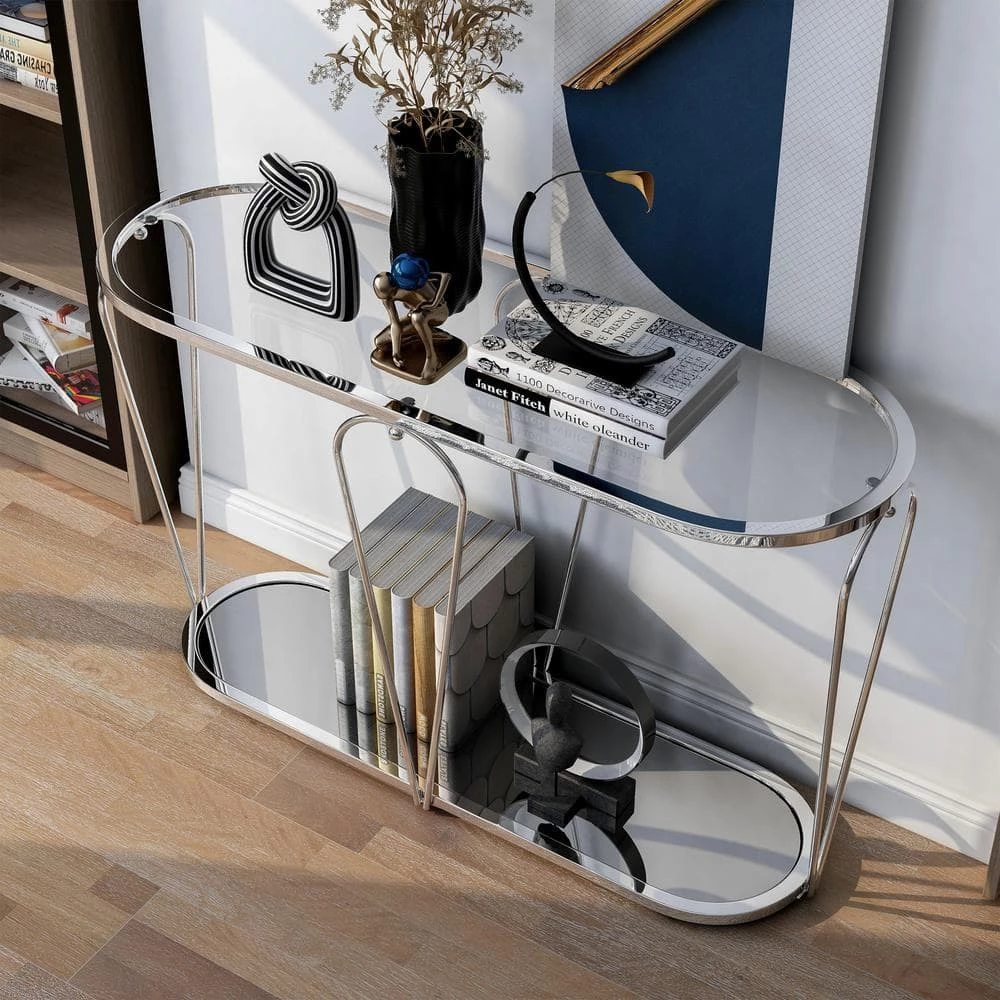 Eye-catching details and bold curves ensure that this modern oval console table captures attention in your home. A sophisticated design, the table features metal frame paired with a glass top and mirrored lower shelf perfect for decor. Accentuating the table, four inverted teardrop shaped supports and a low to the floor stance add enchanting style to perk up any sitting area.