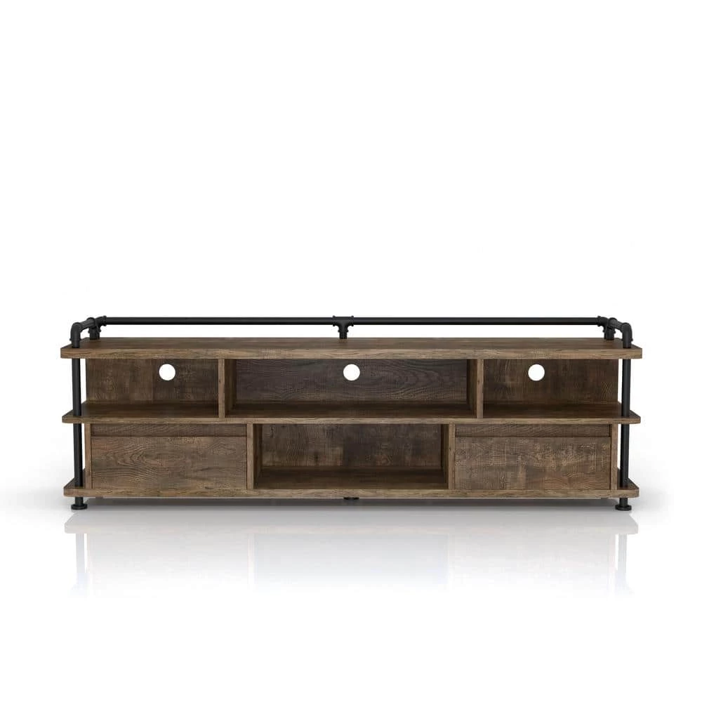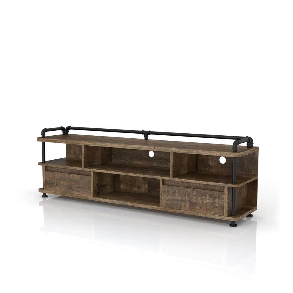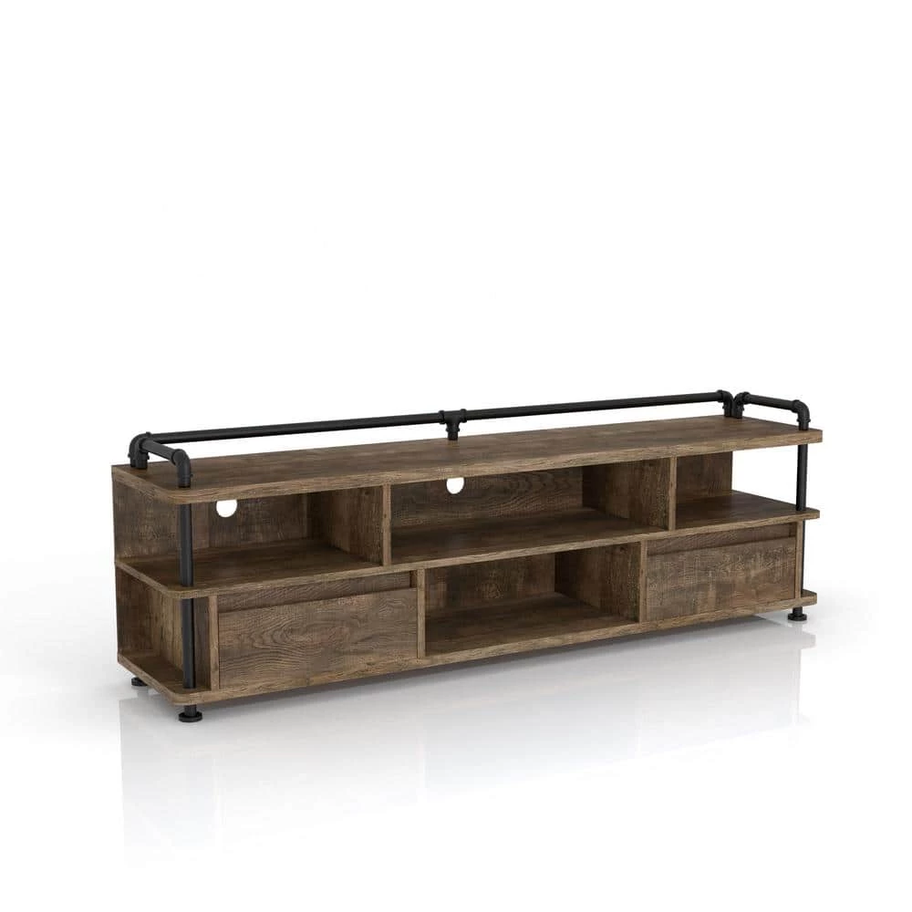 Distressed wood varnish and black waterpipe metal accents blend together to form an industrial-style TV stand. This TV console is hoisted up by the pipe metal legs on disk feet. The rounded railing of the tabletop gives life to the stand with subtle drawers. Three wire hole cutouts add convenience.
