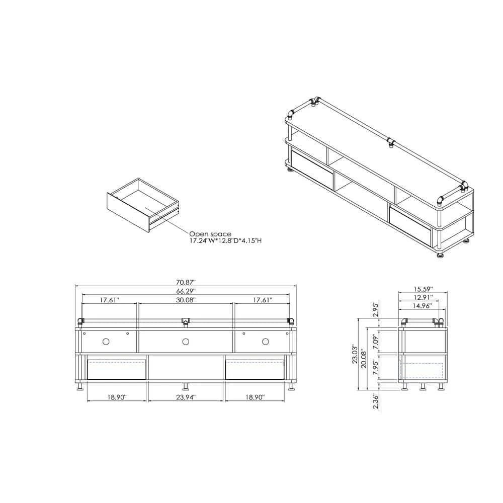 - 23.03 in. H x 70.87 in. W x 15.59 in. D
