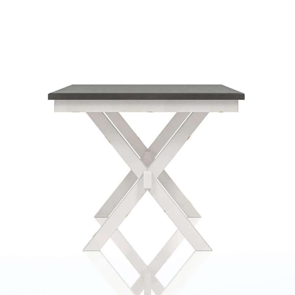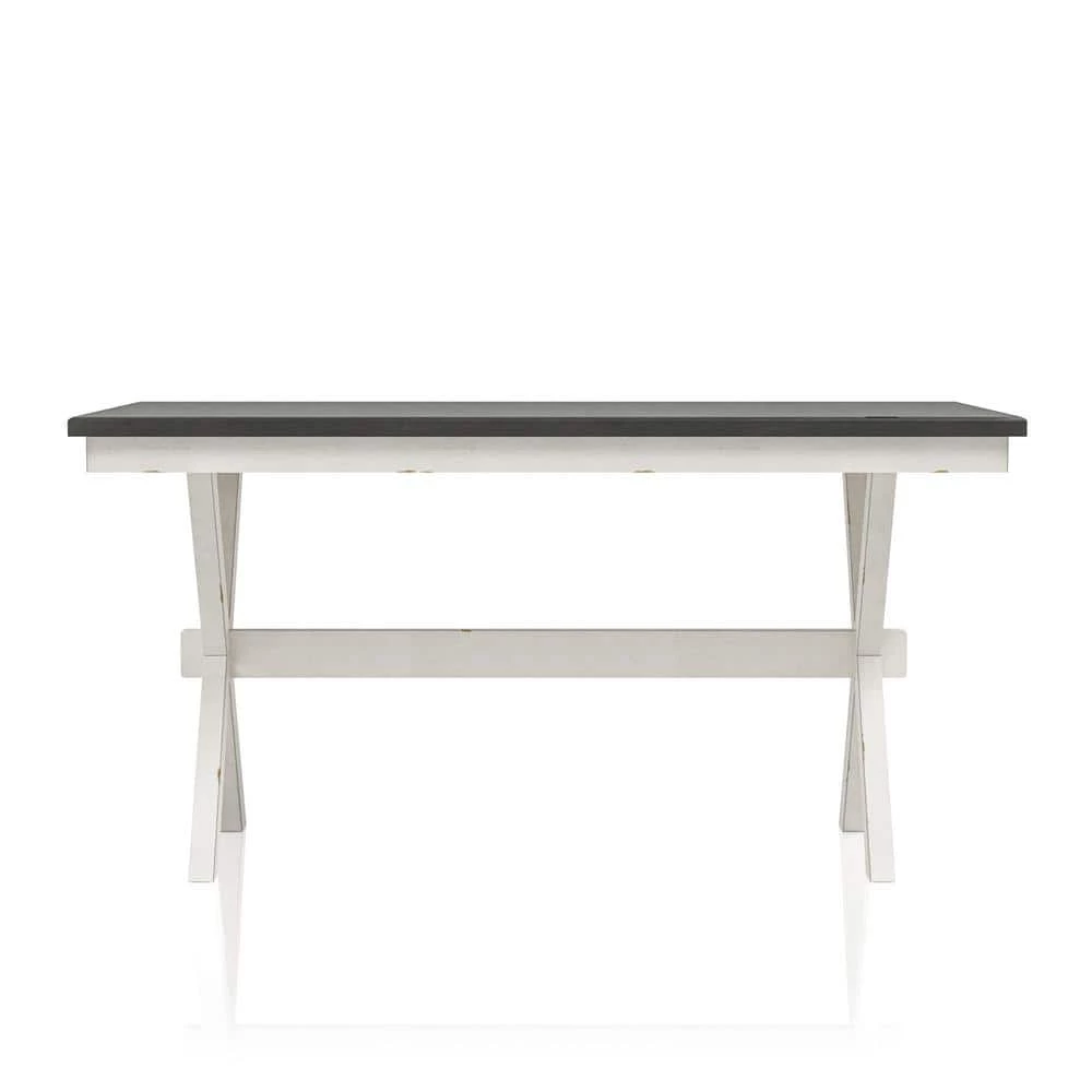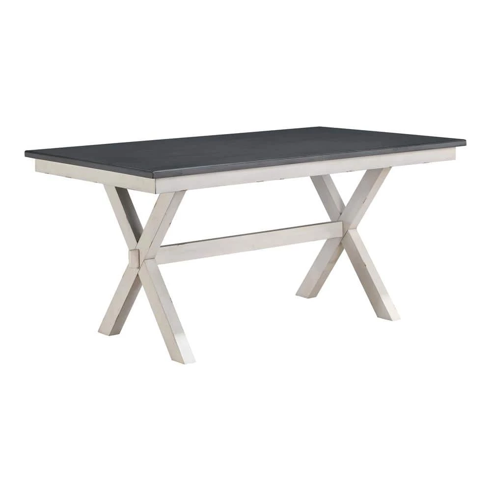Furnish a formal dining room with this stunning clean-edged, minimal tabletop Paramus table. A transitional style and rich gray and vintage white finish lend this table a sophisticated look, while sturdy construction from wood and veneers offers lasting durability and a smooth appearance. Unique center cross beam and X-shape legs, cross brace legs are a contemporary touch that add fun visual interest.