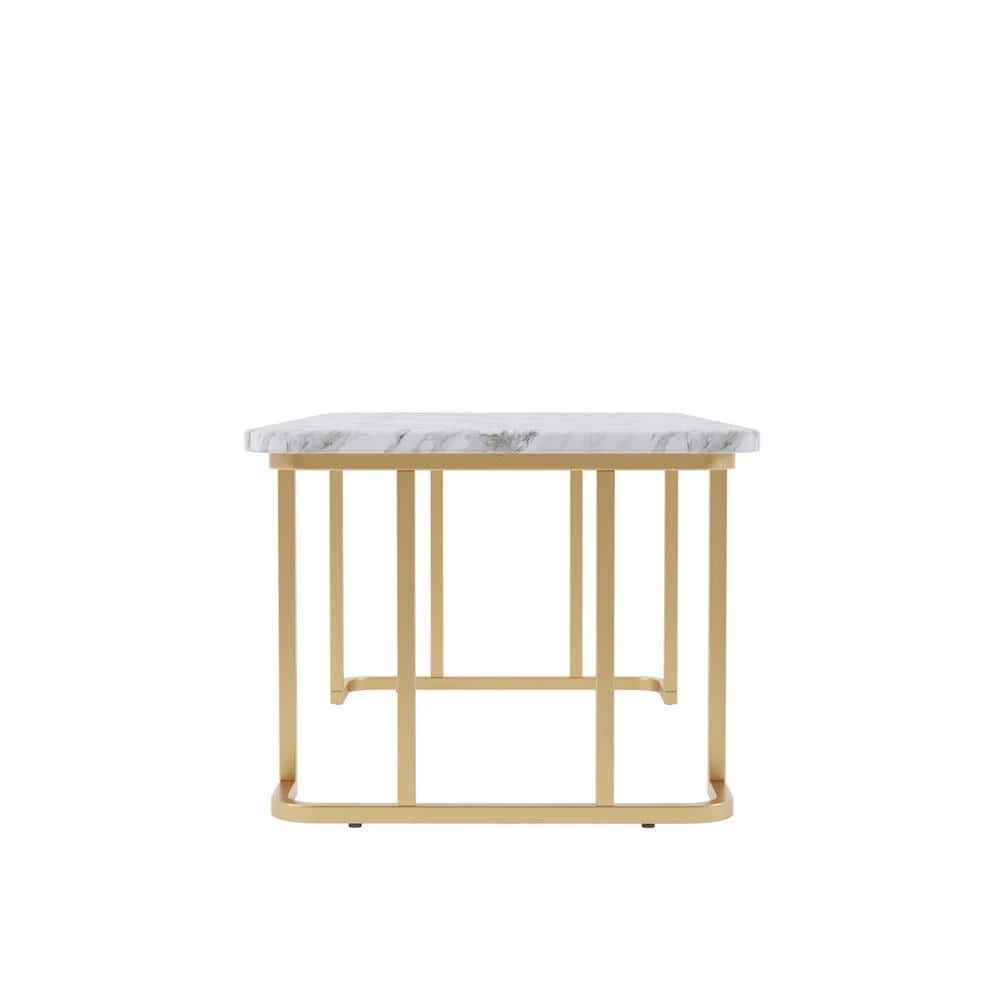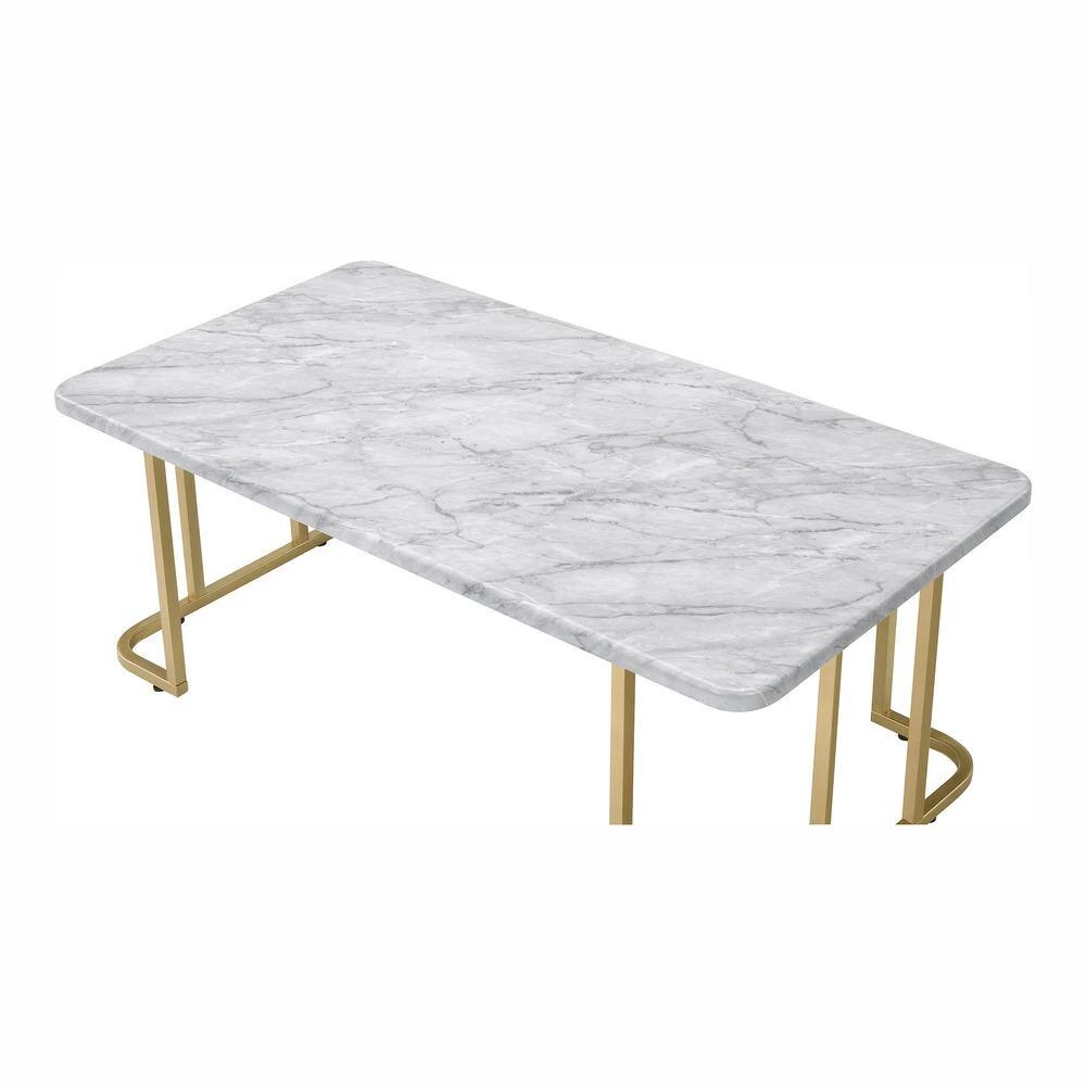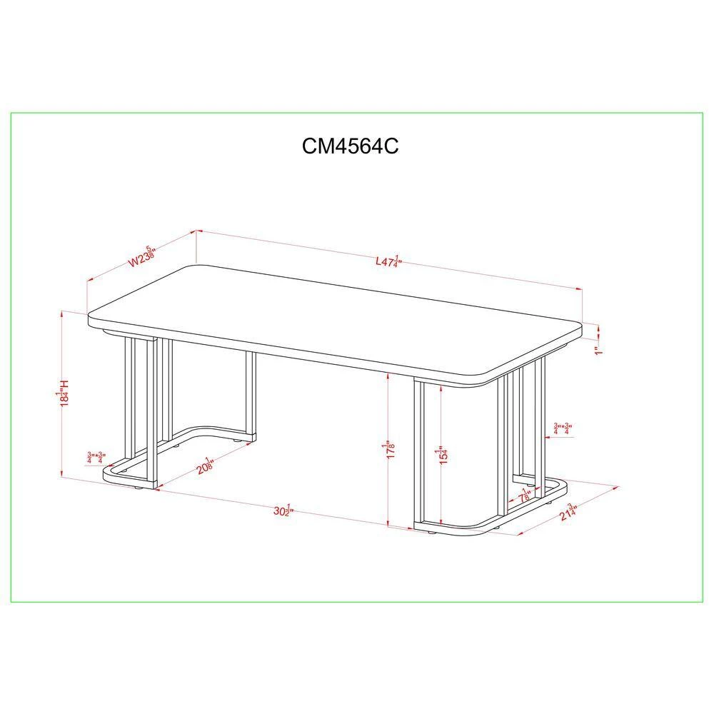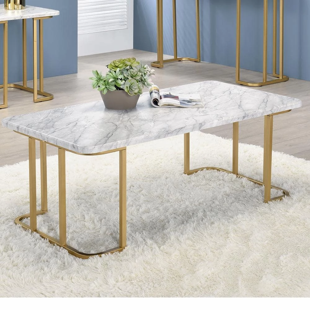No other coffee table will make the same impression of this steel and faux marble coffee table. Supported on two stylish legs, they provide an open design for an airy appearance. The rounded corners of the rectangular tabletop upgrade the aesthetics of this piece. Make this contemporary coffee table the focal point of your living room.