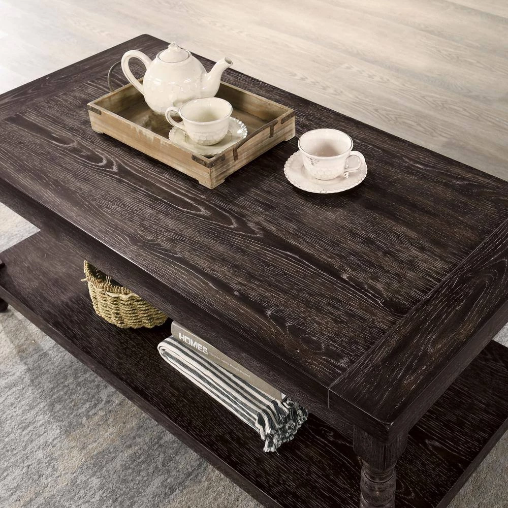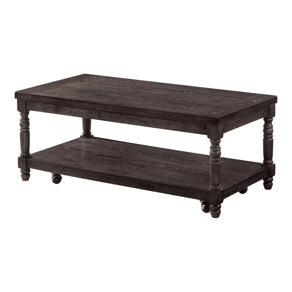 Amp up the charm factor in your living area with this rustic three-piece coffee table set. It includes 2-end tables to create a cohesive look and each table features a lovely weathered gray finish that imparts a sense of aged authenticity. Each table boasts a plank tabletop and the coffee table is further equipped with a plank shelf that adds space for display or storage.