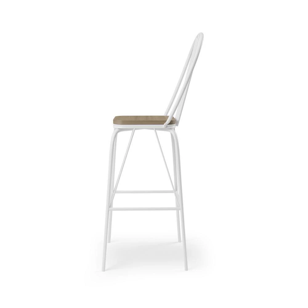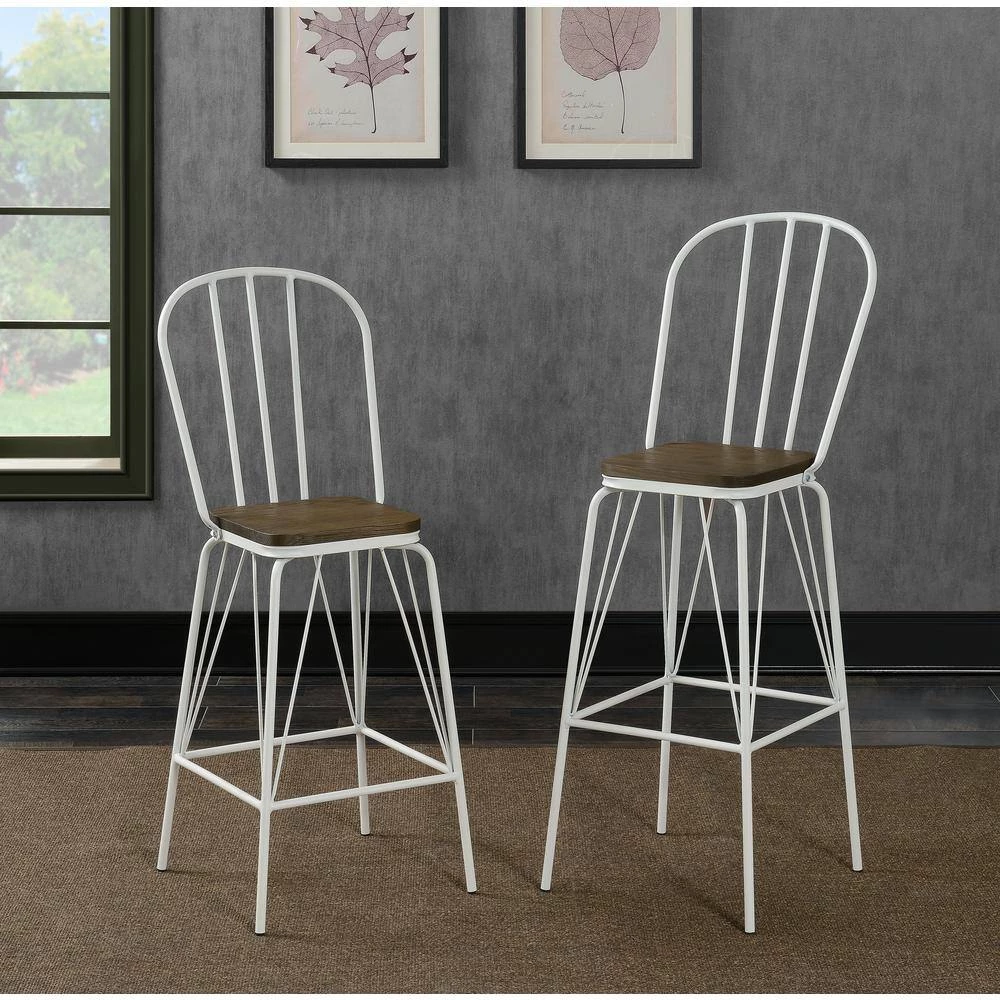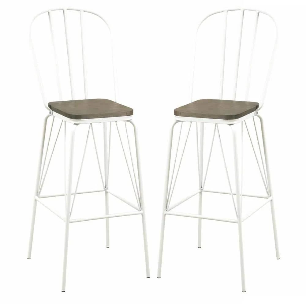 This bar stool brings charming cottage style to your home. The white finish and inviting Windsor backrests present a light and airy look, while the rounded wood veneer seats provide rich wood grain for contrast. Accentuated by darting metal supports, this Bar Stool elevates your home to light and airy cottage style.