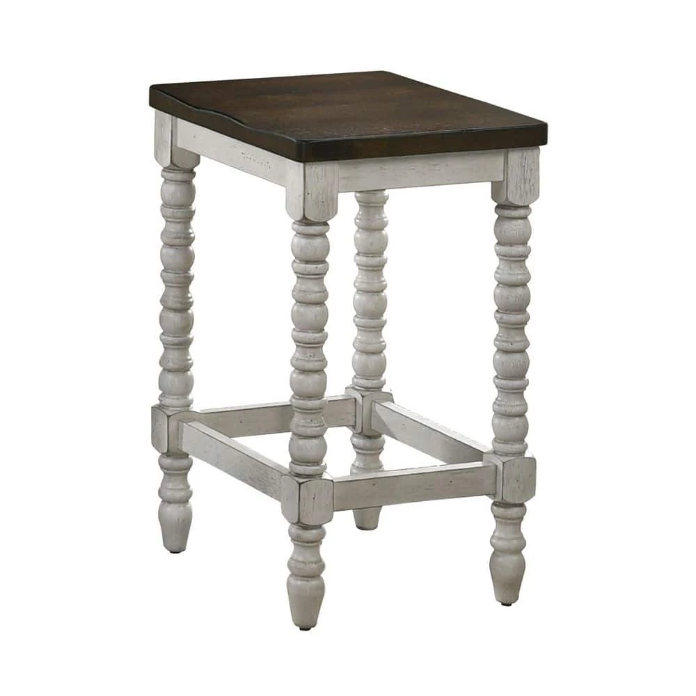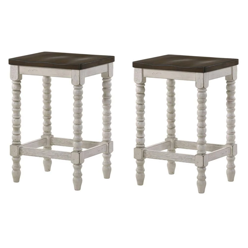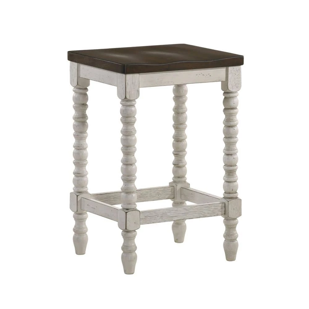Superb versatility blends with stellar style in this transitional counter height stool with a backless silhouette. Great for an eat-in kitchen or multi-functional dining space, the stool offers cottage inspired ambiance complete with bead texture on its frame and a built-in footrest that adds ample support and comfort. A two-tone finish that pairs an antique white base with a rich, dark walnut finish wood seat completes the look.