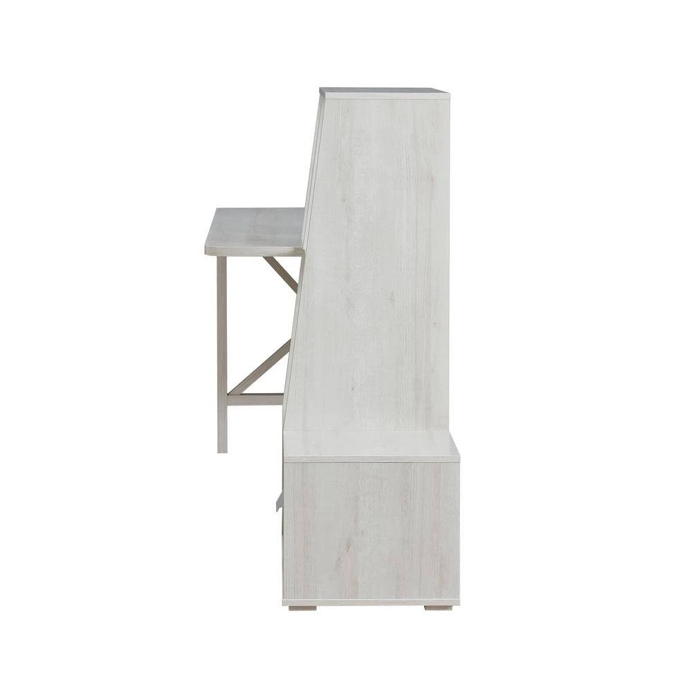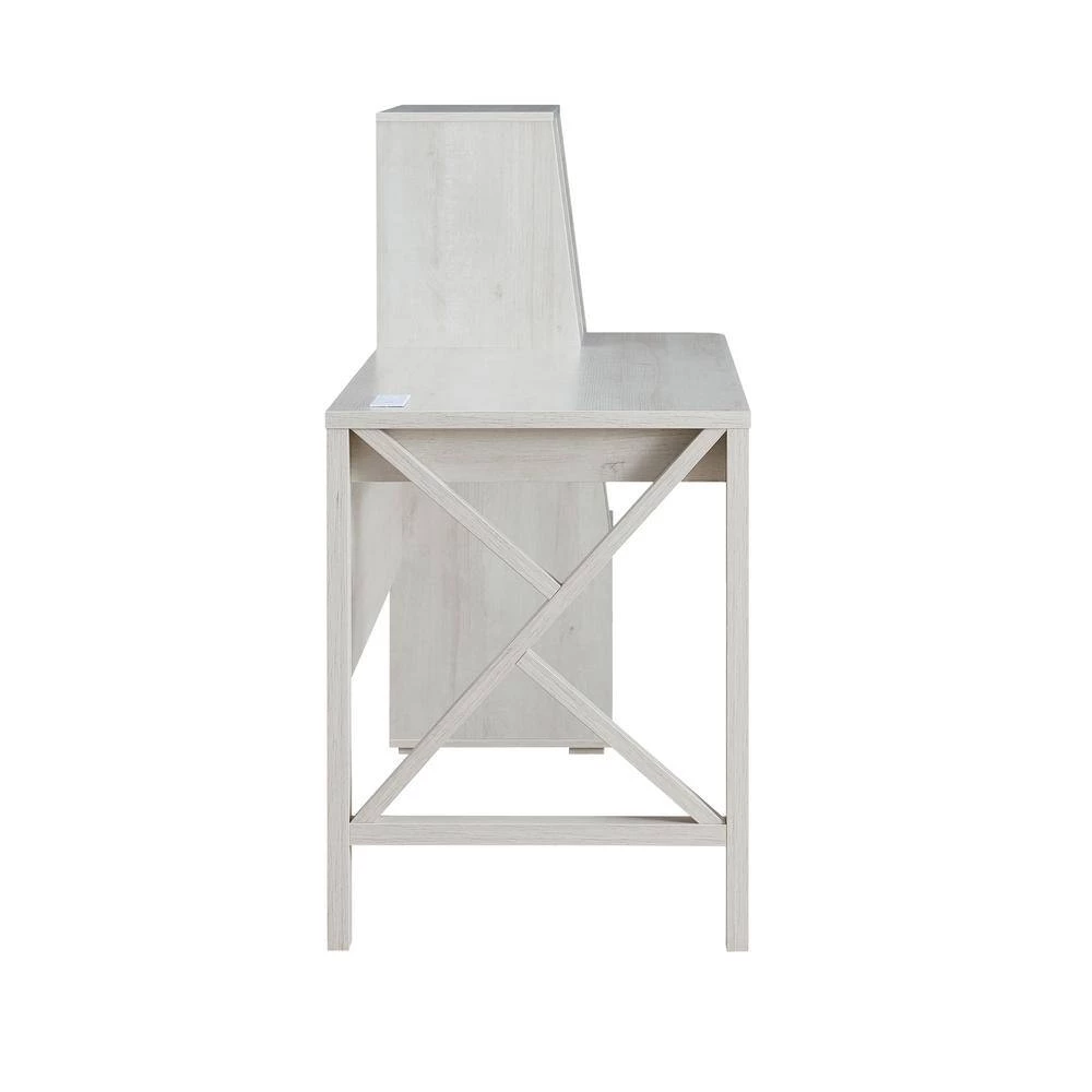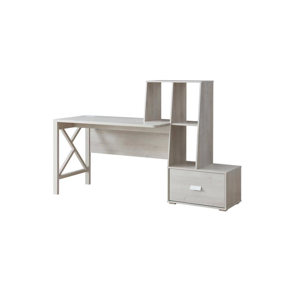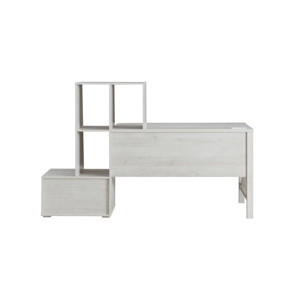 An unmatched geometrically conscious design forms this transitional desk. From the triangular collage silhouette of the legs to the slanted panel of the three open-backed shelves, this desk is functional and stylish. A single filing drawer sits on smooth metal glides while a USB port offers a charge on the desktop.