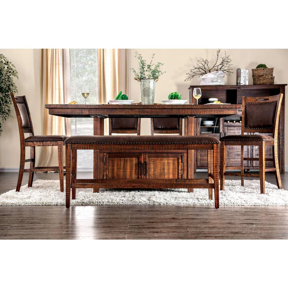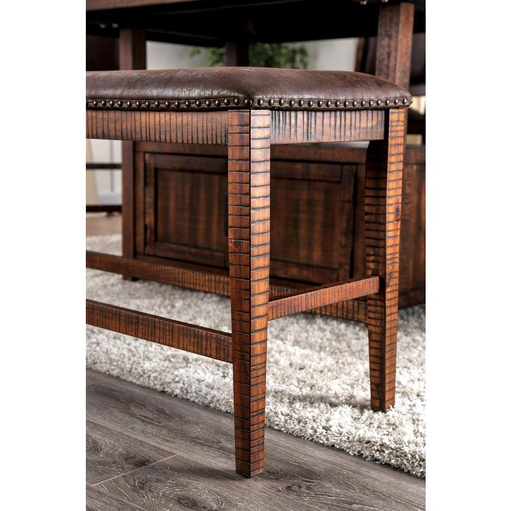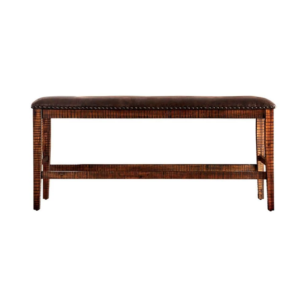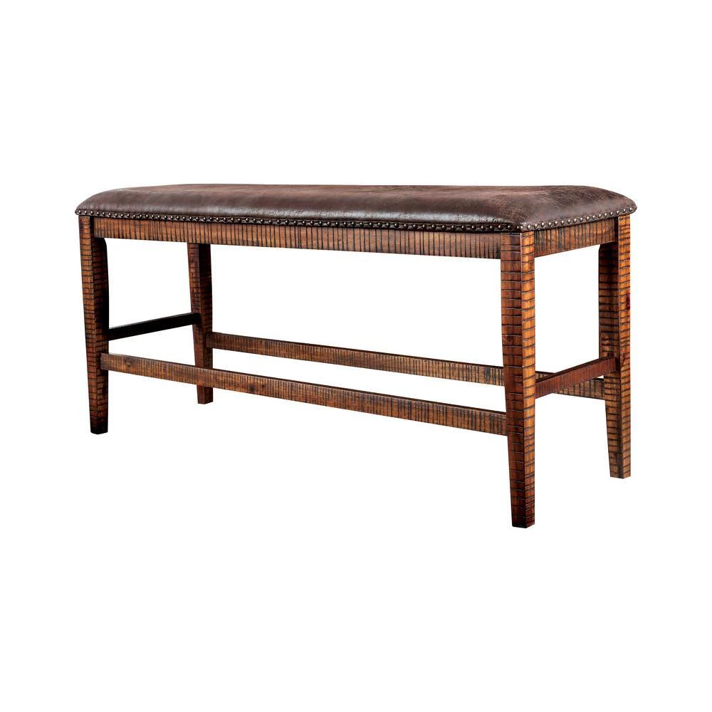 Enjoy the plush comfort and eye-catching style of this rustic counter height dining bench. Crafted with solid wood and wood veneer, it provides a supportive foundation for cozy, casual dining. Its seat is thickly padded and upholstered in soft leatherette material for an exceptional level of comfort.