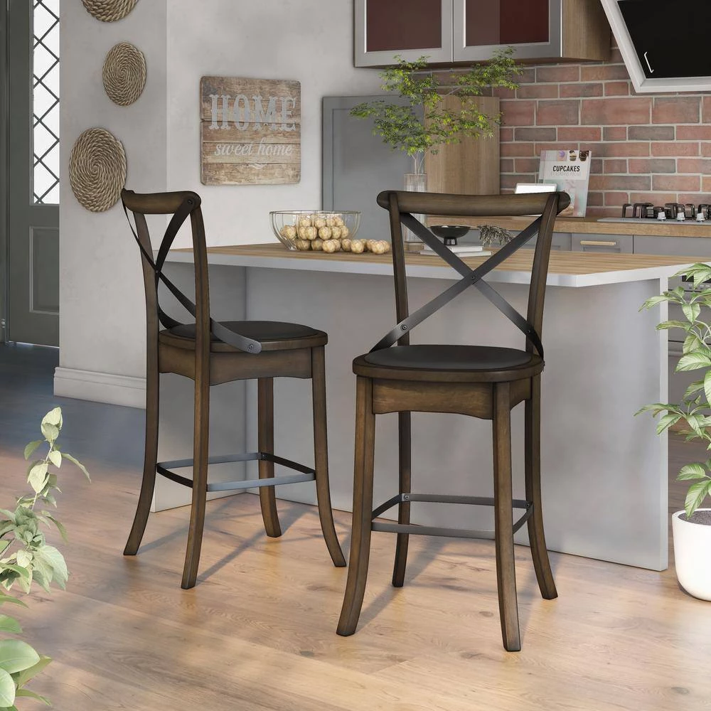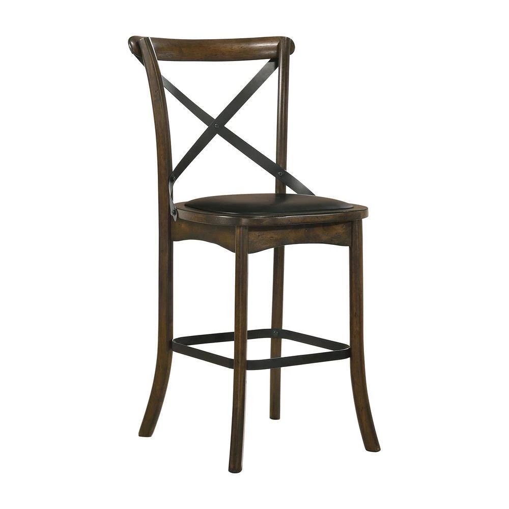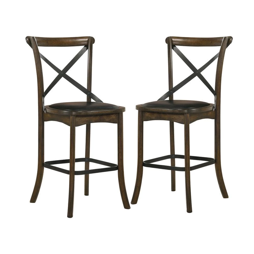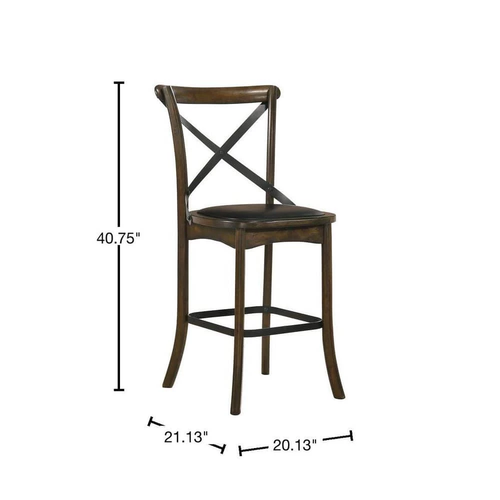 This pair of counter height chairs from the Renly collection makes a striking addition to your transitional style dining room table or kitchen island breakfast bar. With a burnished oak wood frame and an espresso leatherette padded seat, each chair provides a place to sit while taking casual meals with friends and family. Elegant touches truly complete this furniture piece, including gracefully tapered legs and an arched backrest with a metal cross-brace supports.