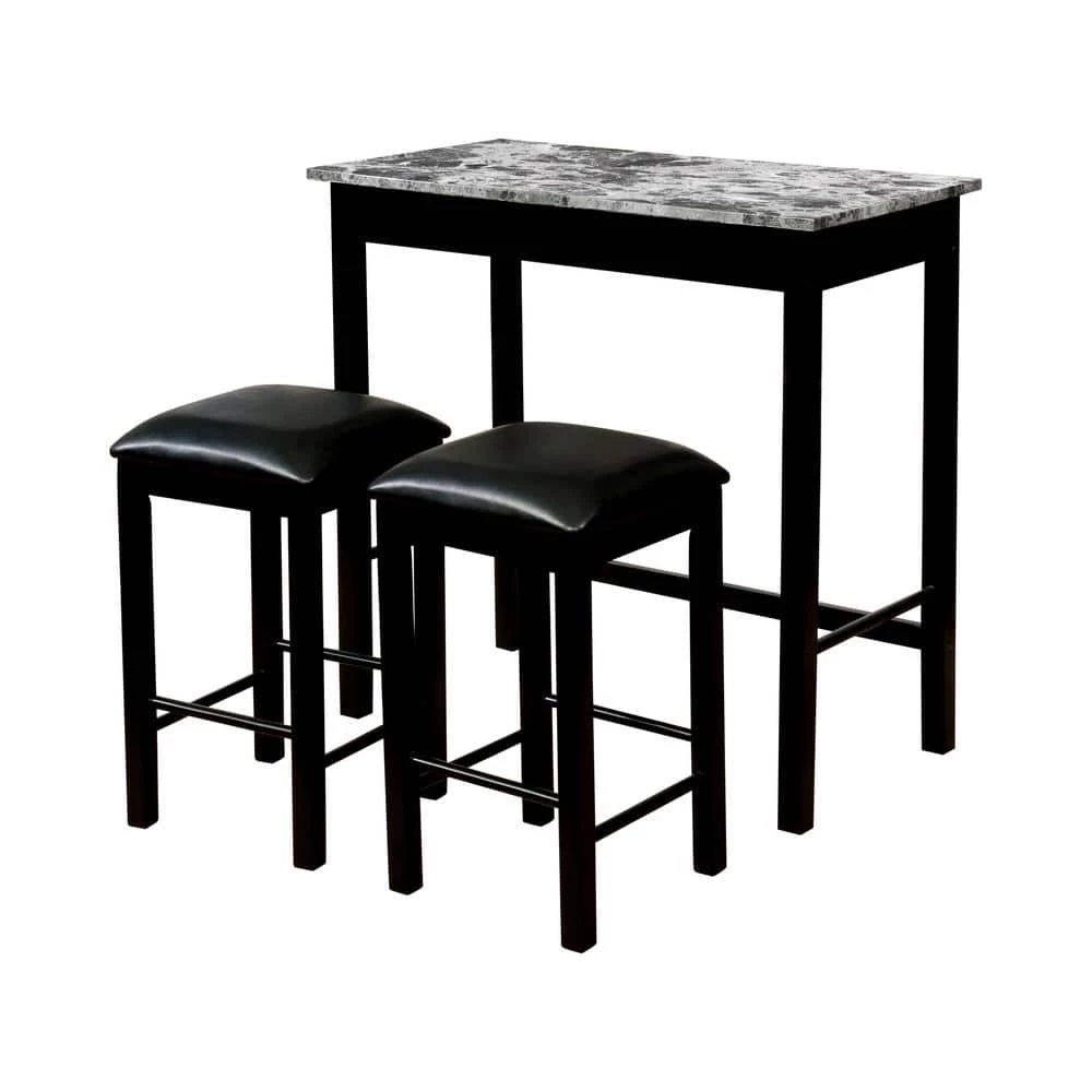 Designed for the Reta collection, this black counter height bar with two matching stools make the perfect addition for more intimate, contemporary style kitchens and dining spaces. Take your meals to the gray-tone, marble-like tabletop and grab a stool to sit for a while, or instead, stand for a quick, on-the-go snack. With a rectangular table, you can easily rest it flush against a wall or allow it to stand out perpendicular.