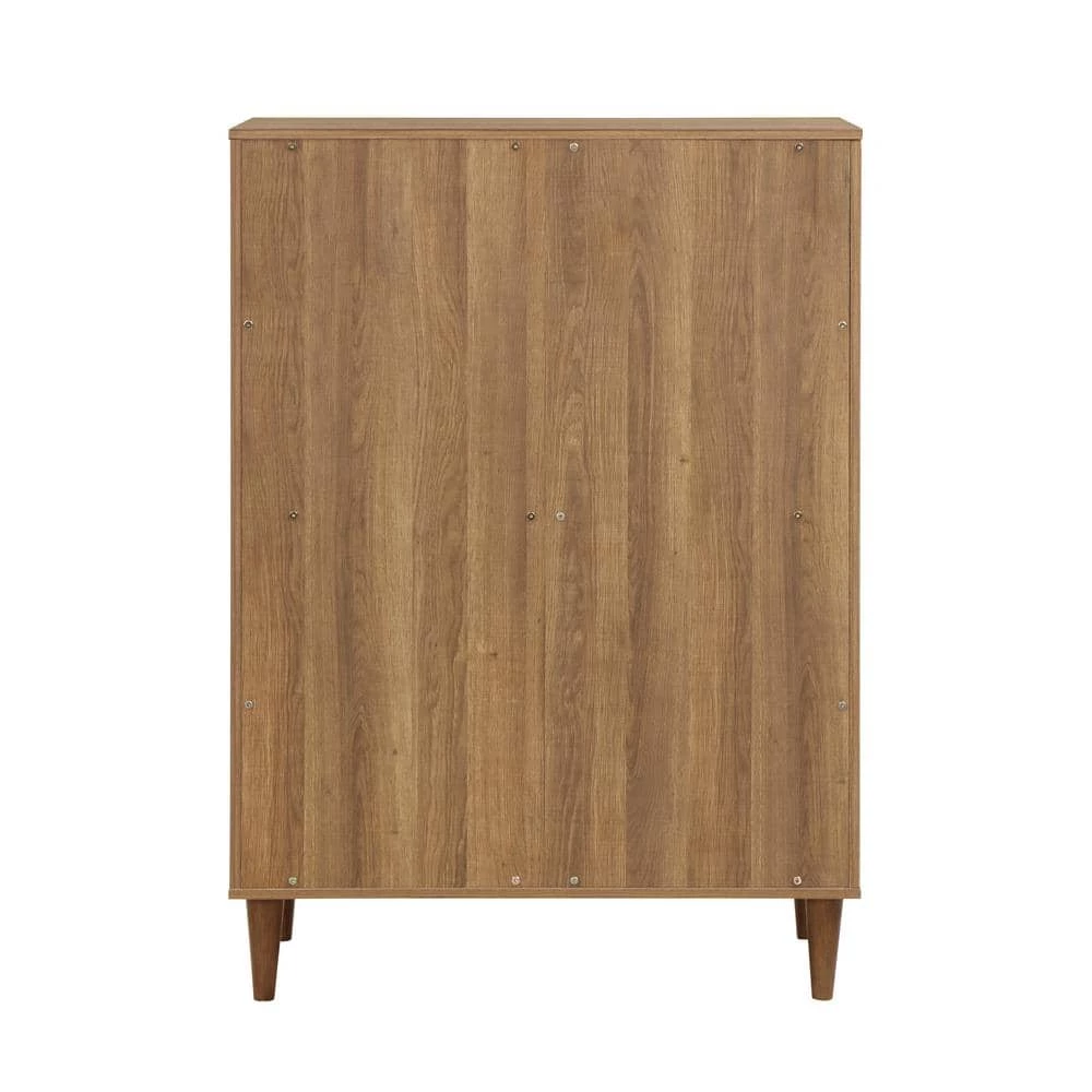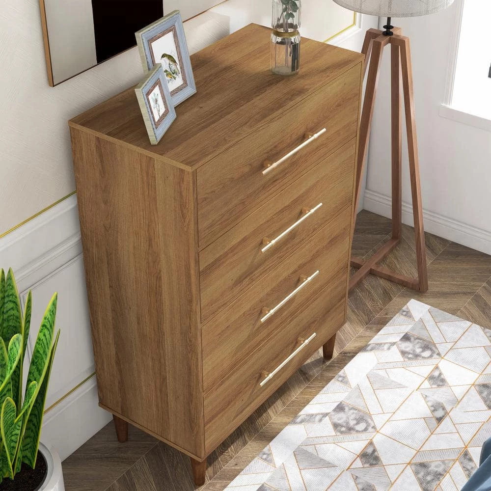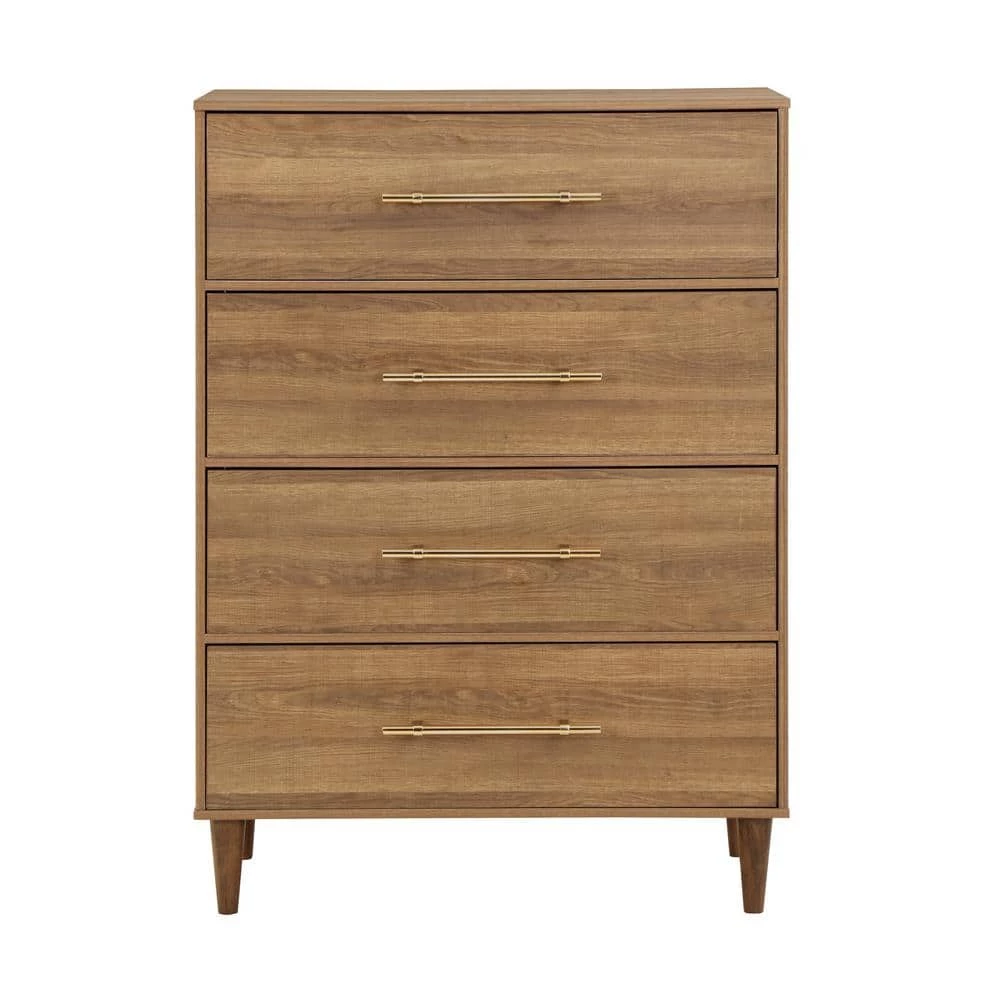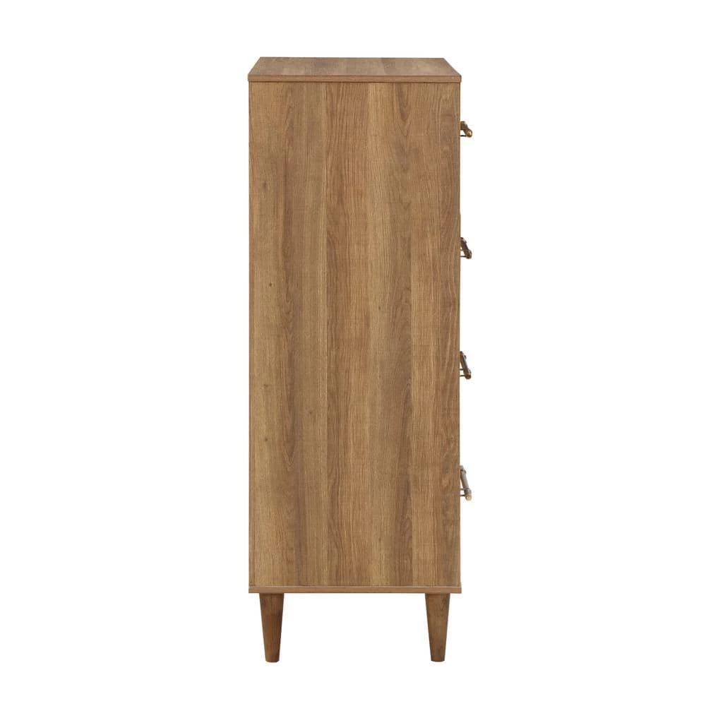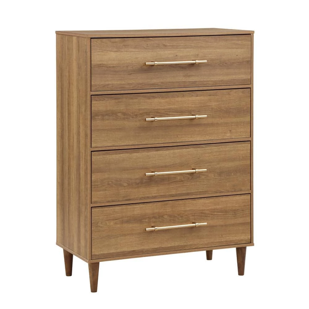 A chest of drawers with farmhouse charm sets the tone for the rest of your bedroom. This 4-drawer tall dresser boasts ample interior storage with spacious drawers perfect for everything from clothing and linens to hobby supplies. The chest features a light oak wood grain finish for a rustic touch, while long, sleek bar drawer pulls add a modern component. Tapered legs complete the look to perfection.