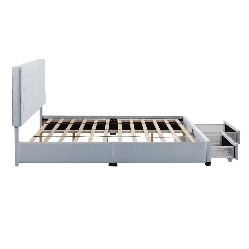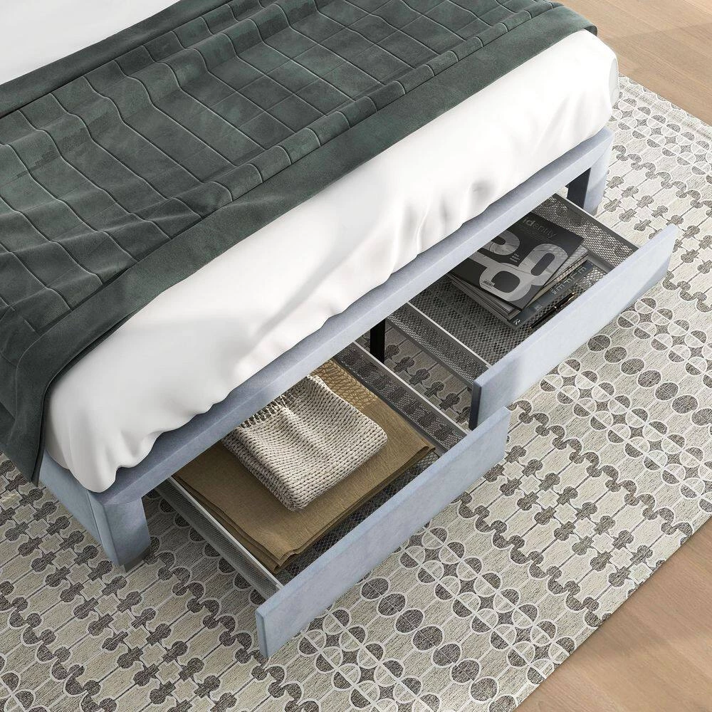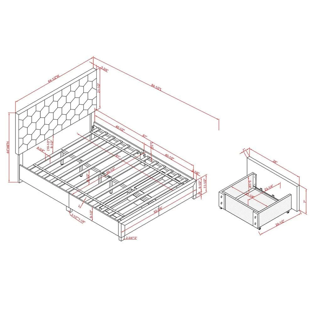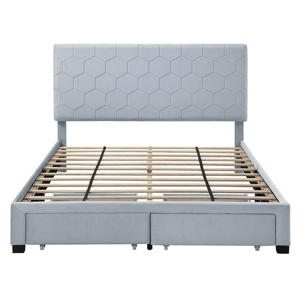 Beautifully upholstered platform bed features an upholstered headboard that adds a contemporary modern chic look to your bedroom and is filled with thick foam to add extra comfort. Sturdy wood frame construction and a wooden slat system to add extra stability and safety. The headboard, footboard, and sideboards are all upholstered in light gray linen-look fabric for an understated silhouette, with a hexagon accent design on the headboard for visual appeal.