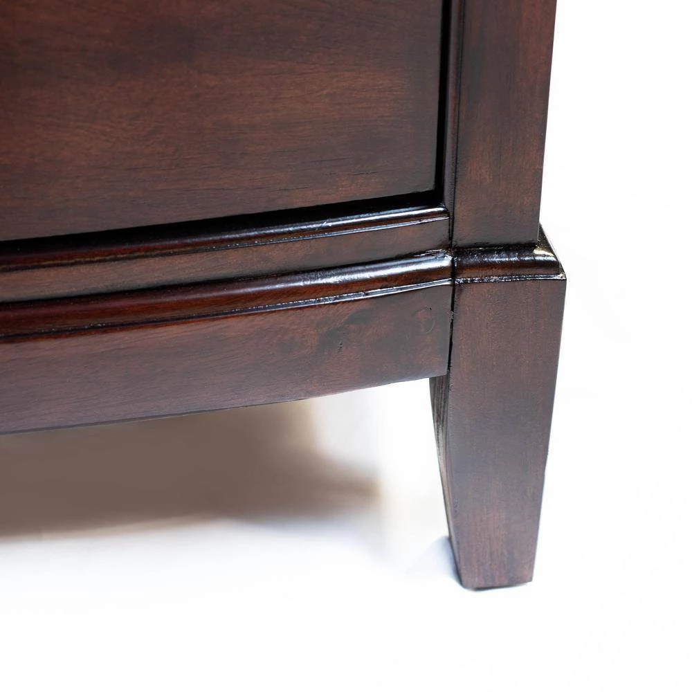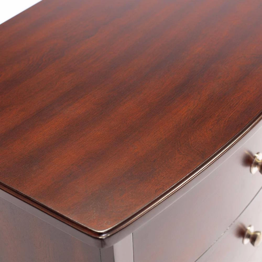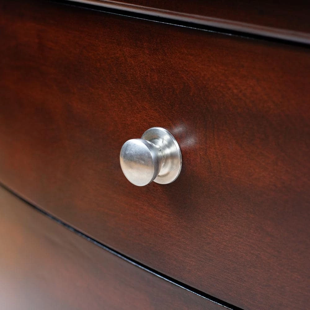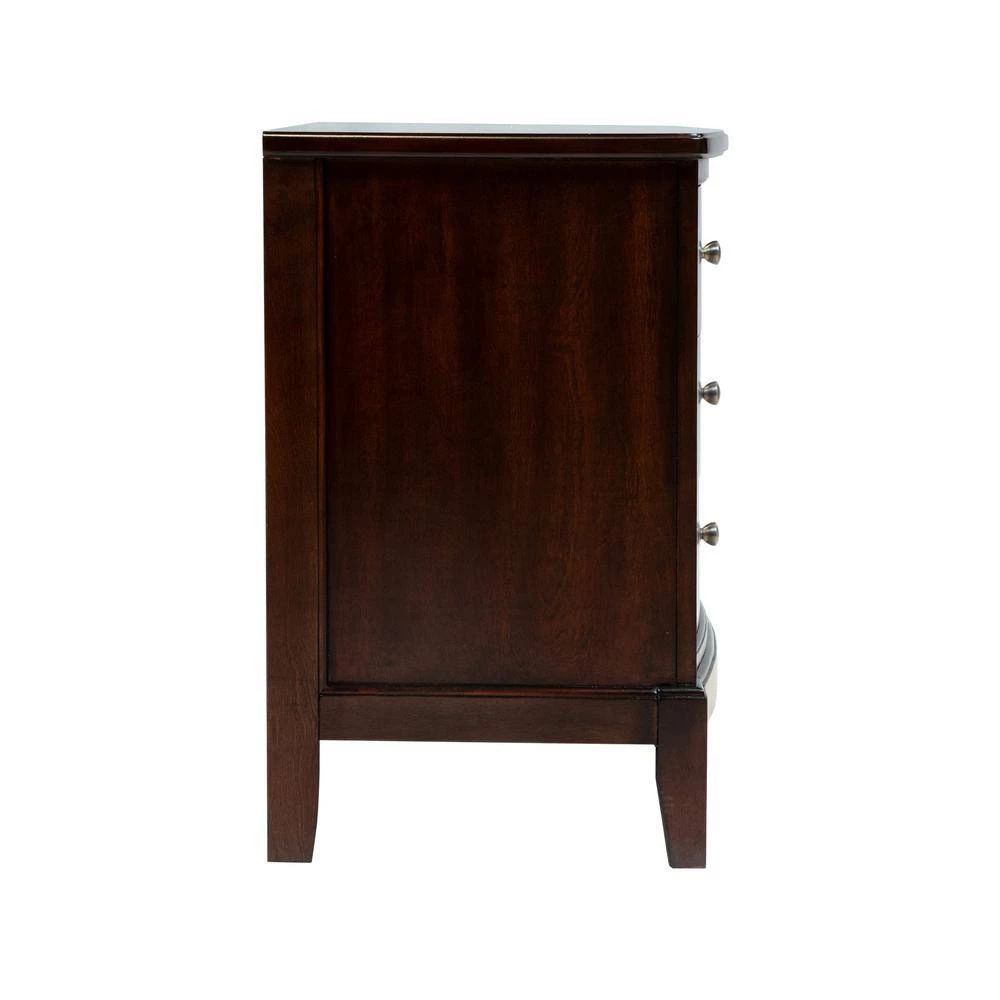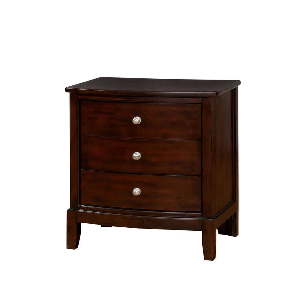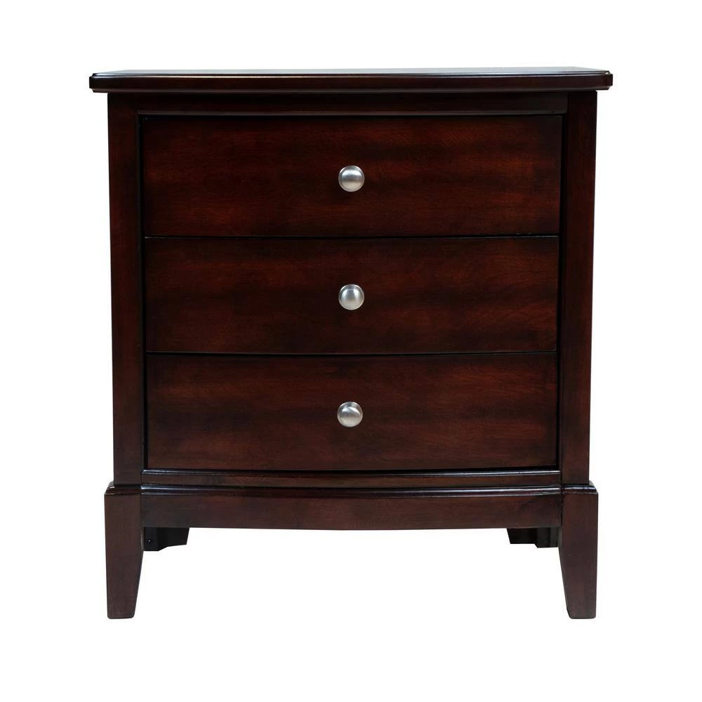 Smooth and chic, this transitional nightstand offers subtle style to enhance your bedroom’s appeal. The round metal knob pulls on each drawer provide easy handholds to make opening and closing the three drawers easy on their center metal glides. The tapering legs support the entire piece, which is finished in a welcoming brown cherry color. This nightstand is constructed from wood and wood veneers for strong stability.