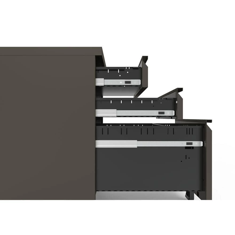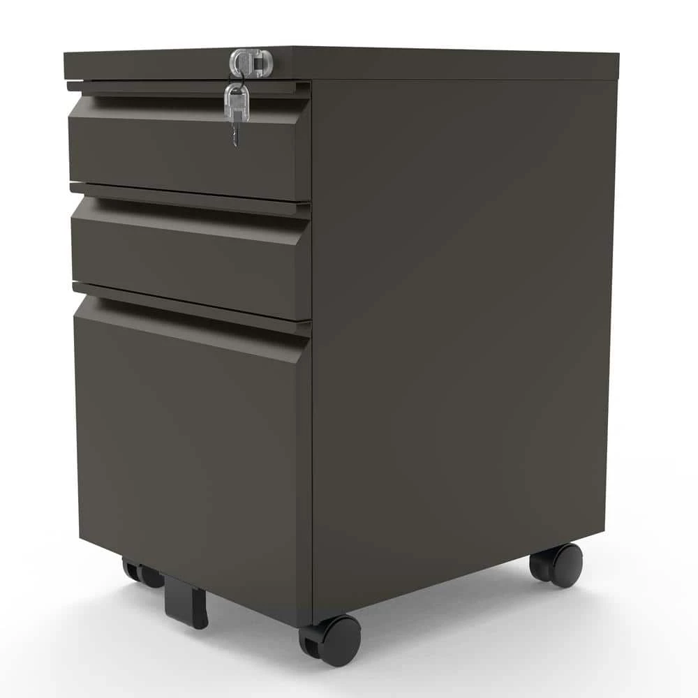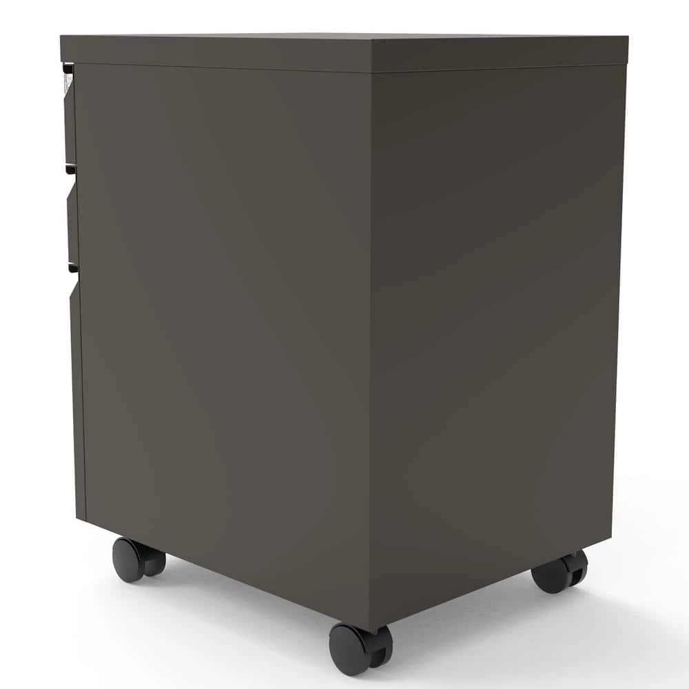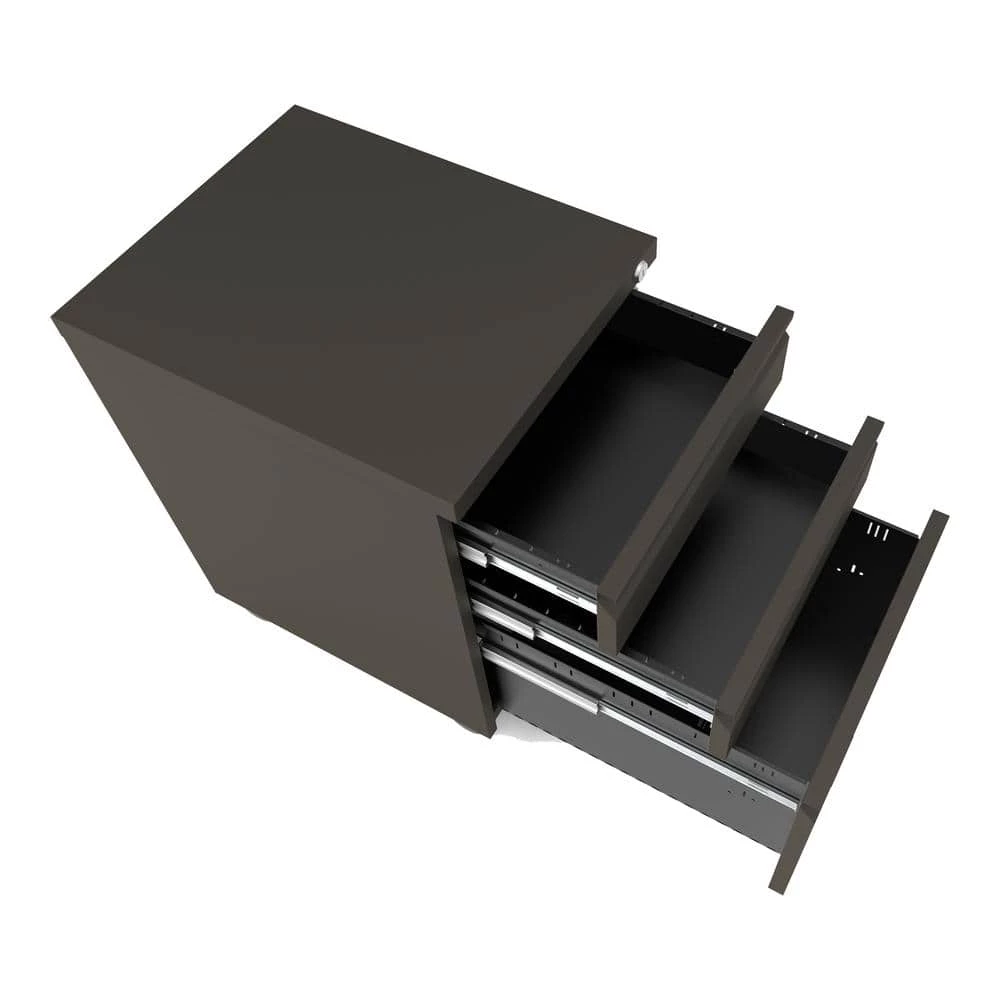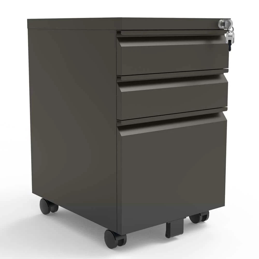Get your office organization up to date with the ease and convenience of this contemporary gun metal three-drawer filling cabinet. Featuring metal construction, the cabinet feature fingertip pull drawers for easy access as a lock ensures security for delicate information. Two smaller upper drawers host paperwork or office accessories and essentials, while the larger lower drawer keeps files upright and easily organized for quick access.