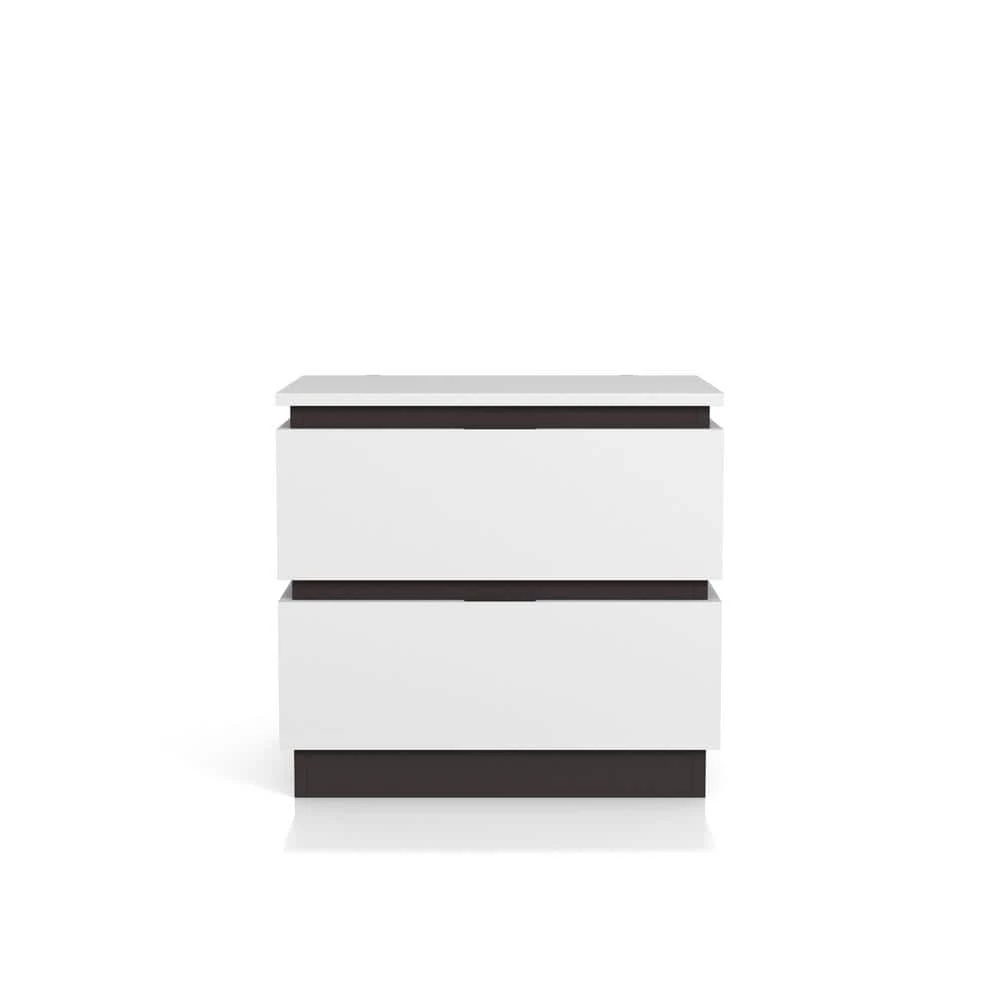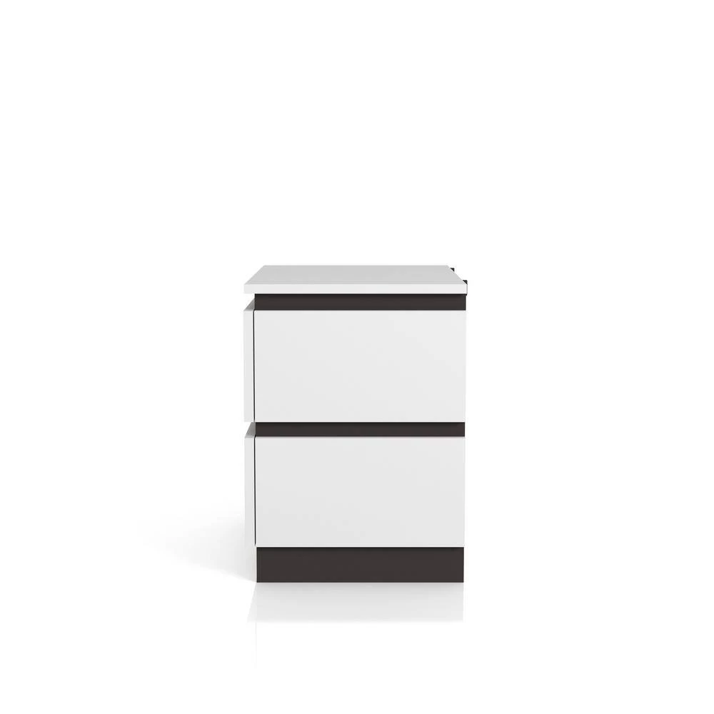 This visually striking, contemporary two-drawer nightstand boasts horizontal metallic gray lines set against crisp white panels in a lustrous high gloss finish for a bold, contrasting effect. A symmetrical frame shows off this two-tone design, creating clean lines with a hint of intrigue. A tiered base mimics the duality, pushing the flush and sleek ultra-modern drawers of this daring furniture piece. This frame is made from recycled lumber, which had its beggings on a rubber tree farm. To prevent the traditional waste of natural resources through burning, rubber trees are retired into furniture.