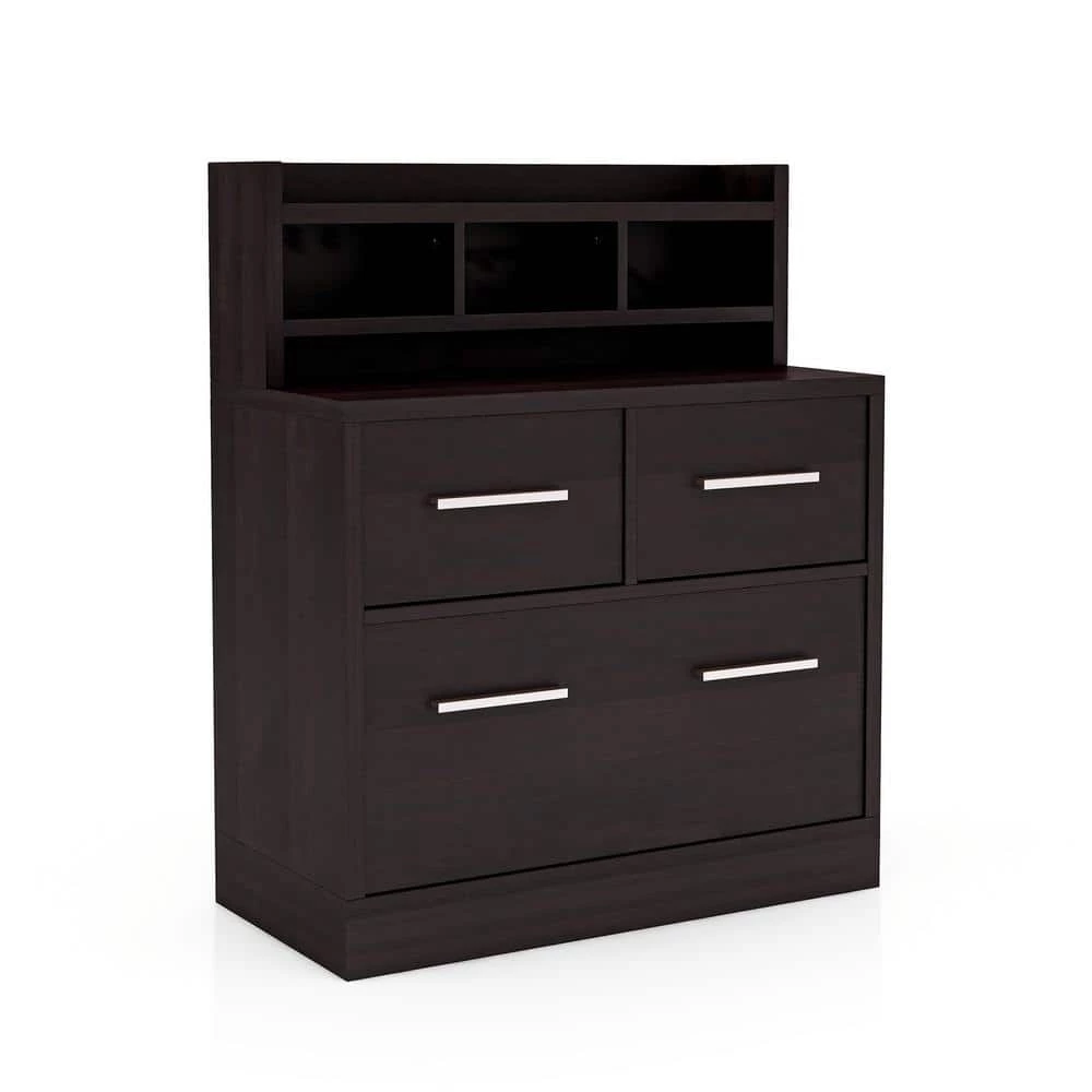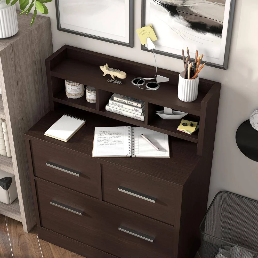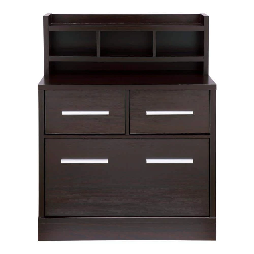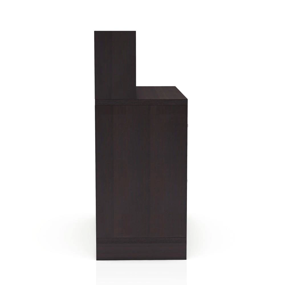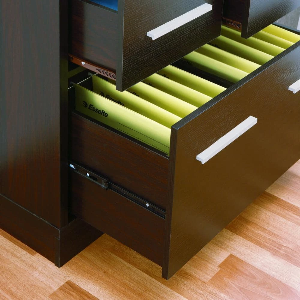 Simple elegance comes from style and sophistication. Beautiful Table features contemporary style fit for any home office. Finished in lustrous Cappuccino and detailed with chrome drawer handles, it creates sleek visual interest. Multiple drawers of varying sizes accommodate all your office paperwork, supplies and more in its spacious storage compartments. Great for staying organized, it beautifies your office and adds functionality while adding to a tasteful design scheme. Holds up to 100 lbs.