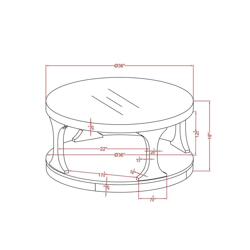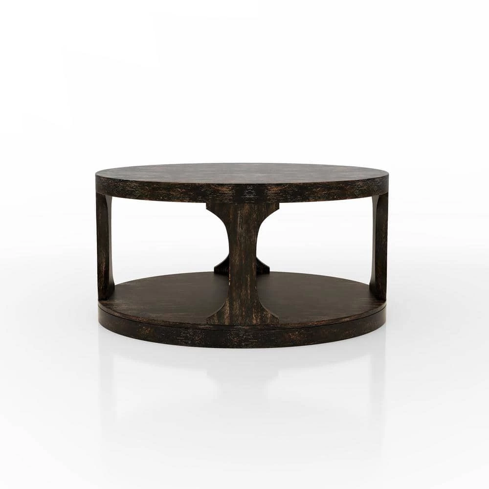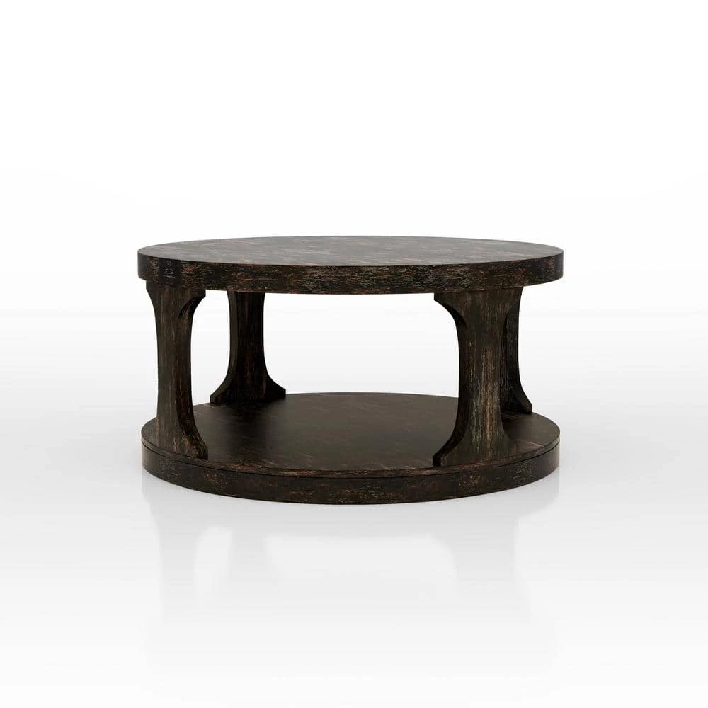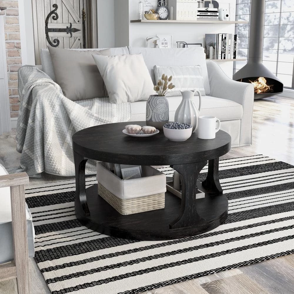 This transitional solid wood coffee table offers ample space for storage while also showcasing an attractive open design. Both the tabletop and lower shelf feature a circular shape and are finished in antique black, showing off their intricate wood grain. Supported atop concave posts, this table’s open design provides plenty of space beneath the tabletop to display your favorite decorations where everyone can admire them.