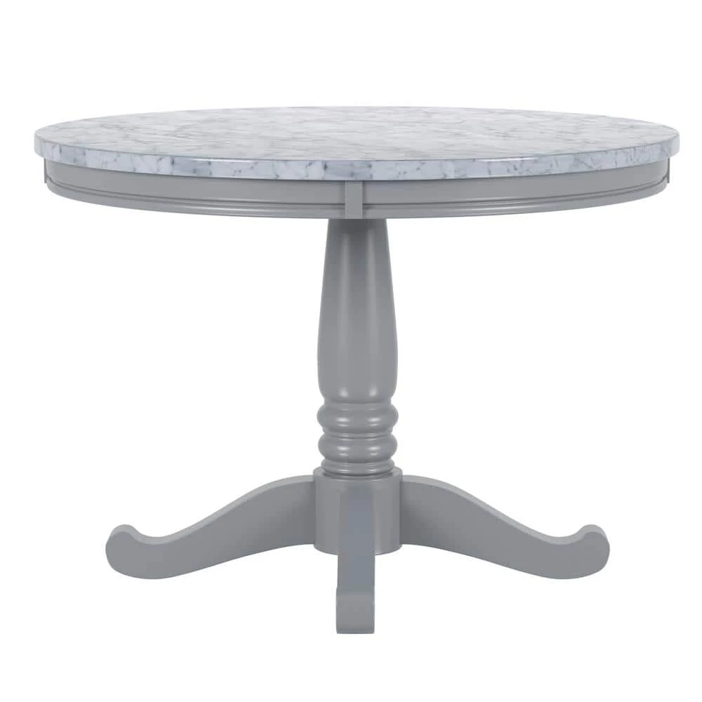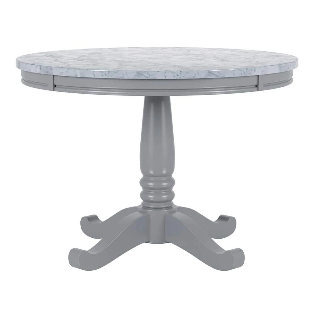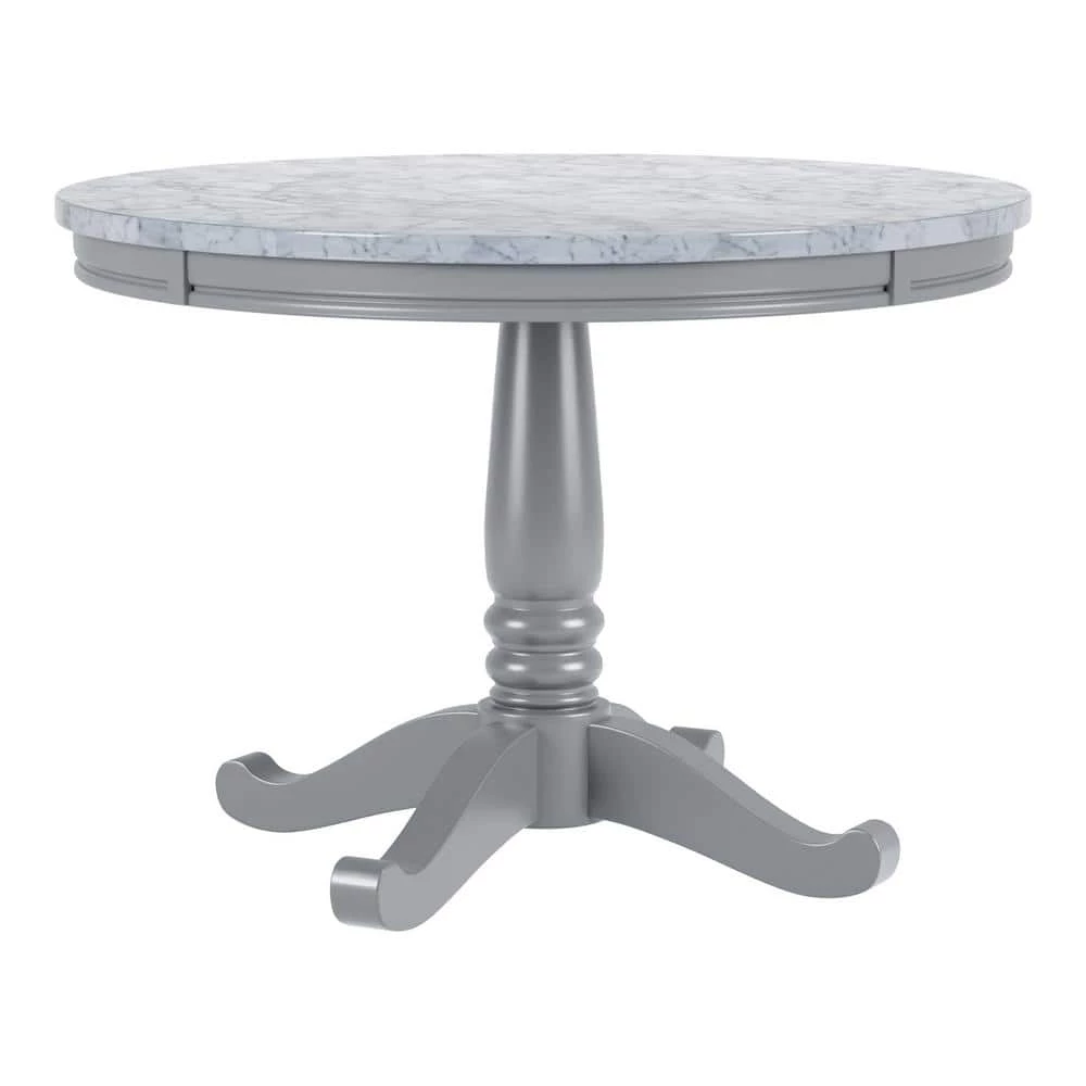 Put the finishing touches on a sophisticated breakfast nook or small dining space with this charming transitional dining table. Designed with a classic cottage-inspired pedestal base replete with trim details and rounded curves, this round table features a faux marble finish tabletop that lends an elegant aura. This small dining table is ideal for compact spaces or for a breakfast nook or eat-in kitchen.