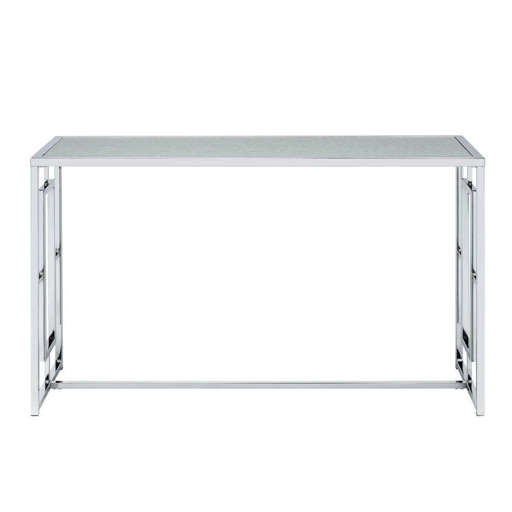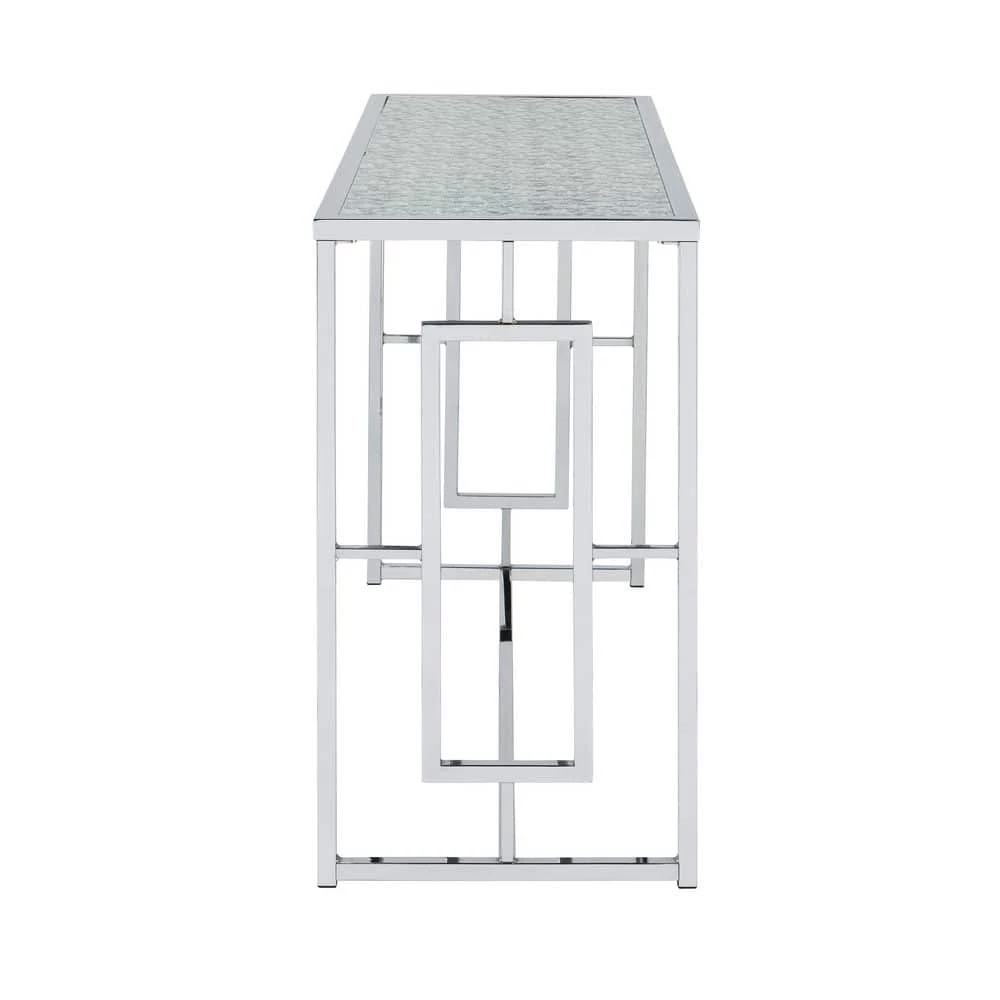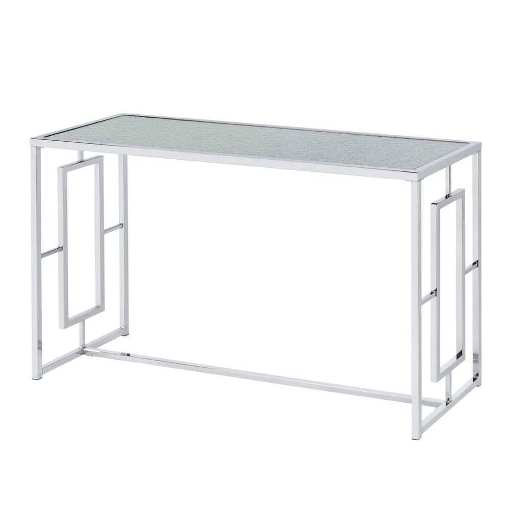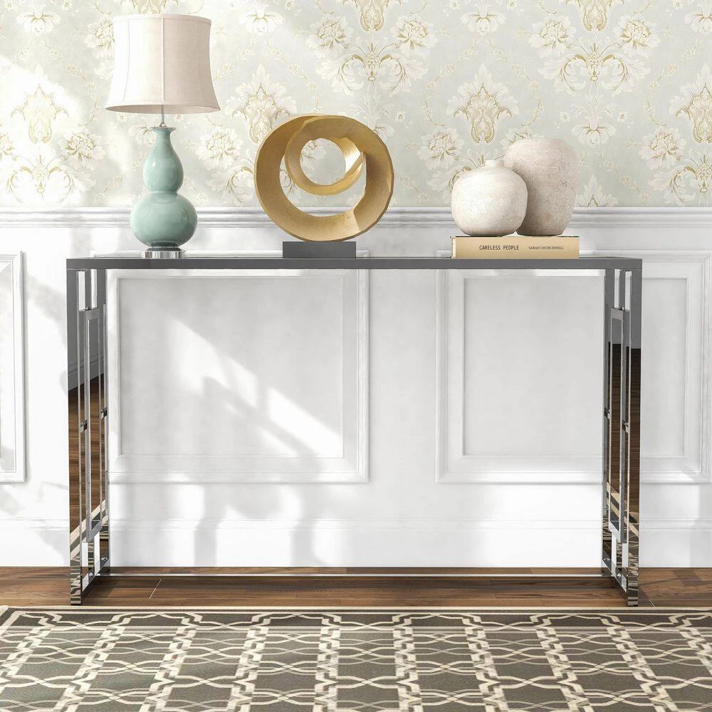 A perfect entryway design for your home’s personality, the console table is perfect for showcasing family photos in the living room or hallway, serving as a catch-all for keys and mail in the foyer, or hoisting glasses of water behind the couch. Wherever you place it, pick one that’s in line with the personality of your home Crafted from a metal frame paired with a silver chrome finish with a sleek ripple pattern glass top, it showcases a glam look perfect for adding modern style to your entryway.