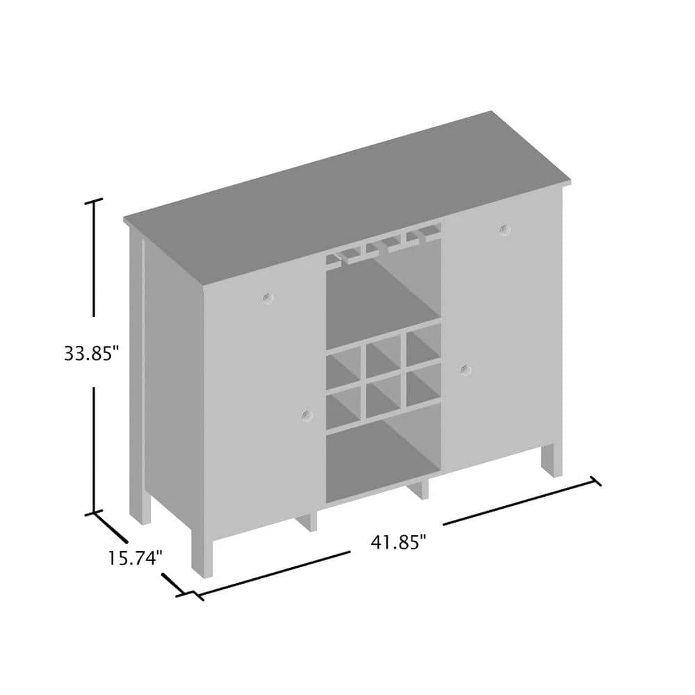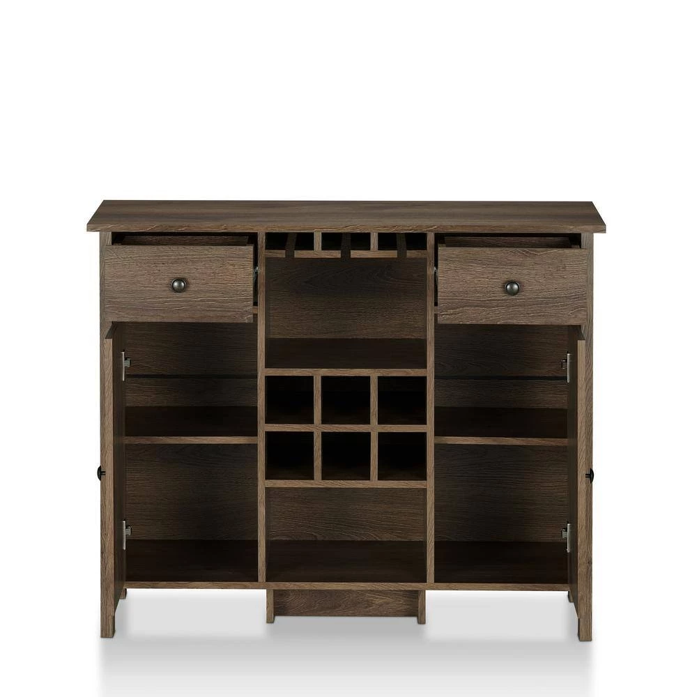This beautiful wine cabinet with a distressed walnut inspired finish, doors & drawers provide the ultimate in style to dress up your home. The two deep drawers provide an abundance of storage space. Behind the two doors, you will find adjustable shelves and storage space for things that you prefer to be out of sight. The center storage area is great for up to 6 bottles of wine, while the fixed stemware rack offers style, function, and quality make this wine cabinet a wise addition to your home.