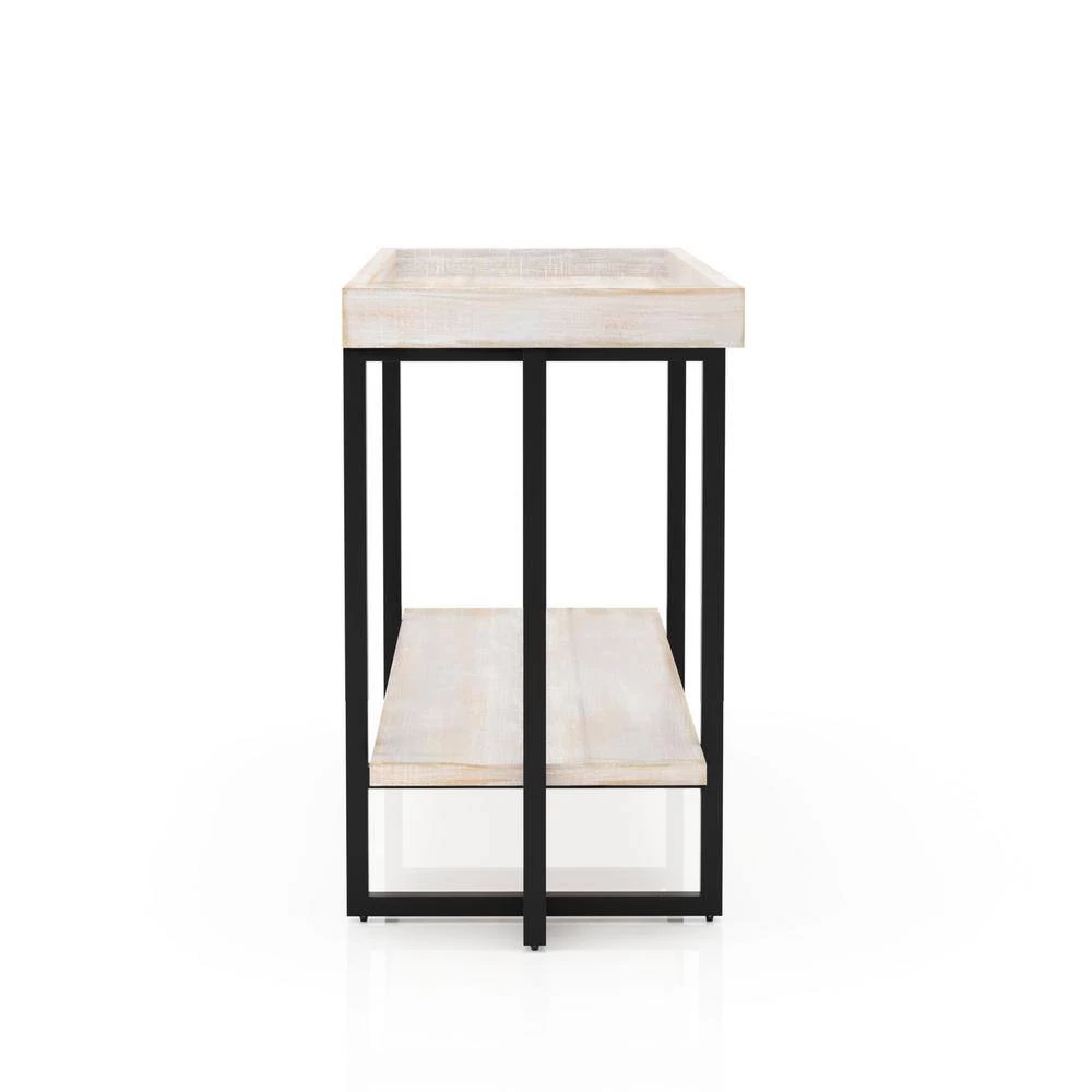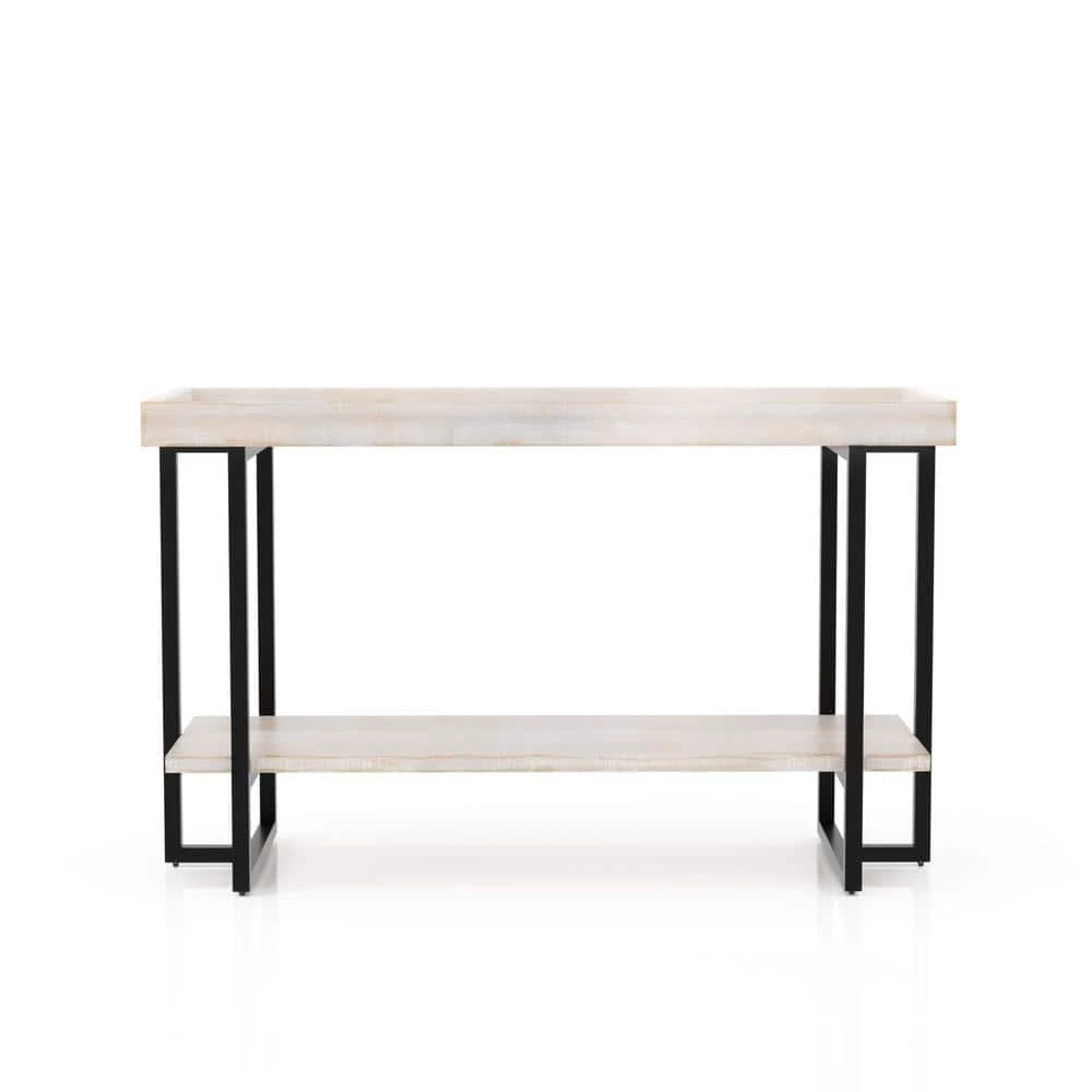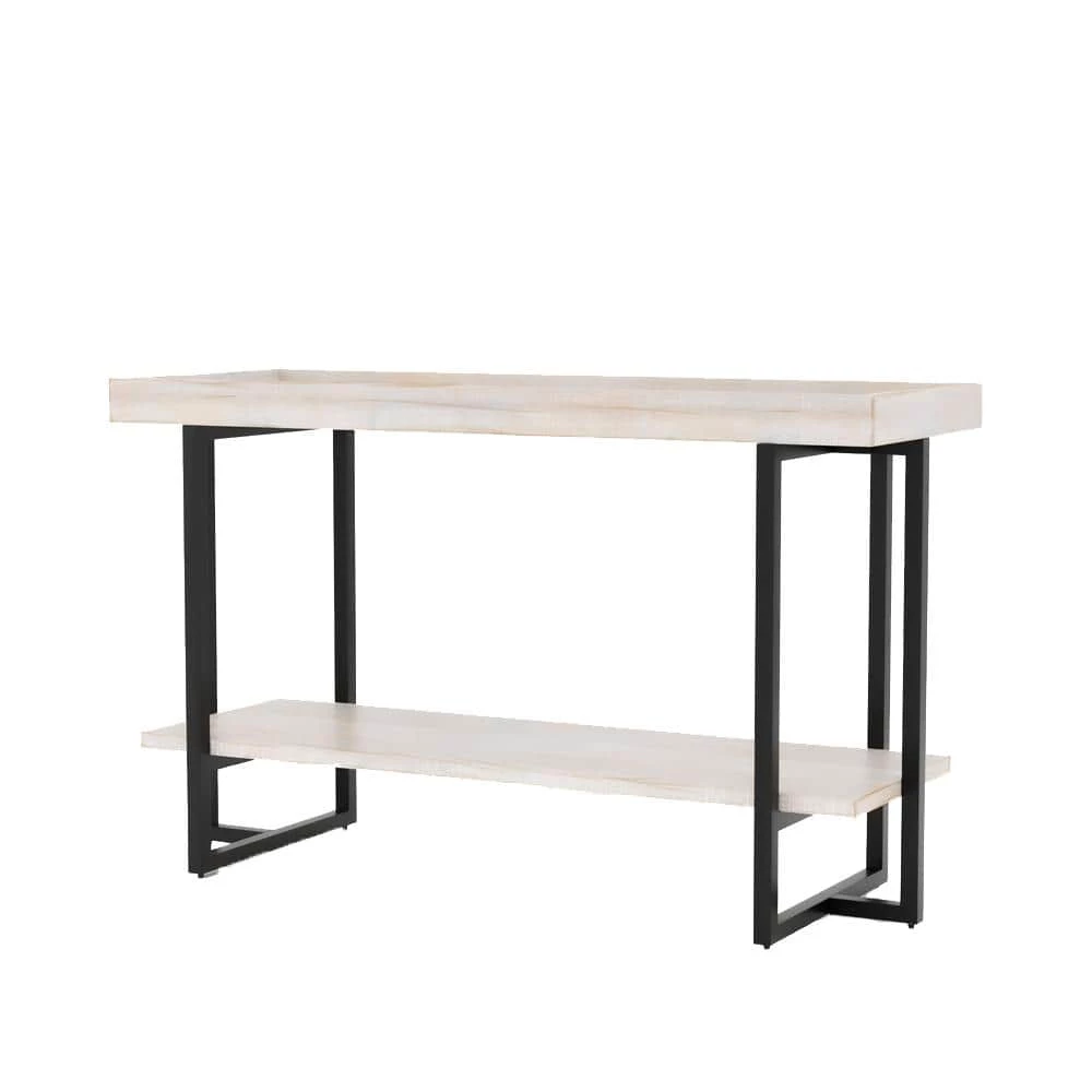 Clean lines lend a simple, minimalist touch to the rustic flair of this transitional wood and metal console table. Beautifully built, the table boasts a metal frame in a dark finish that contrasts perfectly against an antiqued tabletop and lower shelf. Its geometric design enhances any space, while lending versatile style that works in contemporary, nautical, rustic or contemporary decor.