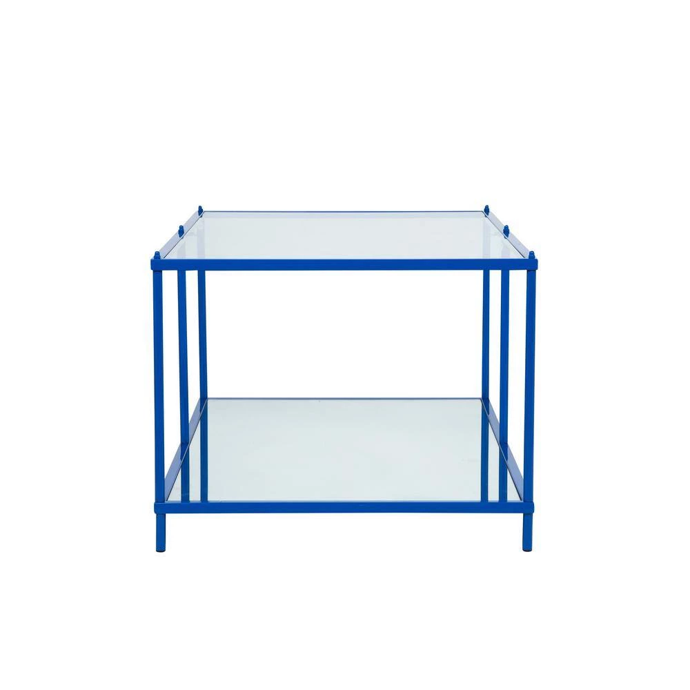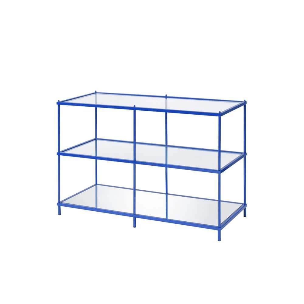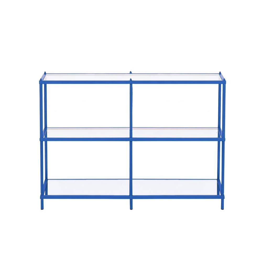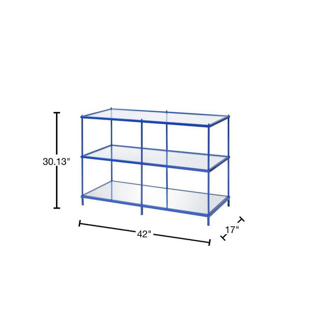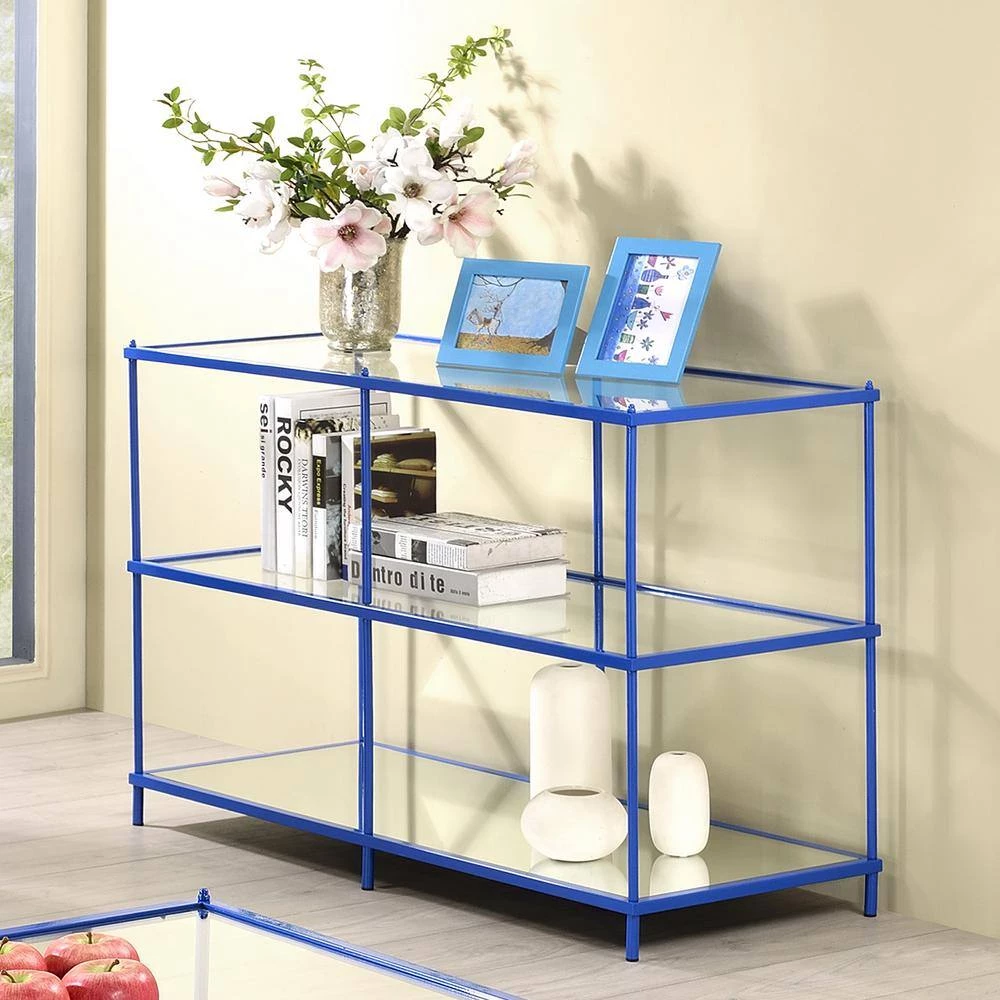 Instantly bring modern vibes into your living space with this glass and mirror console table with a bold, vibrant metal frame. Coming in your choice of three eye-catching finishes, the steel frame creates a captivating impression while adding a bold dose of color. The tabletop is constructed of tempered glass while the two mirrored shelves offers a perfect place to display photo frames and more.