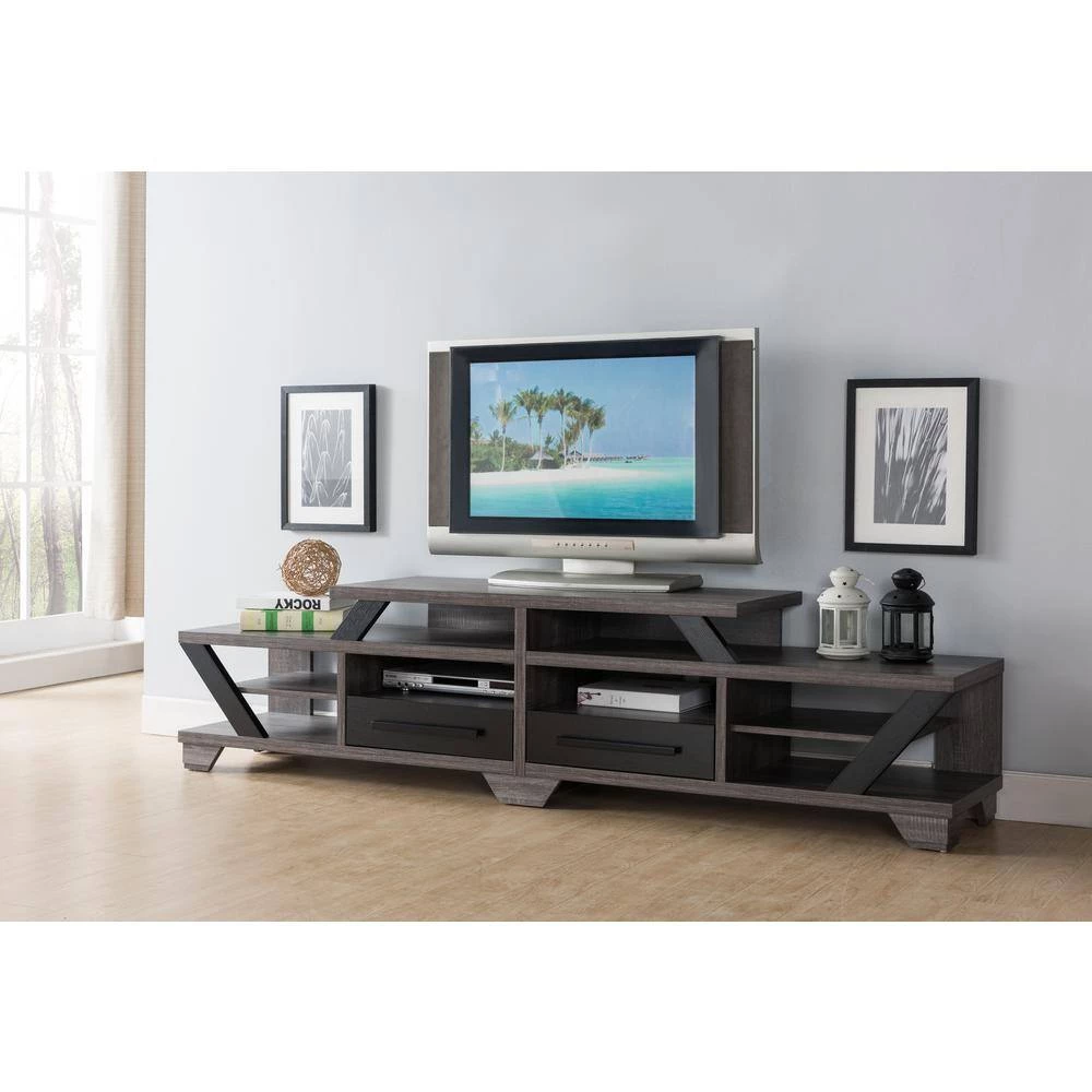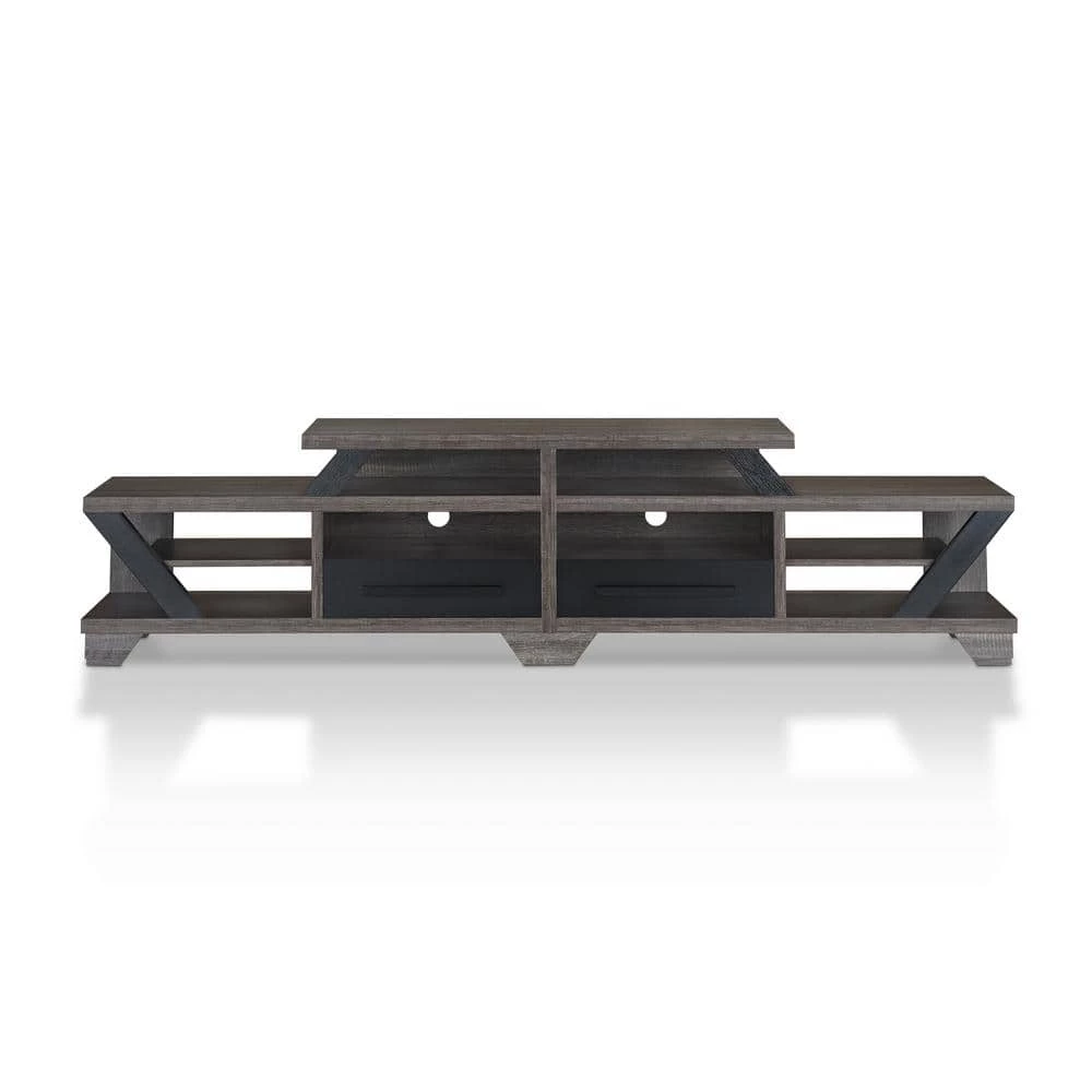 The Vegah Wood tv Stand from Furniture of America captures attention with its sophisticated tiered design and 2-tone black and distressed gray finish. Multiple open shelves with rear access wiring and roomy drawers offer spacious storage for devices, games and other entertainment essentials. The clean linear lines are accented with angular supports to bring out the one of a kind design.