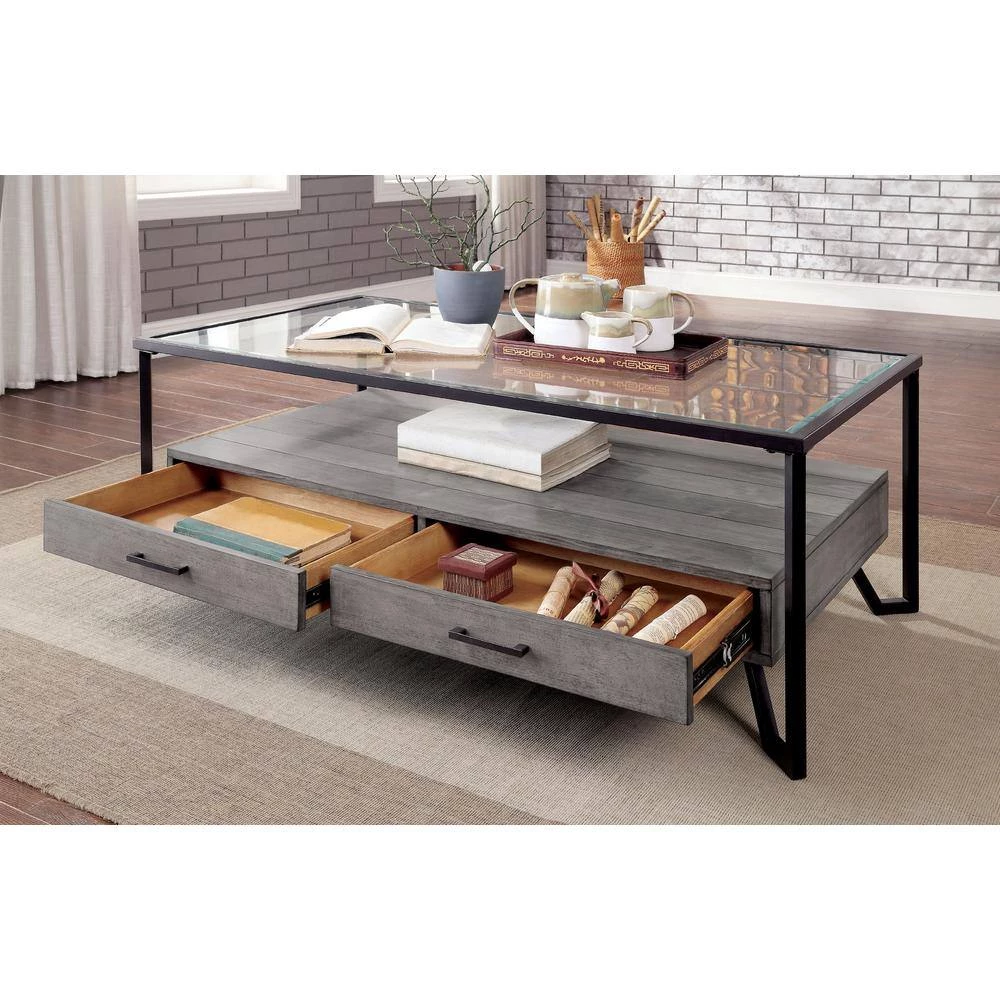 With clean lines and an open design, this industrial style coffee table from the Vihaan collection works nicely rested in front of a living room sofa. With a gray finish bottom drawer and shelf below and a tempered glass top above, this coffee table offers an airy look that is sure to lighten up a space. Additionally, there are extra details such as two long, thin drawer pulls as well as a black frame with legs that curl back under to support the drawer base.