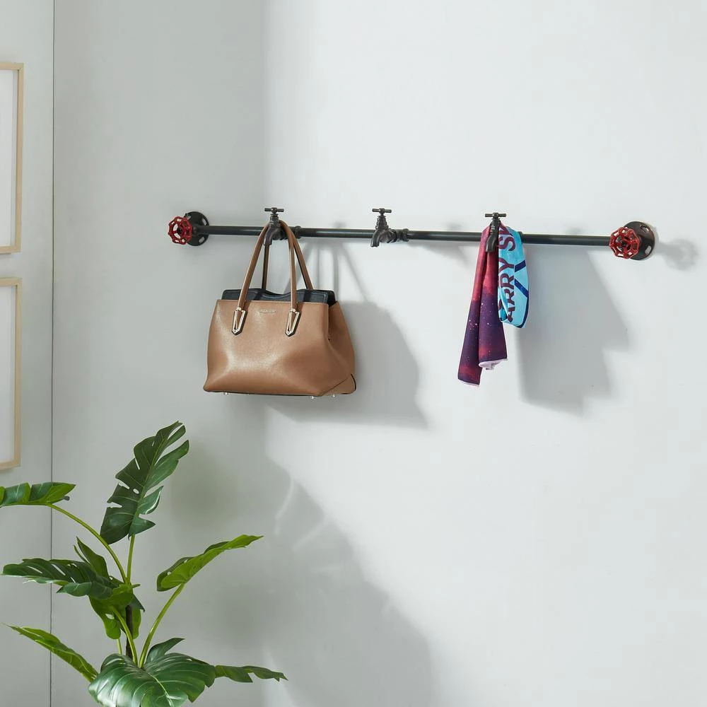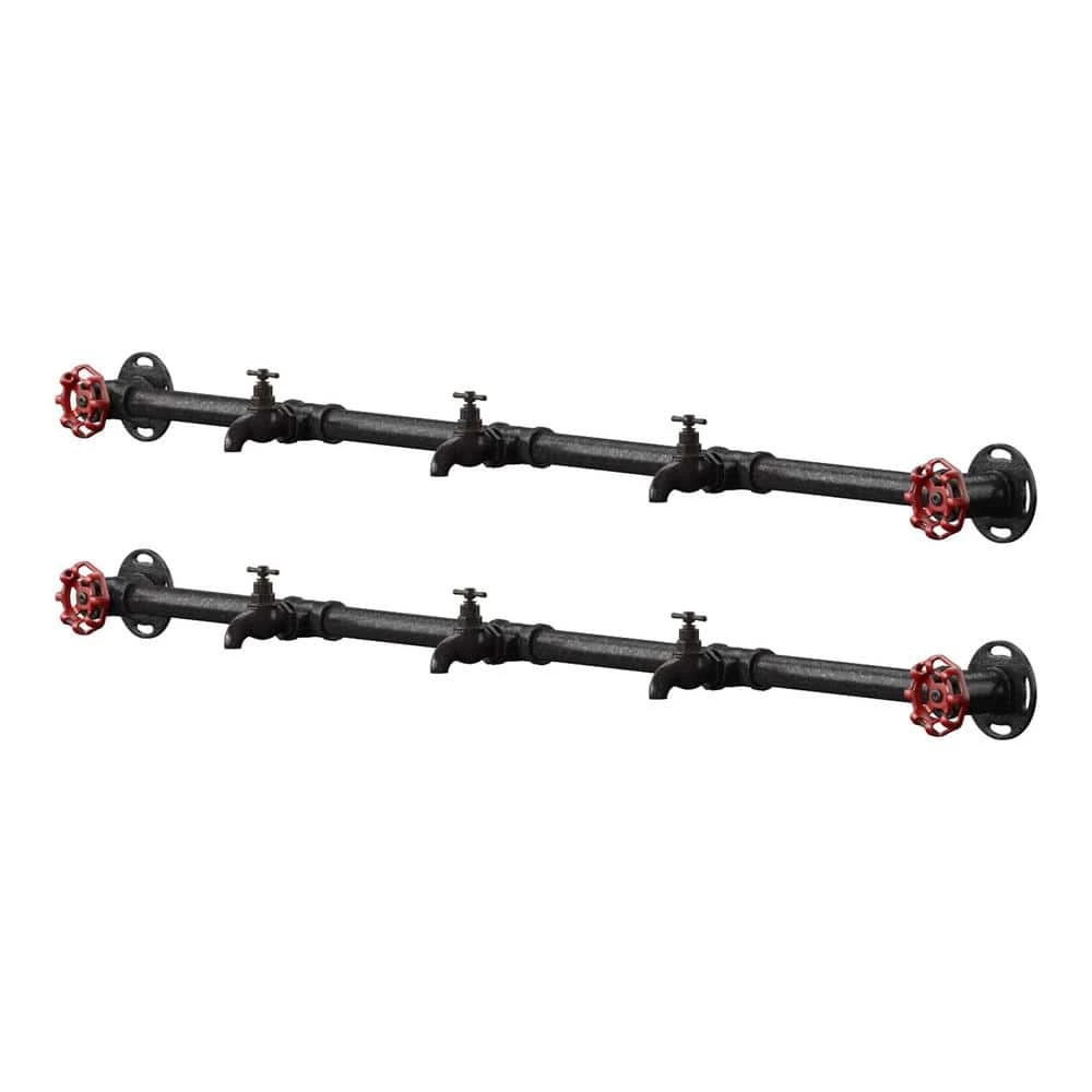 Put the finishing touches on a rustic entry or mudroom with this charming set of two industrial metal pipe and faucet coat racks. Each is wall mounted and features a realistic look and feel with faucets and knobs that easily host jackets, bags and accessories. Offering urban warehouse loft character to your home, each coat rack offers an authentic sand black finish with bright red spinner knobs.