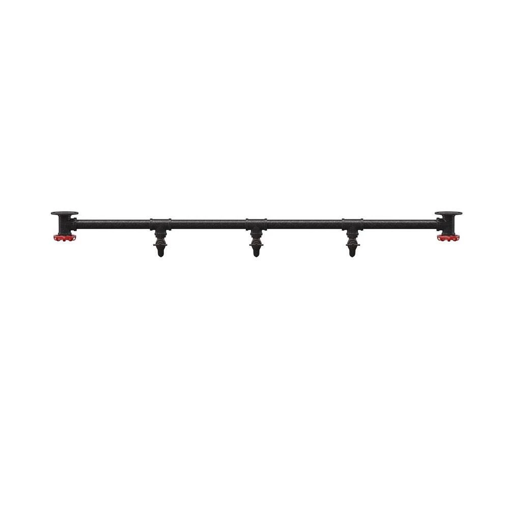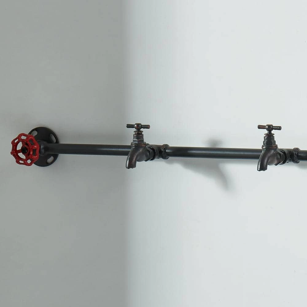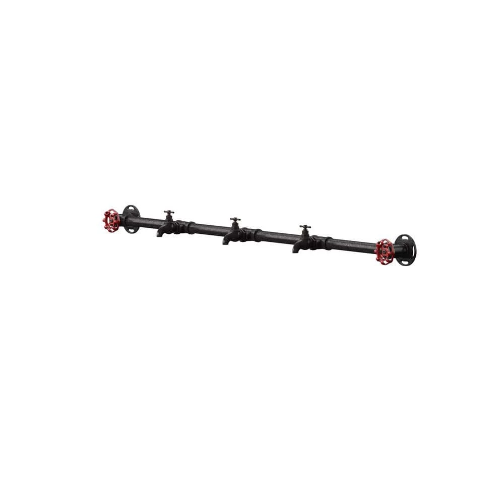 A Sand Black pure copper pipe wall-mounted coat hanger features three water faucet hooks. The red valves on either end also function as hooks. The spigots are perfect for a childrens fire station inspired bathroom!