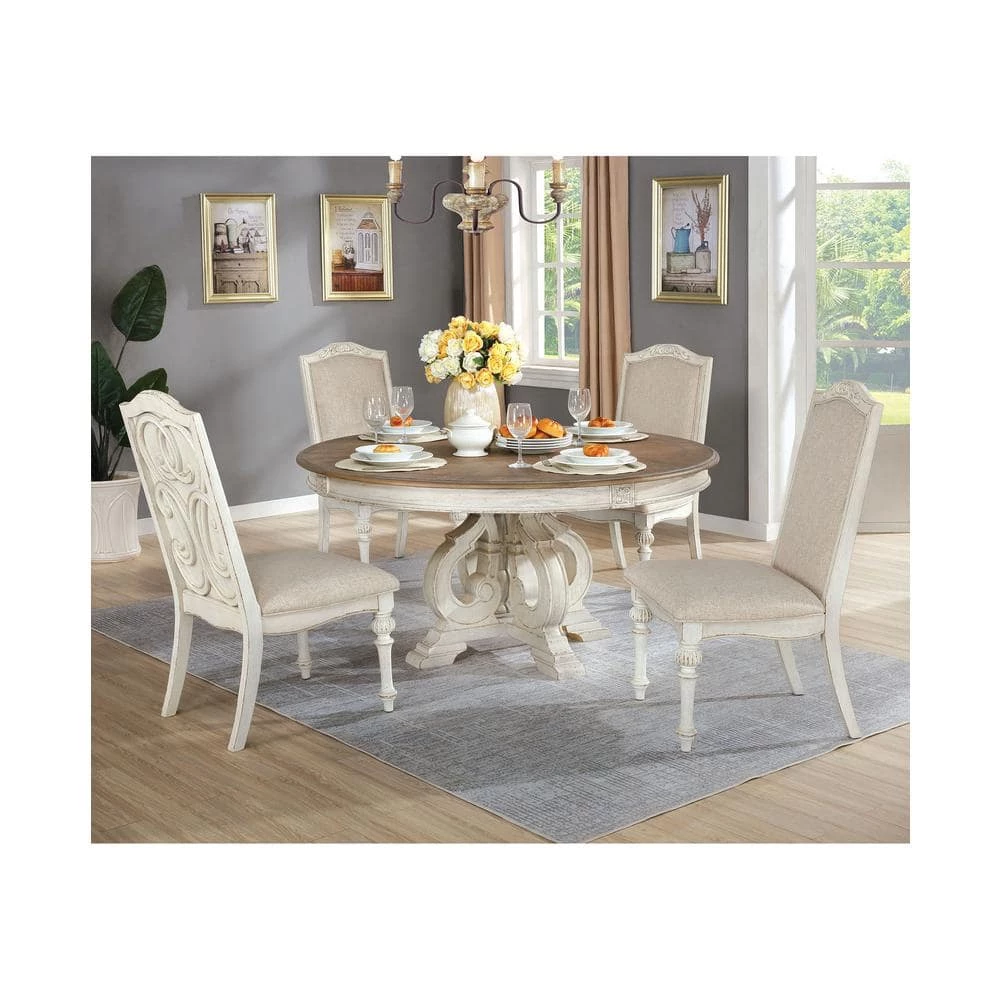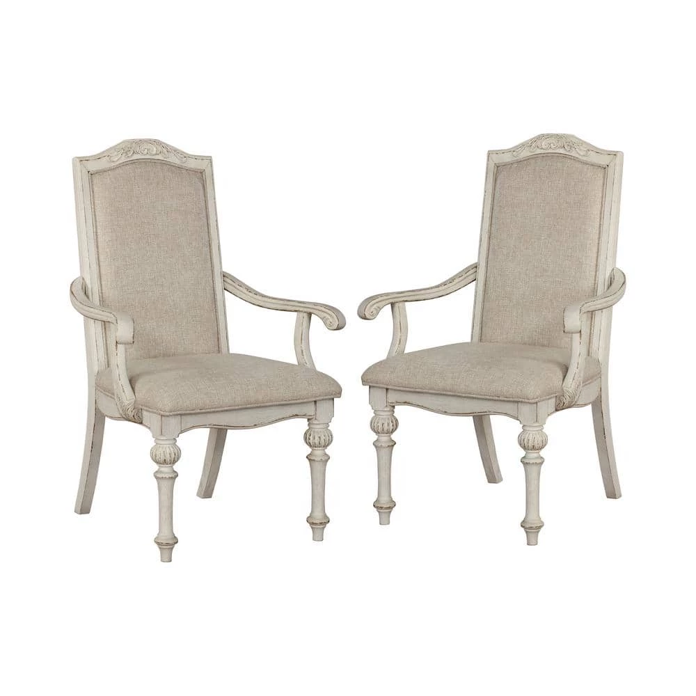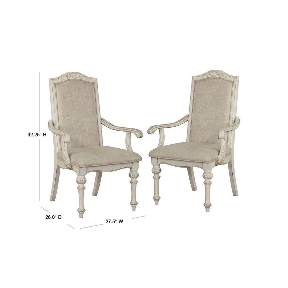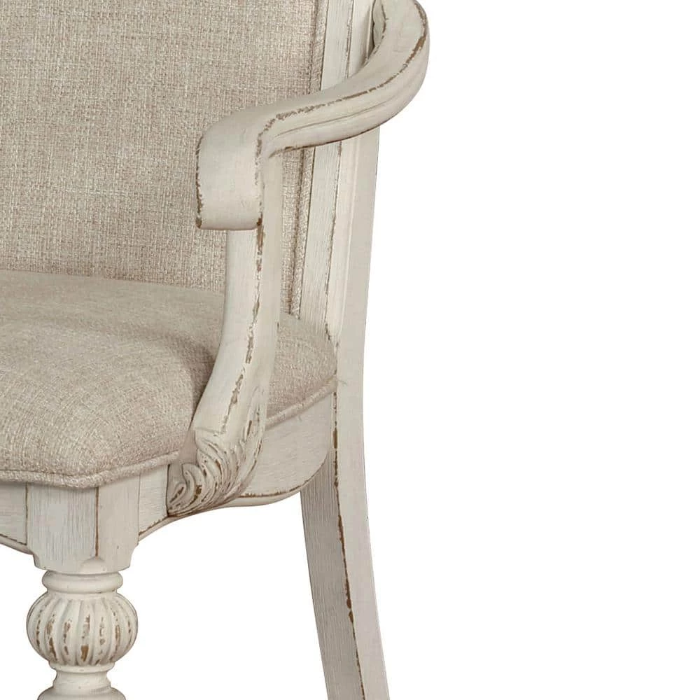 Elegant and charming, this armchair set form the Willadeene collection lends a cottage chic vibe with an antique white finish frame and legs. Place these armchairs alongside French country decor in a rustic style dining room to add some bright cheerfulness. Additionally, with a padded seat wrapped in a linen-like fabric and elegant, scrolled arms rests, you and your guests can relax and enjoy hours of good conversation while enjoying long meals.